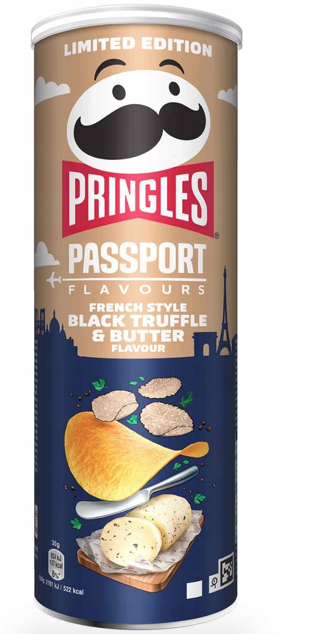 Картофельные чипсы Pringles, выпущенные ограниченным тиражом, со вкусом черного трюфеля и сливочного масла, вдохновленные французской кухней.