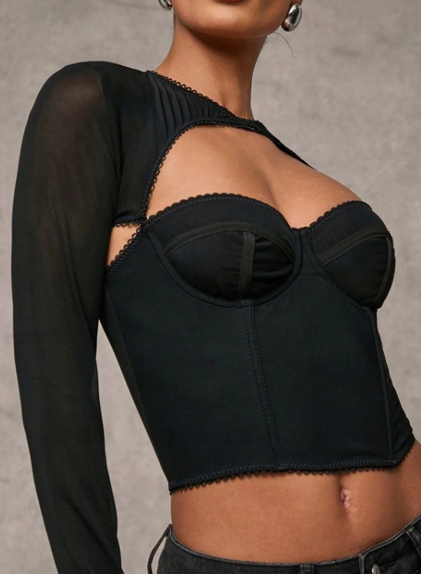 ЧЕРНЫЙ ВЕРХ С ВЫРЕЗОМ, ДЛИННЫЙ ПРОЗРАЧНЫЙ РУКАВ, ПОДХОДЯЩИЙ К SHEIN 34