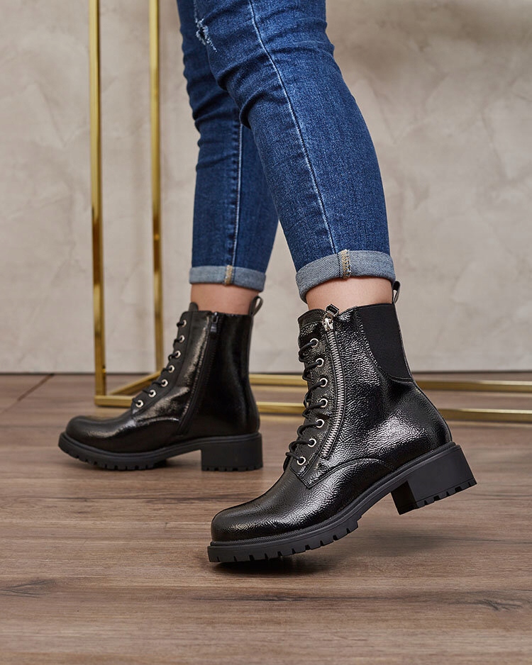 Женские рабочие ботинки — уникальная обувь, сочетающая в себе стиль и комфорт. Изготовлен из лакированной кожи, утеплен нежным мехом. Имеют шнуровку и молнию. Утолщенная подошва добавляет обуви комфорта.