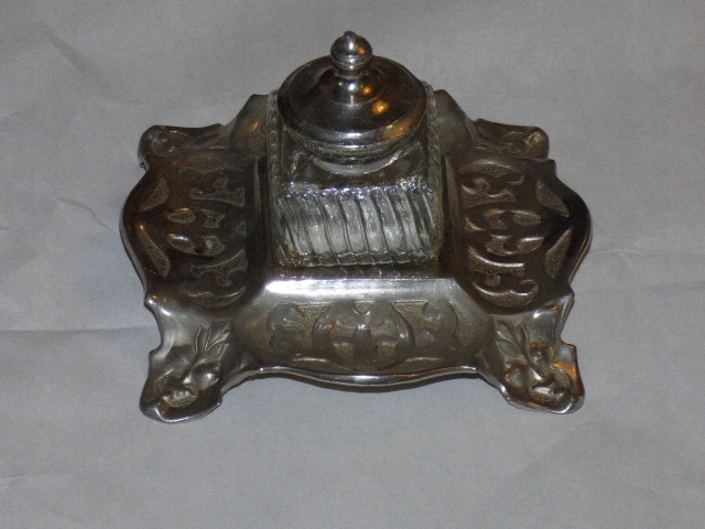 Позолоченная металлическая чернильница со стеклянным резервуаром, размеры 14 х 14 х 10 см, в очень хорошем состоянии