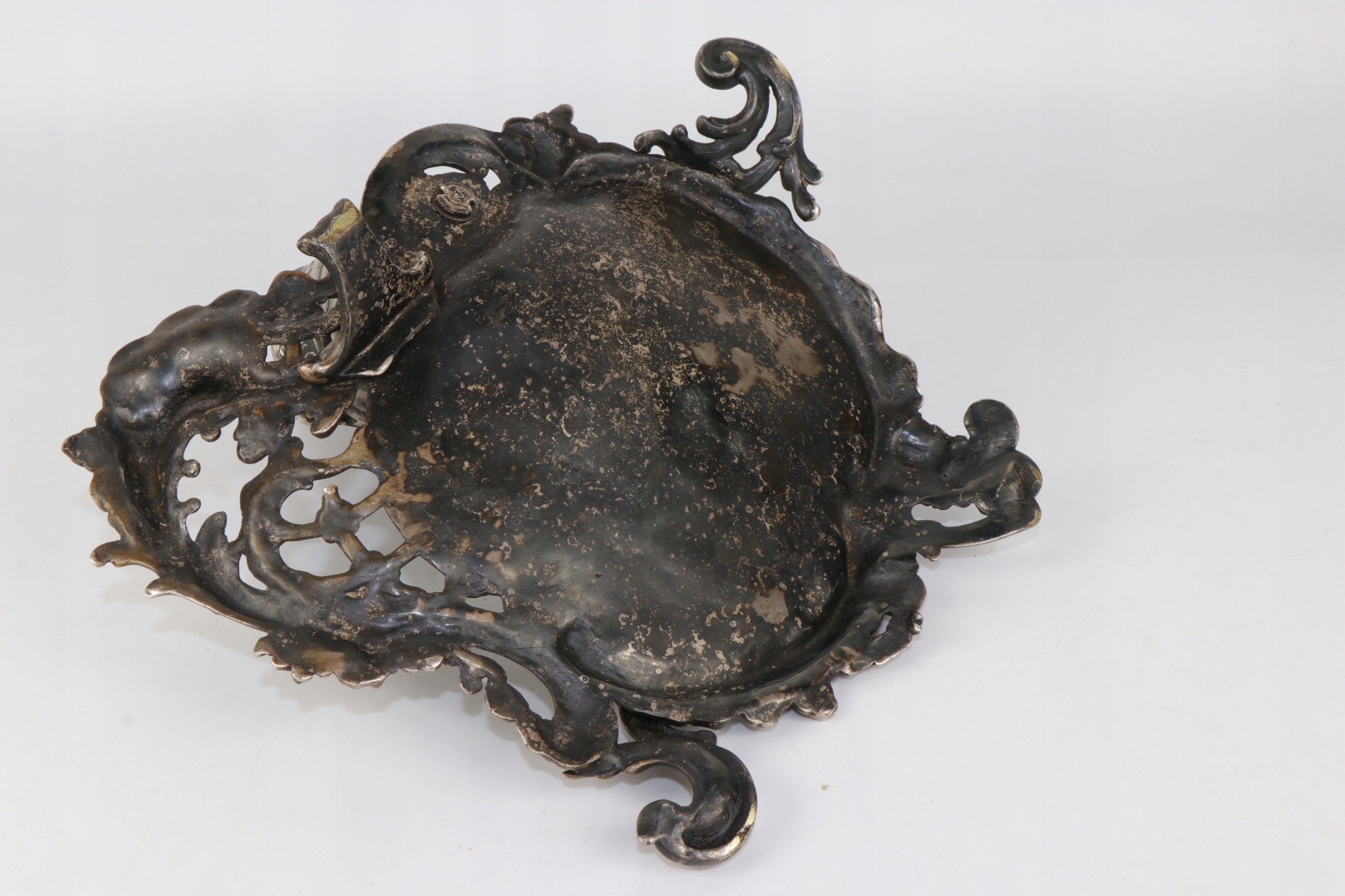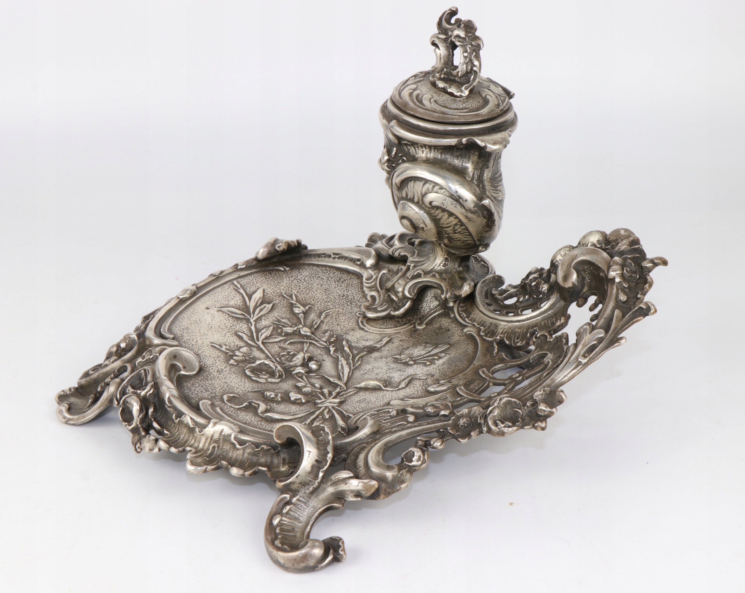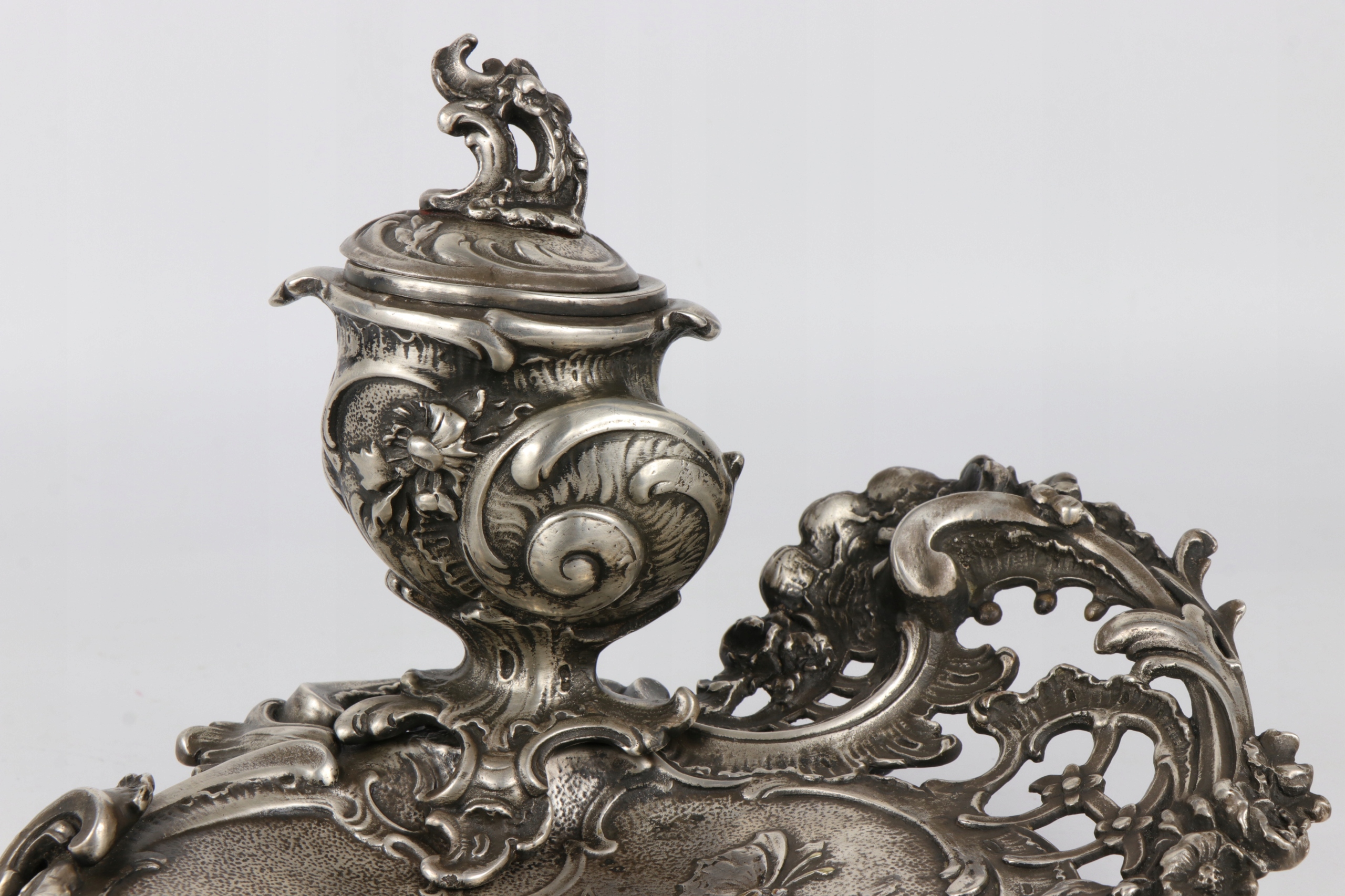 Интересная старинная чернильница в стиле неорококо, отлитая из посеребренной бронзы. Чернильница с асимметричным декором в легкой и элегантной эстетике. Центральную часть украшает крупная раковина, составляющая основу чернильницы. Очень декоративная чернильница, отлично подойдет для кабинета, офиса или как элемент украшения дома.