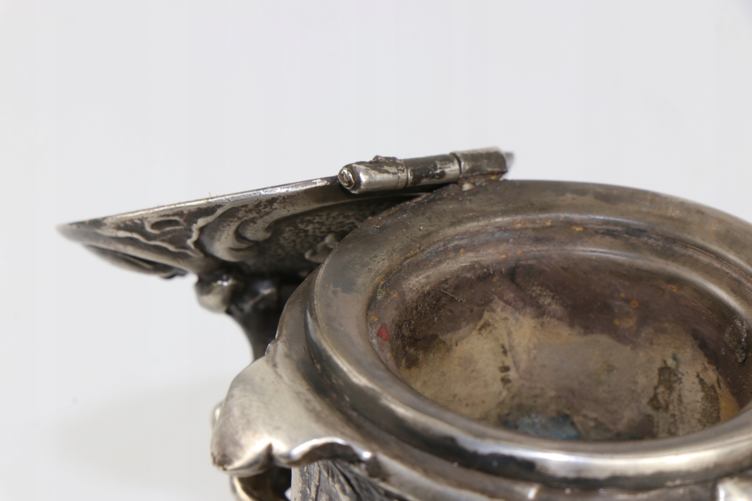 Как видно на фотографиях, чернильница в хорошем состоянии, виден один из креплений крышки чернильницы. Очень хорошо сохранились изделия из серебра, потертости практически заметны только на нижней части ножек чернильницы.