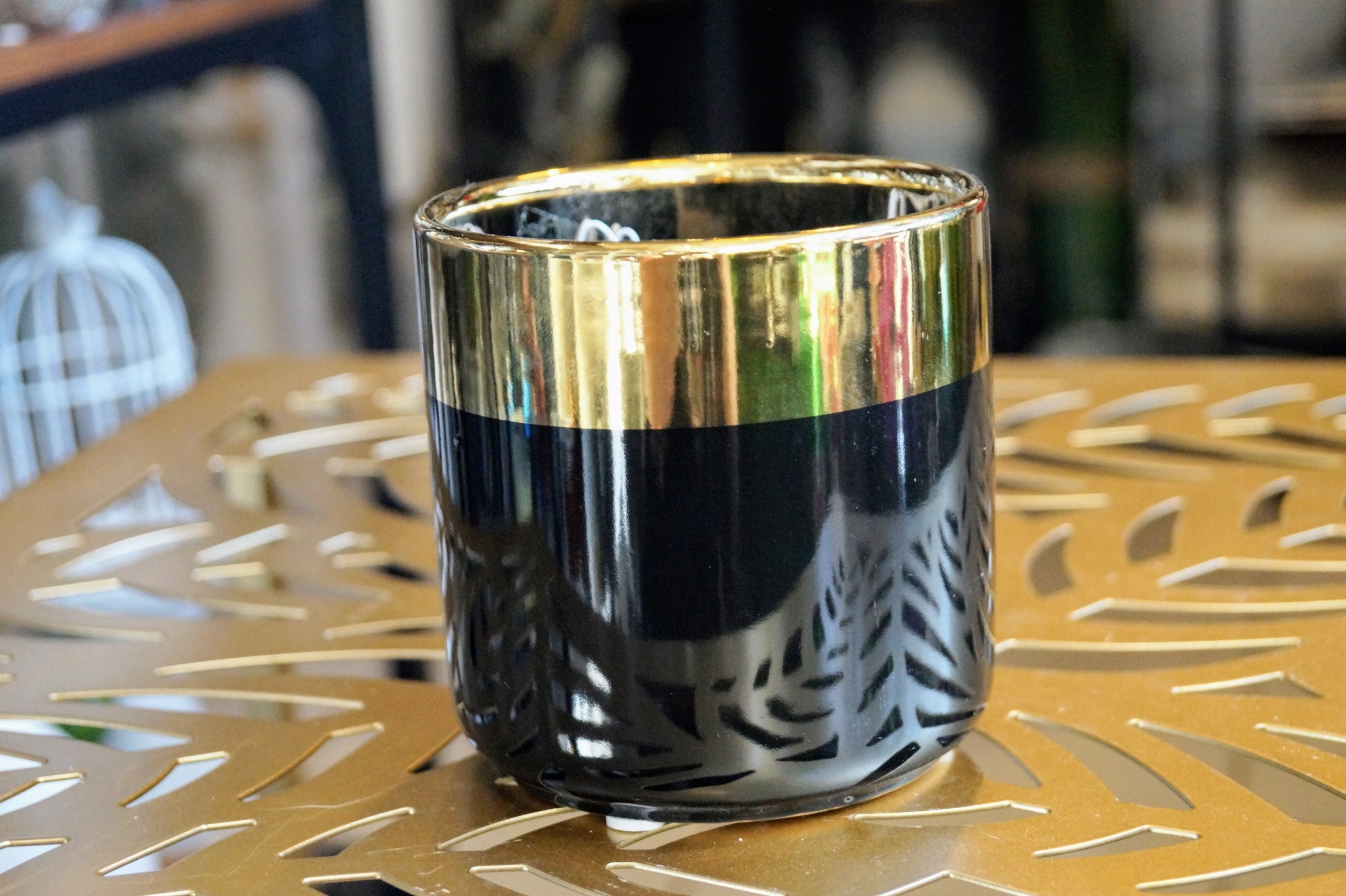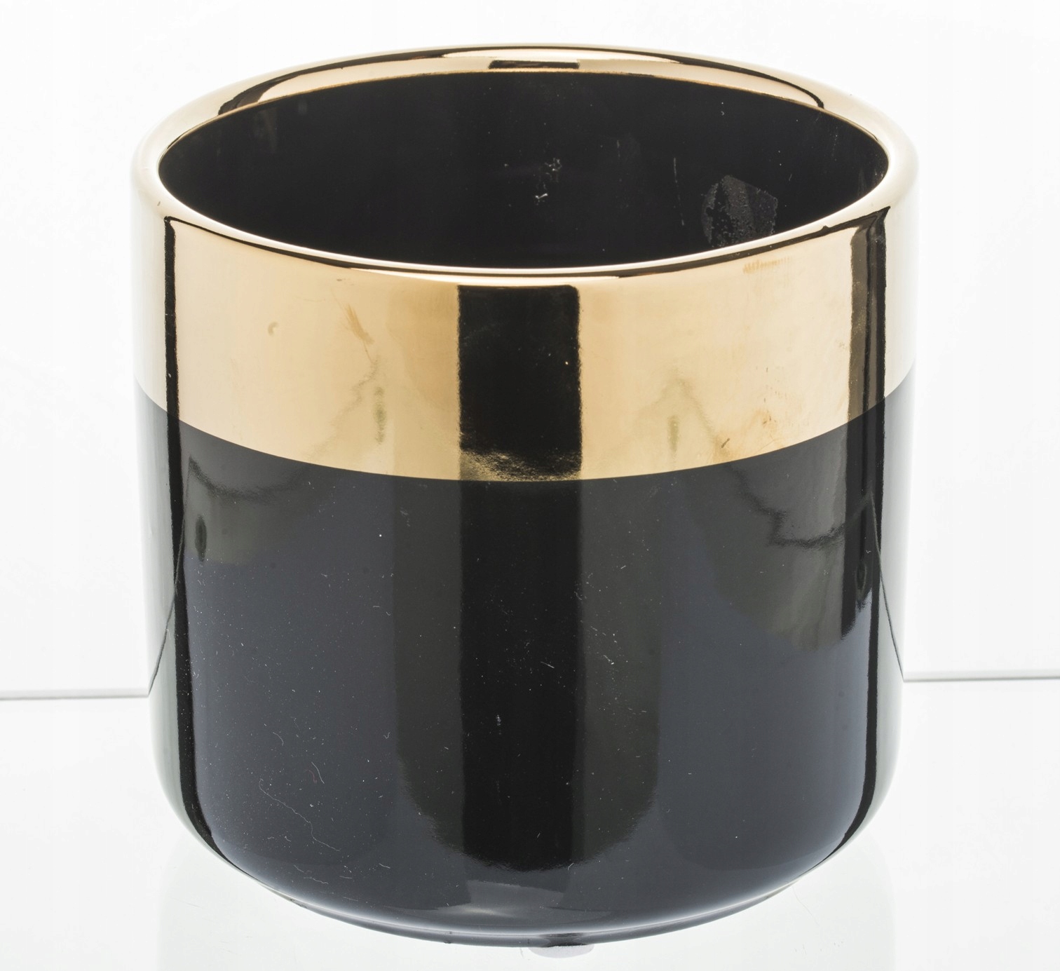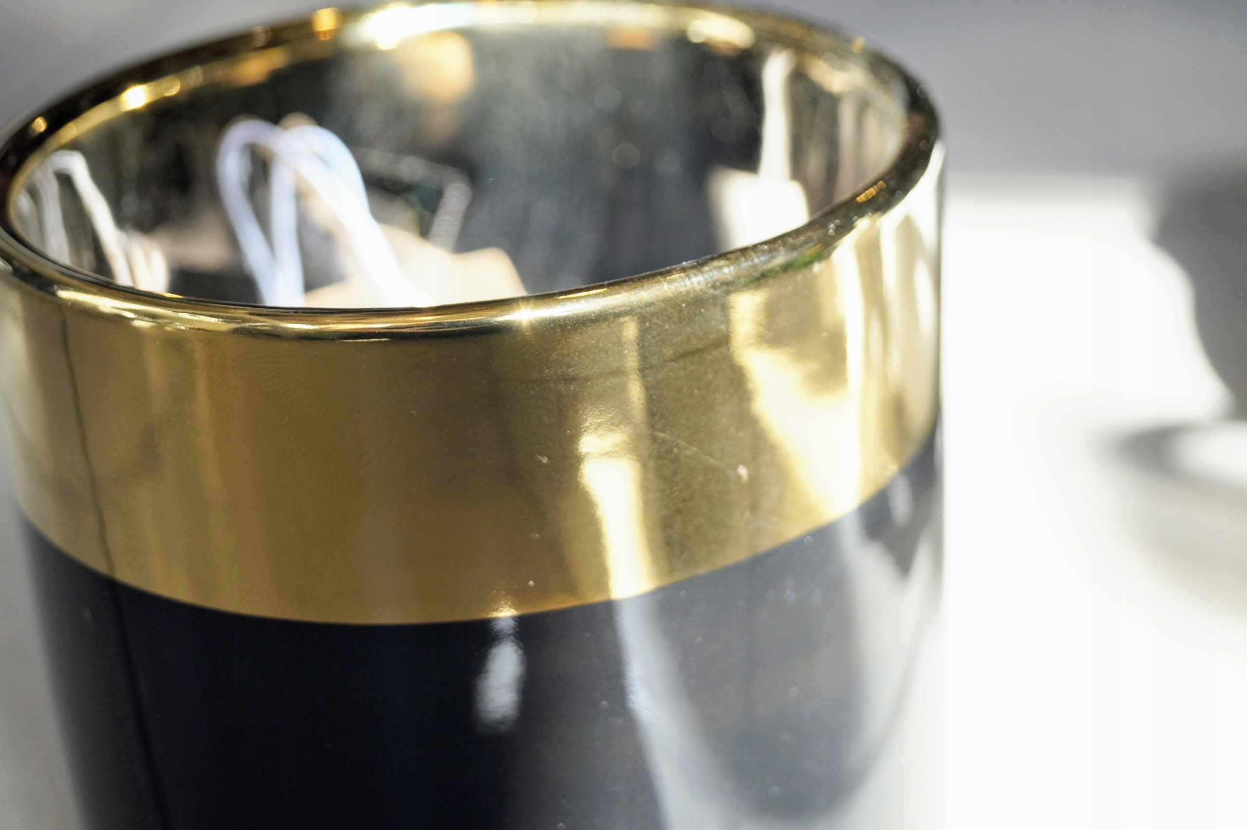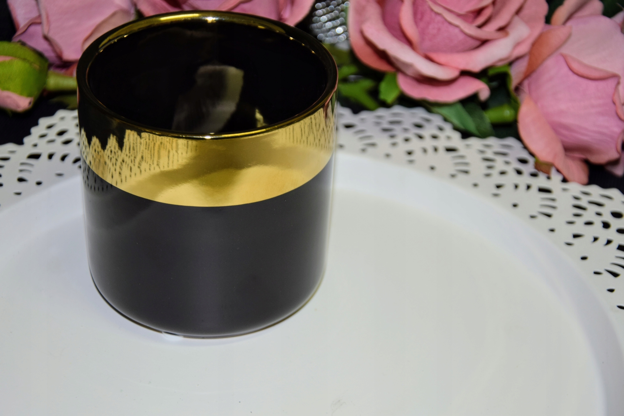 блестящий черный крышка, украшенный золотым краем, сделанный из керамики.