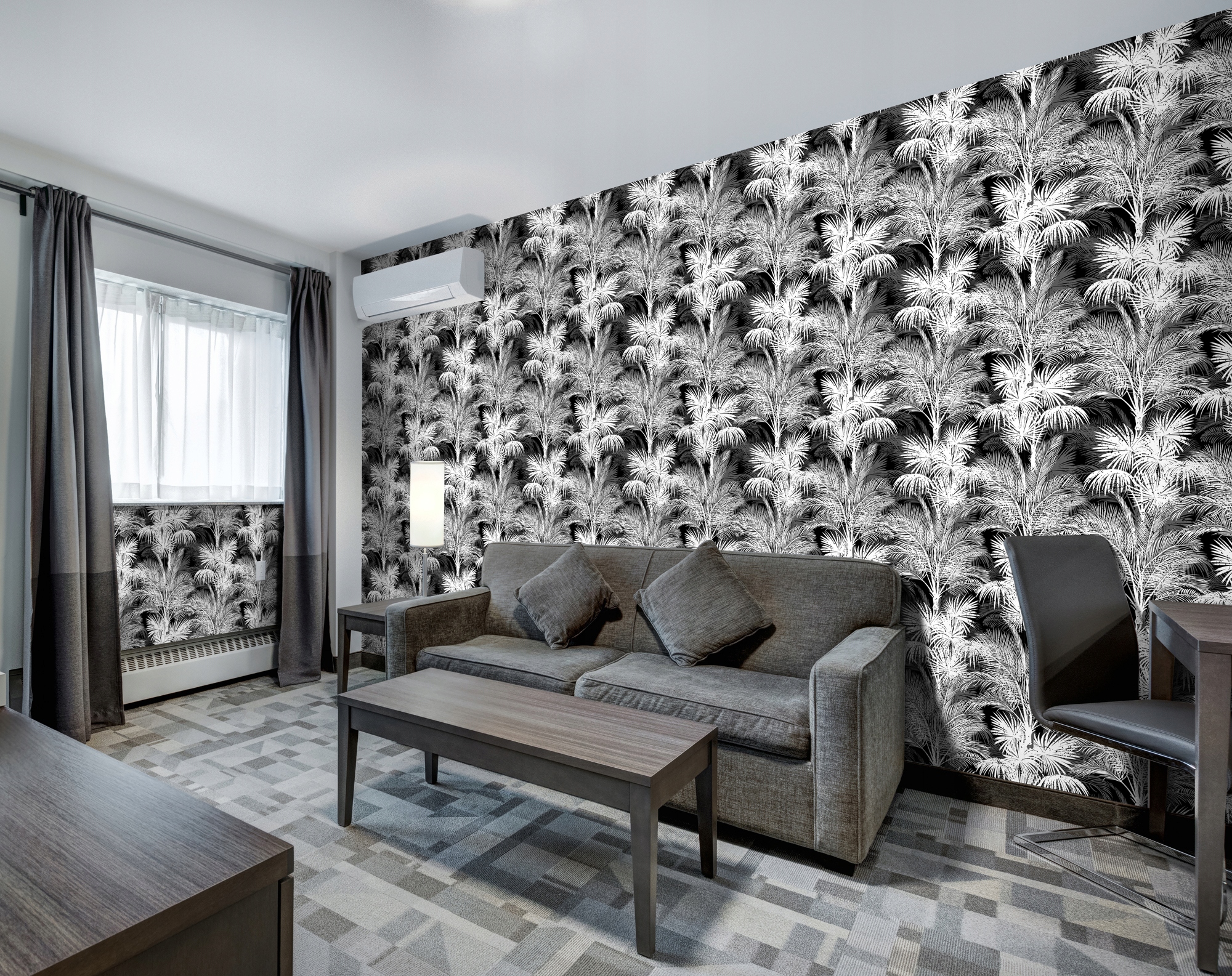 Тропический узор с деревьями и пальмовыми листьями в элегантной черно-белой графической версии. Современный универсальный дизайн подойдет практически к любому стилю и типу помещения. Он станет отличным, эффектным украшением как гостиной, спальни, так и уникальной ванной комнаты. Мотив может быть частью и дополнять интерьеры в современном, эклектичном, бохо, индустриальном, винтажном и многих других стилях.