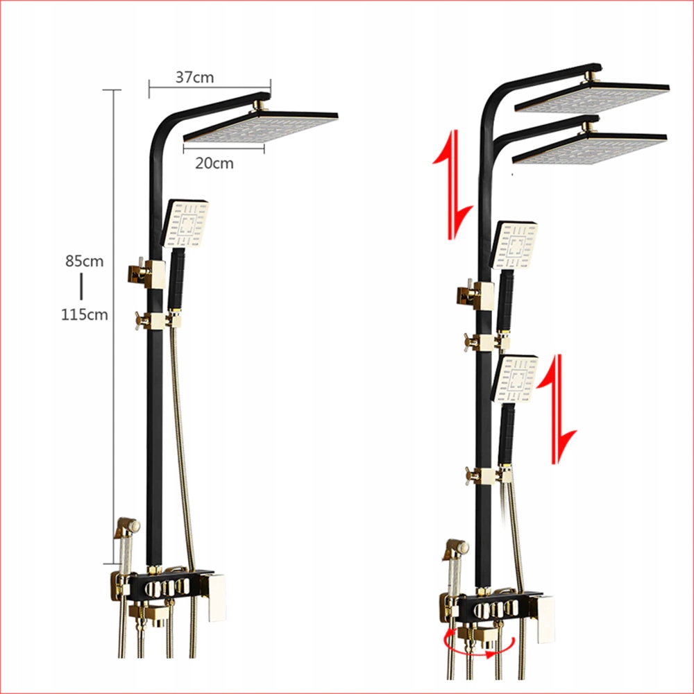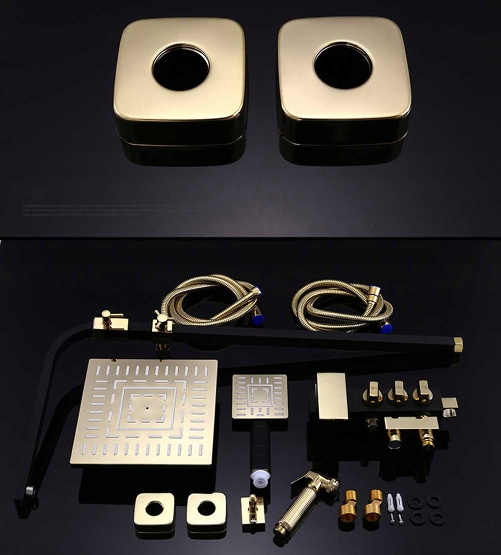 Золото-черный душевой набор со смесителем для ванной комнаты оснащен тропическим душем, расположенным над головой пользователя. Вода, вытекающая из квадратного тропического душа, принимает форму дождя, приятно опрыскивая вашу голову и тело. Он создает впечатление массажа и позволяет испытать удивительные ощущения релаксации.