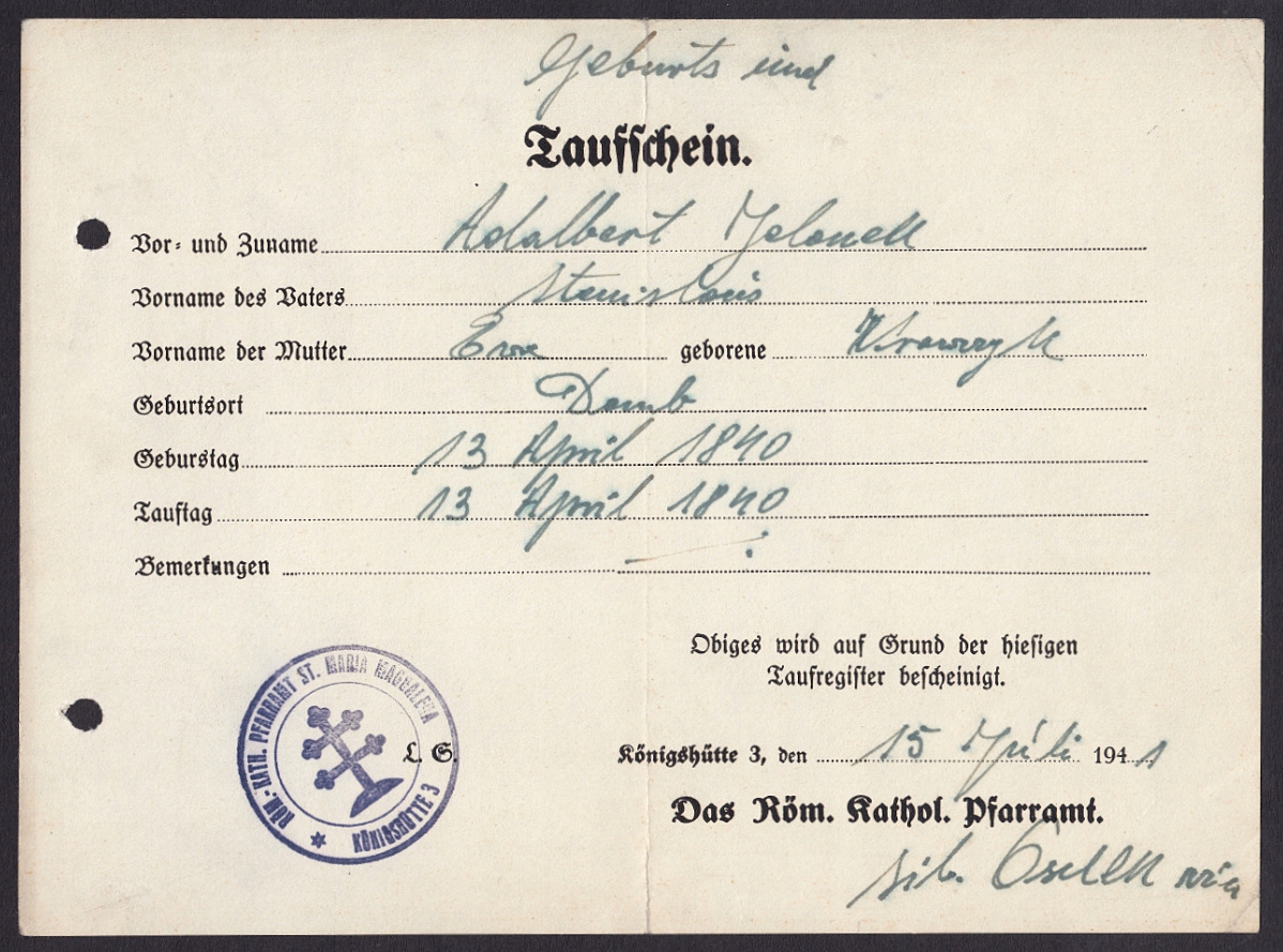 'CHORZÓW STARY - PARAFIA ŚW. MARII MAGDALENY - ŚWIADECTWO URODZENIA 1941