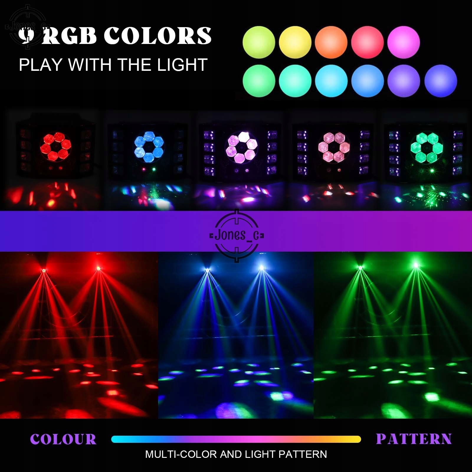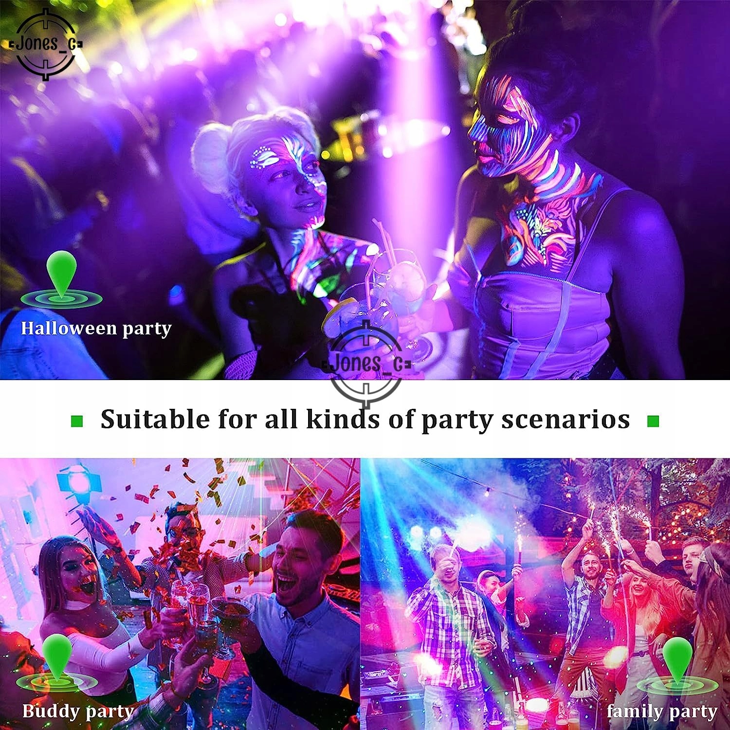 УФ и специальный стробоскопический эффект: УФ и специальный стробоскопический эффект состоят из 8 белых УФ-светодиодов 2 в 1, мигающего света и специального фиолетового светового эффекта, который сделает вашу сцену или вечеринки более неожиданными, особенно подходит для вечеринки в честь Хэллоуина со сценическим освещением .