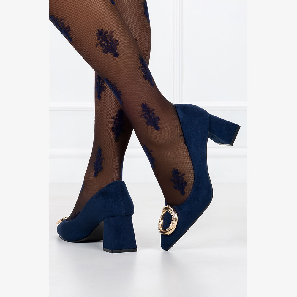 Темно-синие женские туфли на каблуке, модель D23WX1-N, изготовлены из высококачественной экологической замши, что гарантирует отличное качество, комфорт и посадку по ноге. Насосы имеют кожаную вставку, обеспечивающую достаточную циркуляцию воздуха. Темно-синие туфли — это элегантная классическая обувь, которая популярна во многих случаях, а золотое украшение придает ей утонченную и стильную нотку. Стразы, размещенные на золотом украшении, придают туфлям неповторимый шарм и привлекают внимание. Туфли с таким декором – отличный выбор как для официального, так и для неформального случая. Их можно носить на работу, деловую встречу, вечеринку или вечерний выход в свет. Они сочетаются с платьями, юбками и брюками, добавляя стильный акцент разным типам одежды. Эта модель имеет удобный и устойчивый каблук, гарантирующий комфорт вашим ногам. В магазине Casu вы найдете множество вариантов этой выкройки.
