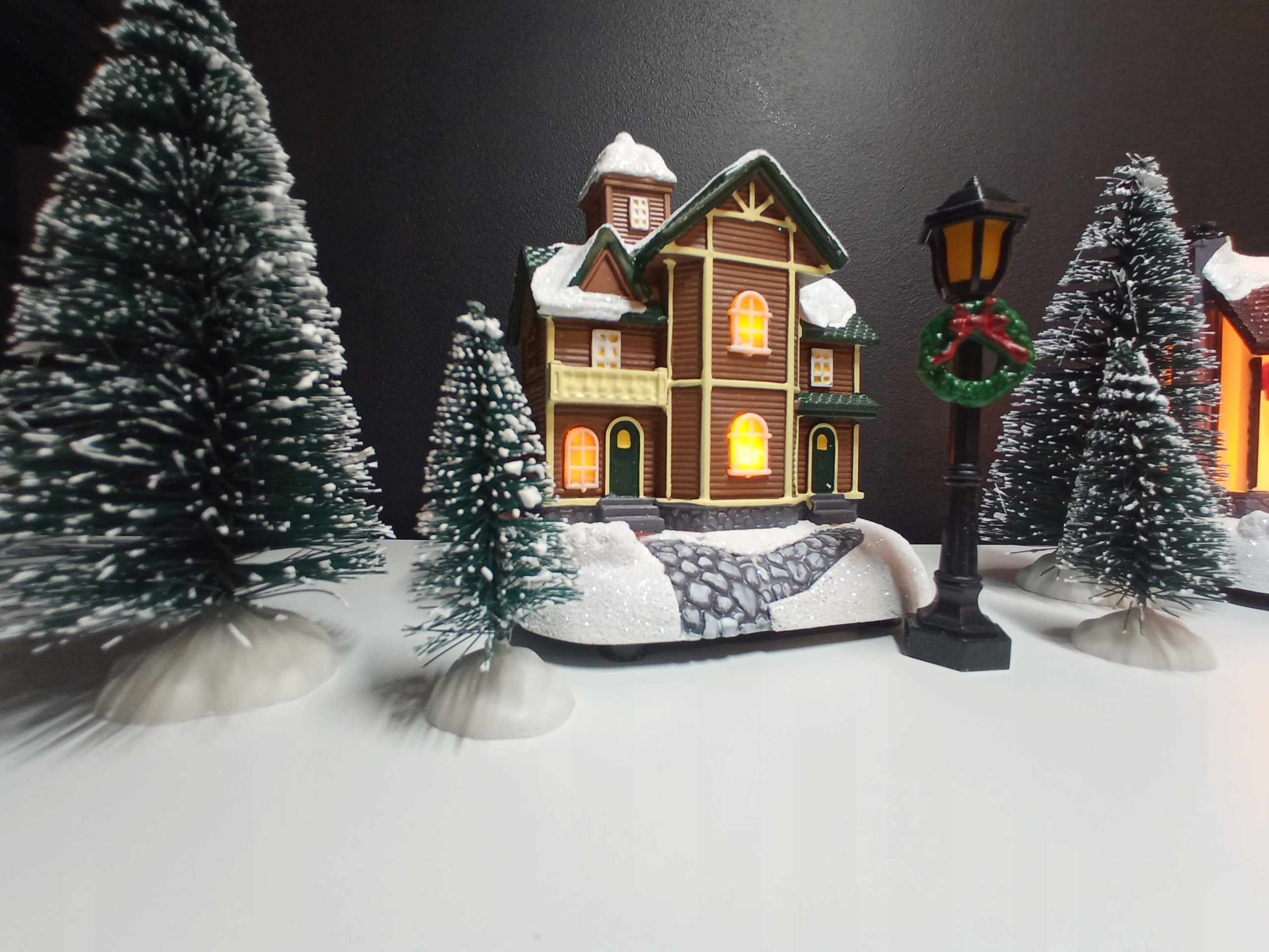 - 3 высоких (около 10 см) заснеженных здания. Елки