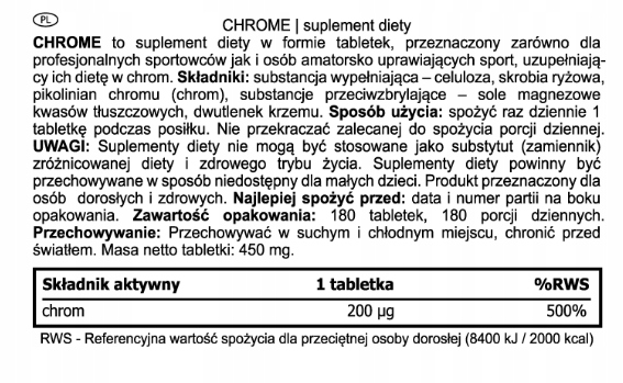 Хром – это элемент, который трудно получить из рациона в соответствующих количествах, следовательно, особенно люди, ведущие интенсивный образ жизни, часто страдают от его дефицита. Препарат является ответом на повышенную потребность в хроме, который является важным элементом контроля уровня сахара в крови в нашем организме, подавляет аппетит и поддерживает потерю жировая ткань.