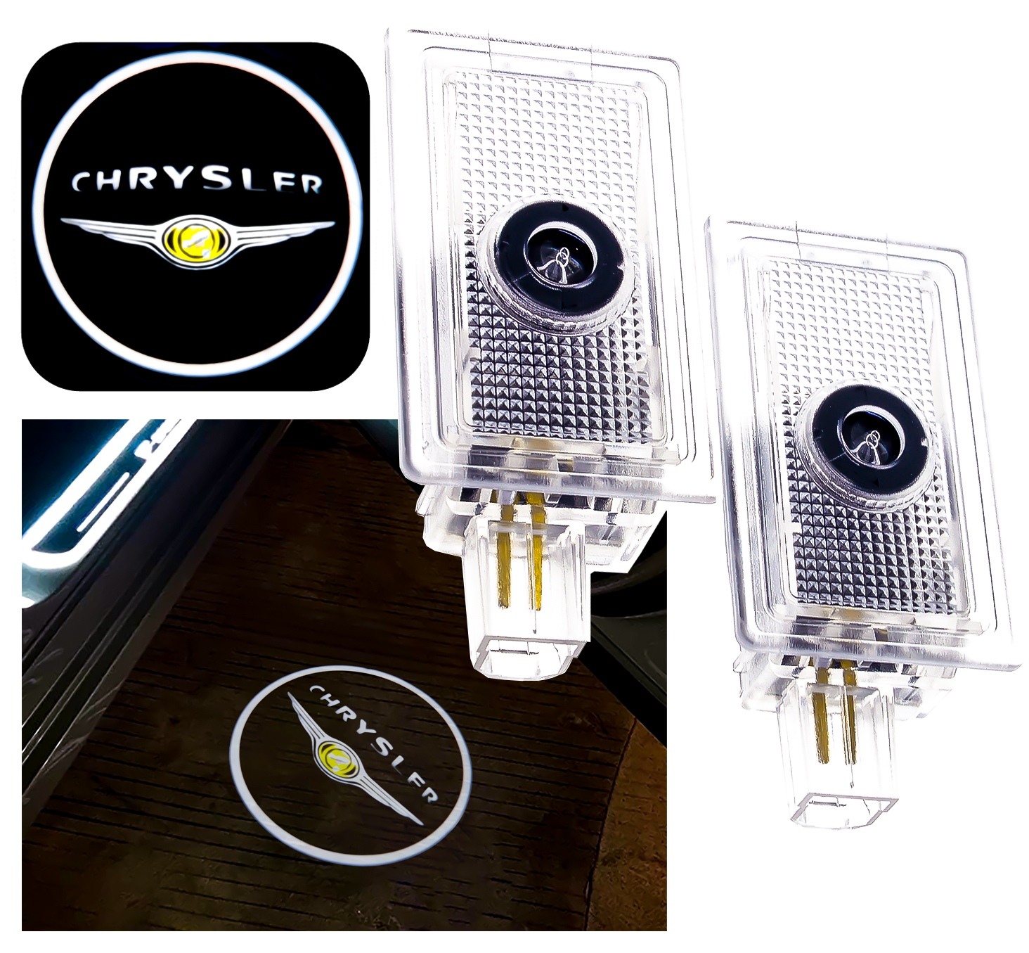 Светодиодные проекторы с логотипом Chrysler — идеальный способ подчеркнуть характер вашего автомобиля. Благодаря HD-качестве голограмма логотипа Chrysler, проецируемая на землю при каждом открытии двери, добавляет модели 300/300C престижа и элегантности.