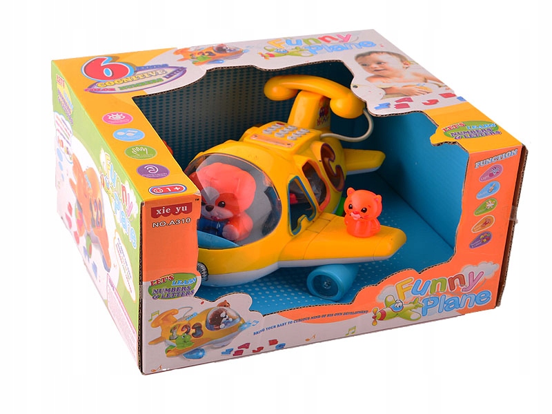 Когда самолет касается препятствия на своем пути, поворачивается вбок или поворачивается назад, выигрывая забавные мелодии. Электронный телефон с подвижными наушниками, который издает звуки, находится на корпусе.