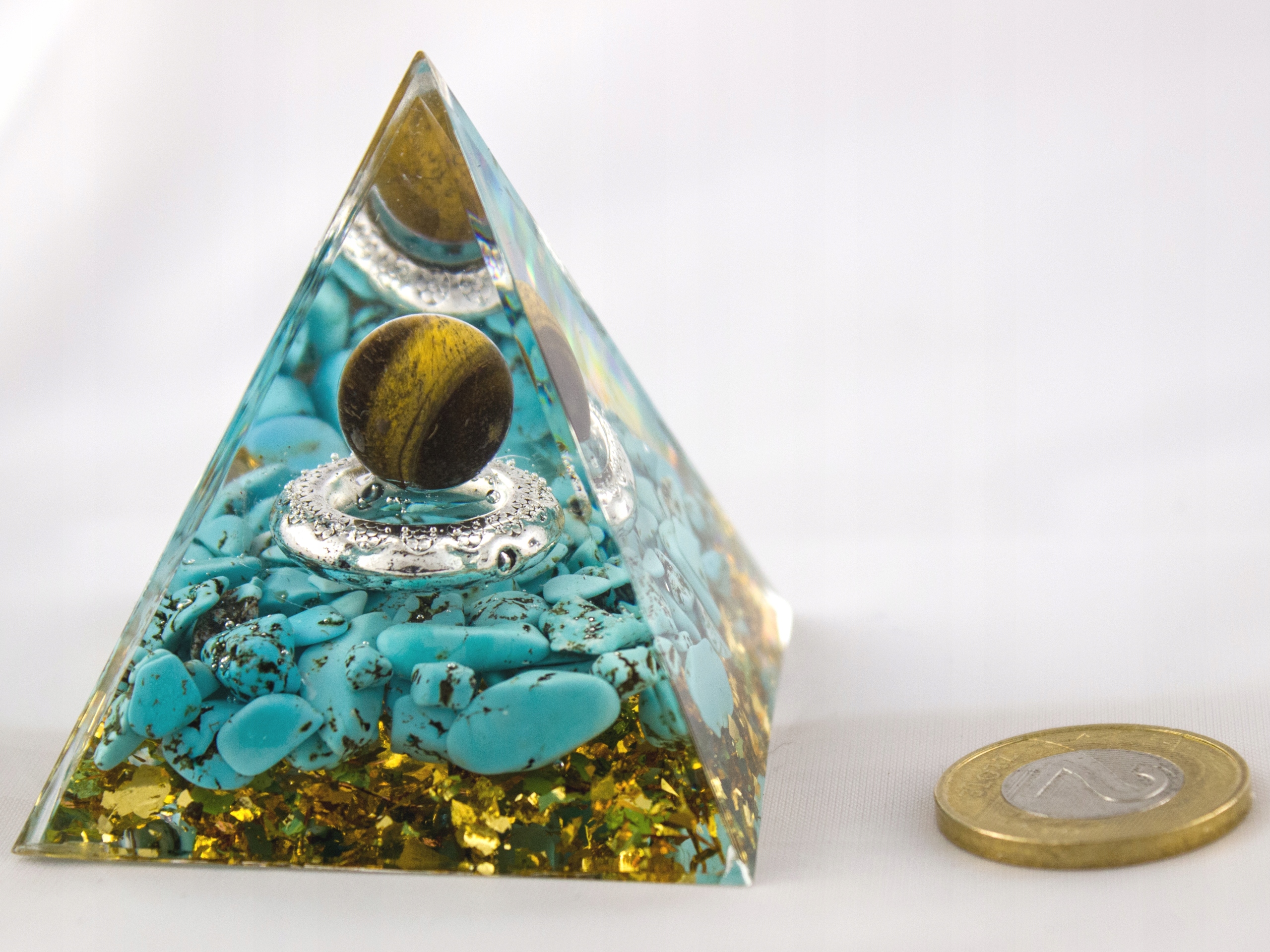 Красивая оргонитовая пирамидка - чудесная Бирюза, блестящая золотая фольга и шарик Тигровый Глаз, красивое украшение из натуральной смолы, имеющее необычный, приятный для глаз внешний вид, излучающее энергию, дарующую хорошее здоровье, нейтрализующую плохую энергетику, добавляющую душевное спокойствие и хорошее настроение.< /h2>