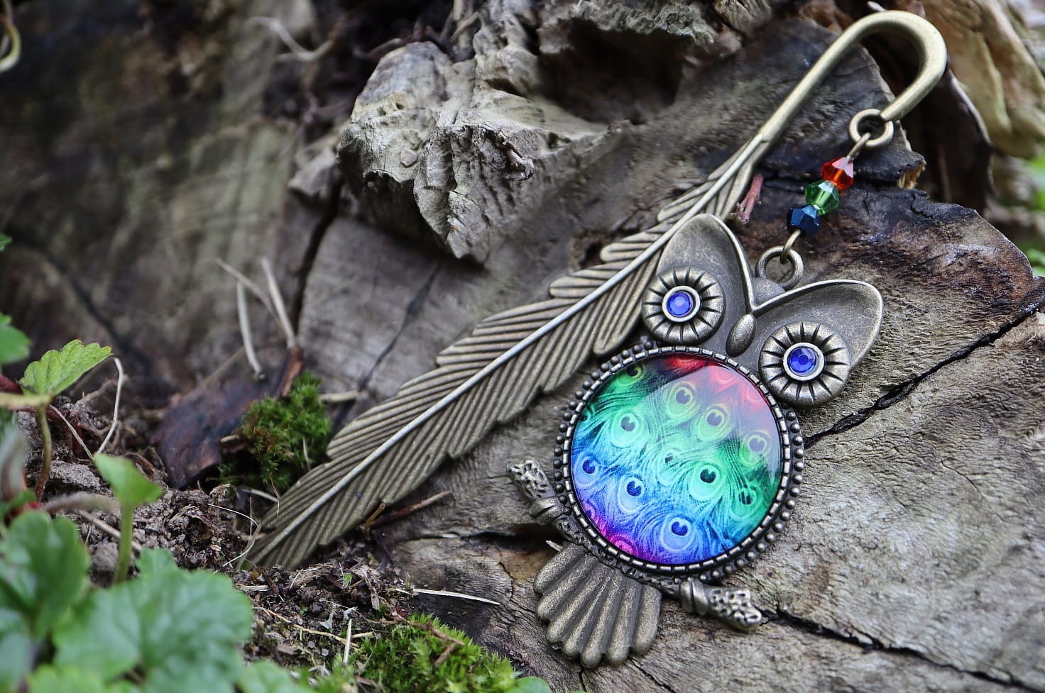 Закладка, календарь, блокнот с красивой, большой, красочной совой и кристаллами.