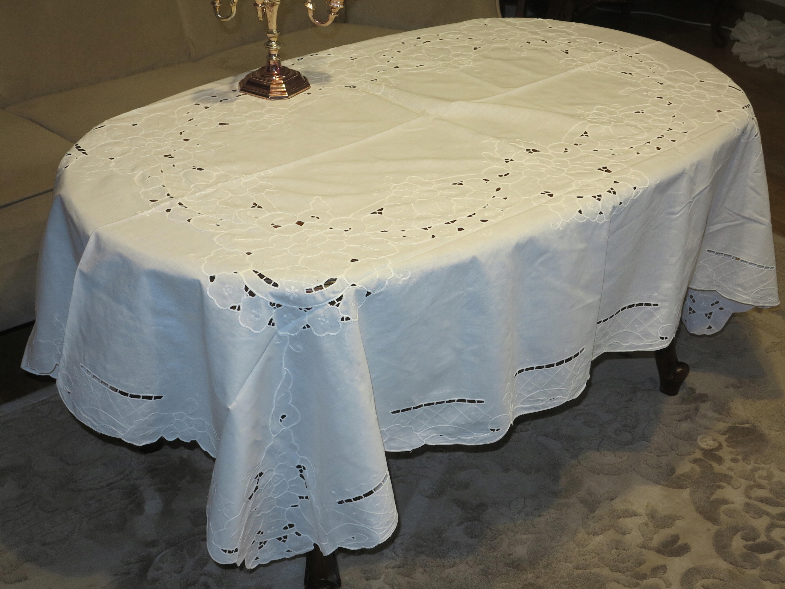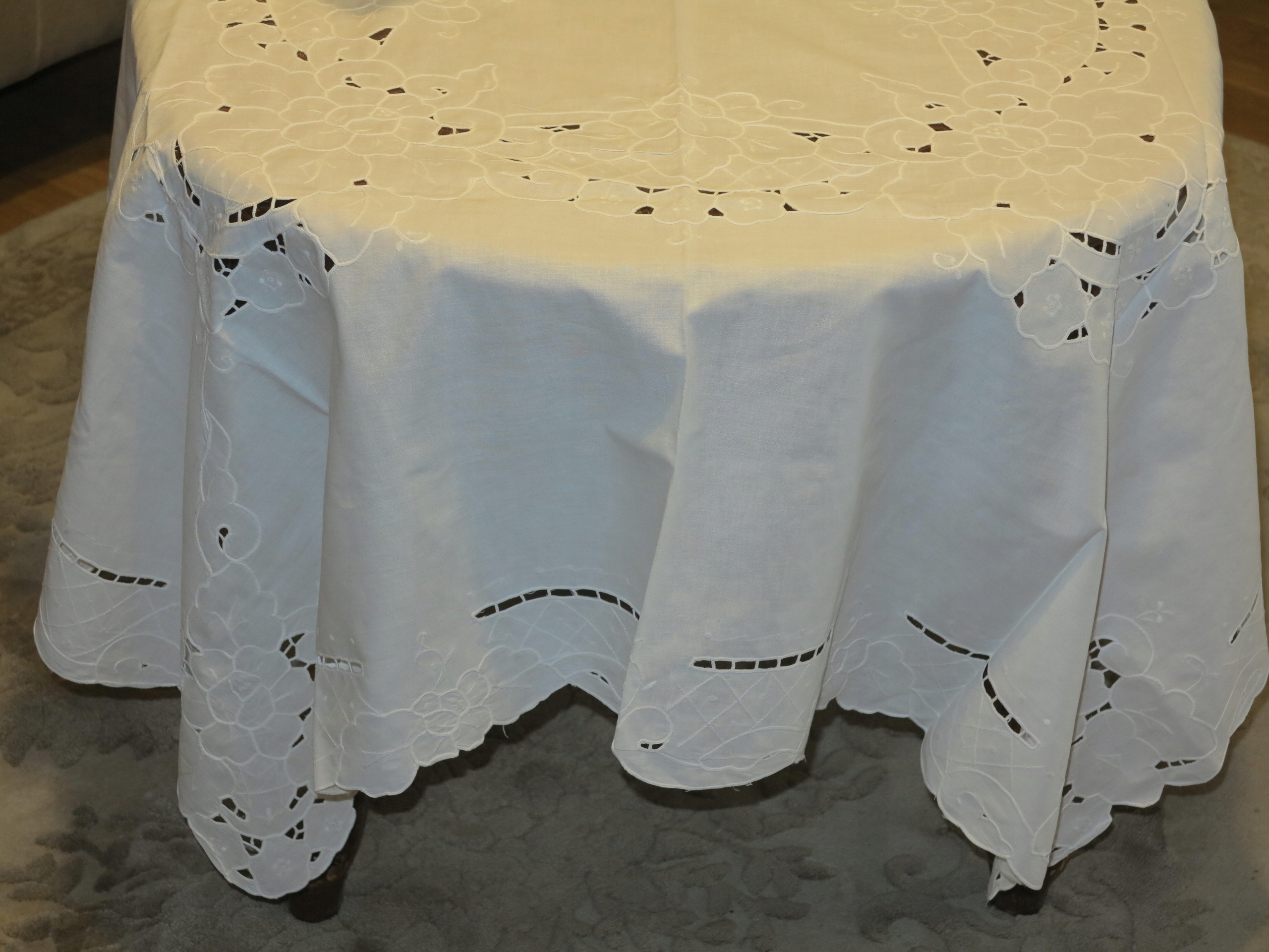 КРАСИВЫЙ БЕЛЫЙ ЛЬНЯНОЙ СКАТЕРЬ, С БОГАТОЙ МАШИННОЙ РИШЕЛЬЕ ВЫШИВКОЙ И АЖУРОМ.