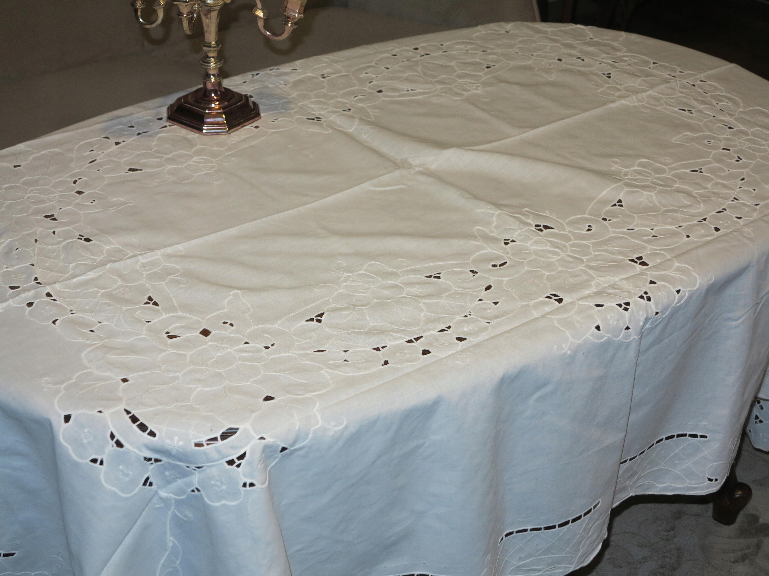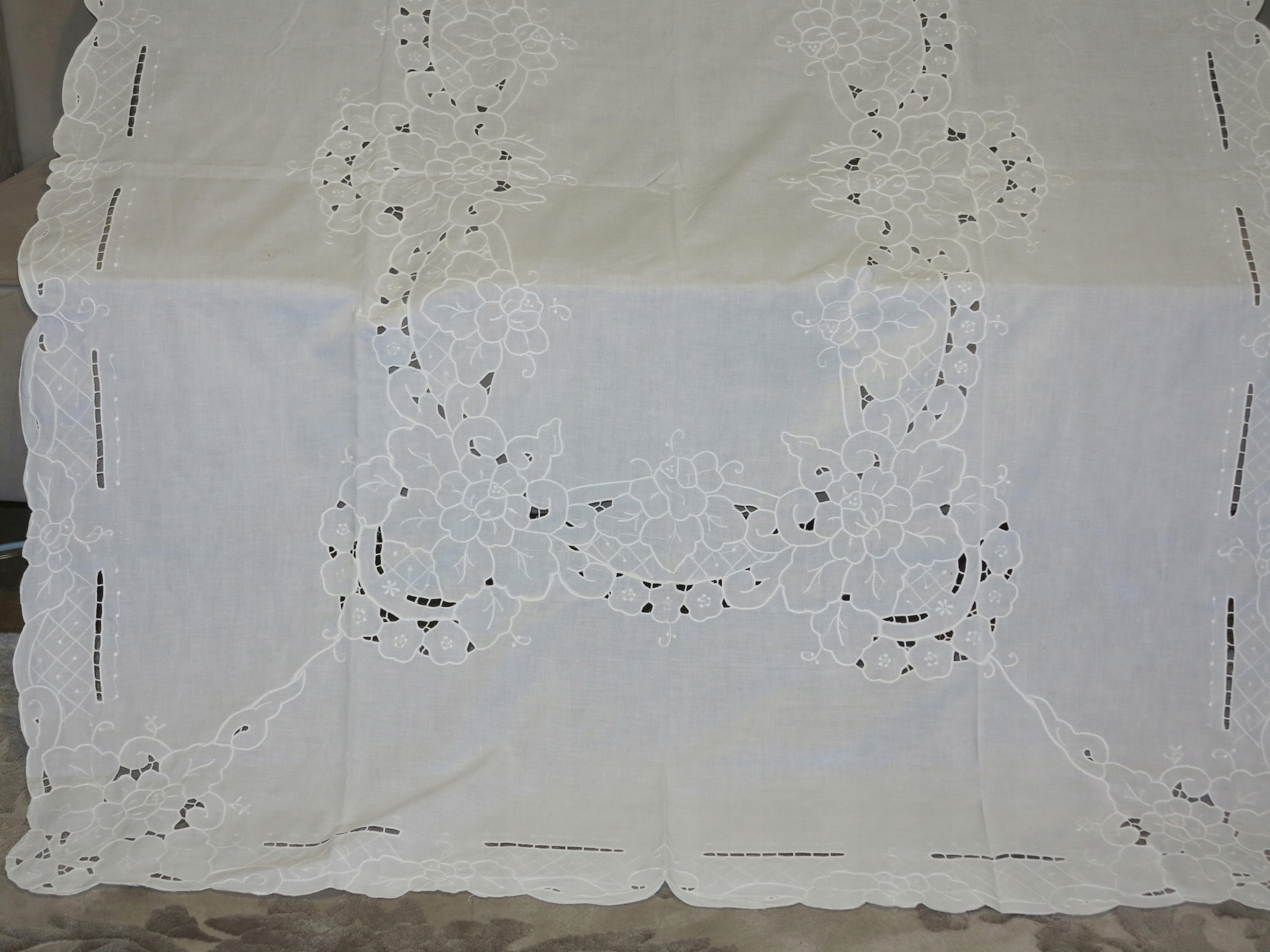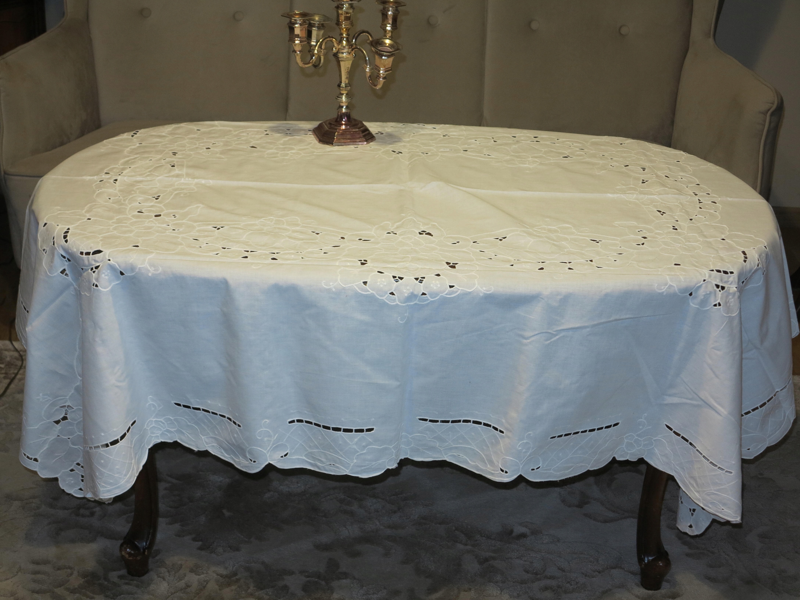 ЧУДЕСНЫЙ БЕЛЫЙ ЛЬНЯНОЙ СКАТЕРЬ С ВЫШИВКОЙ РИШЕЛЬЕ И АЖУРОМ КАК НОВЫЙ 177/128