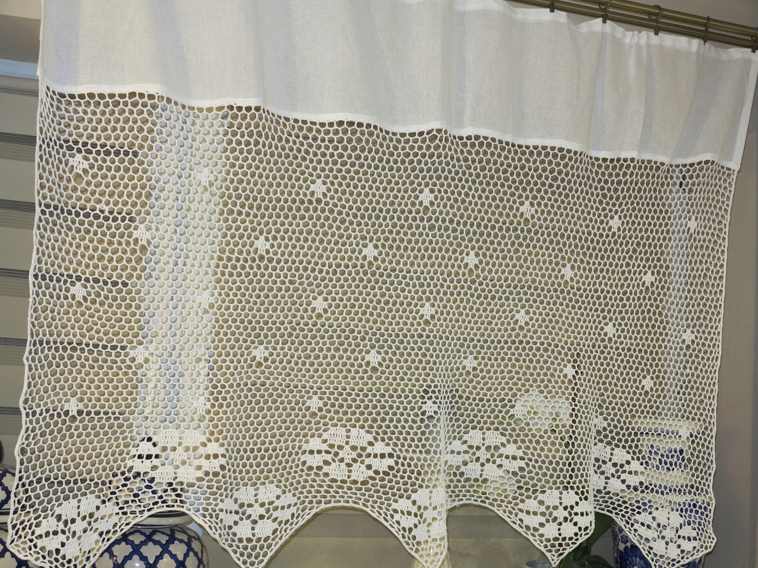 Предмет аукциона Очень декоративная штора или занавеска с низ, связанный крючком. сверху более тонкая хлопко-синтетическая ткань. Его размеры: ширина: 175см, высота: 111см. Штора б/у, в очень хорошем состоянии и качестве. Рекомендую.