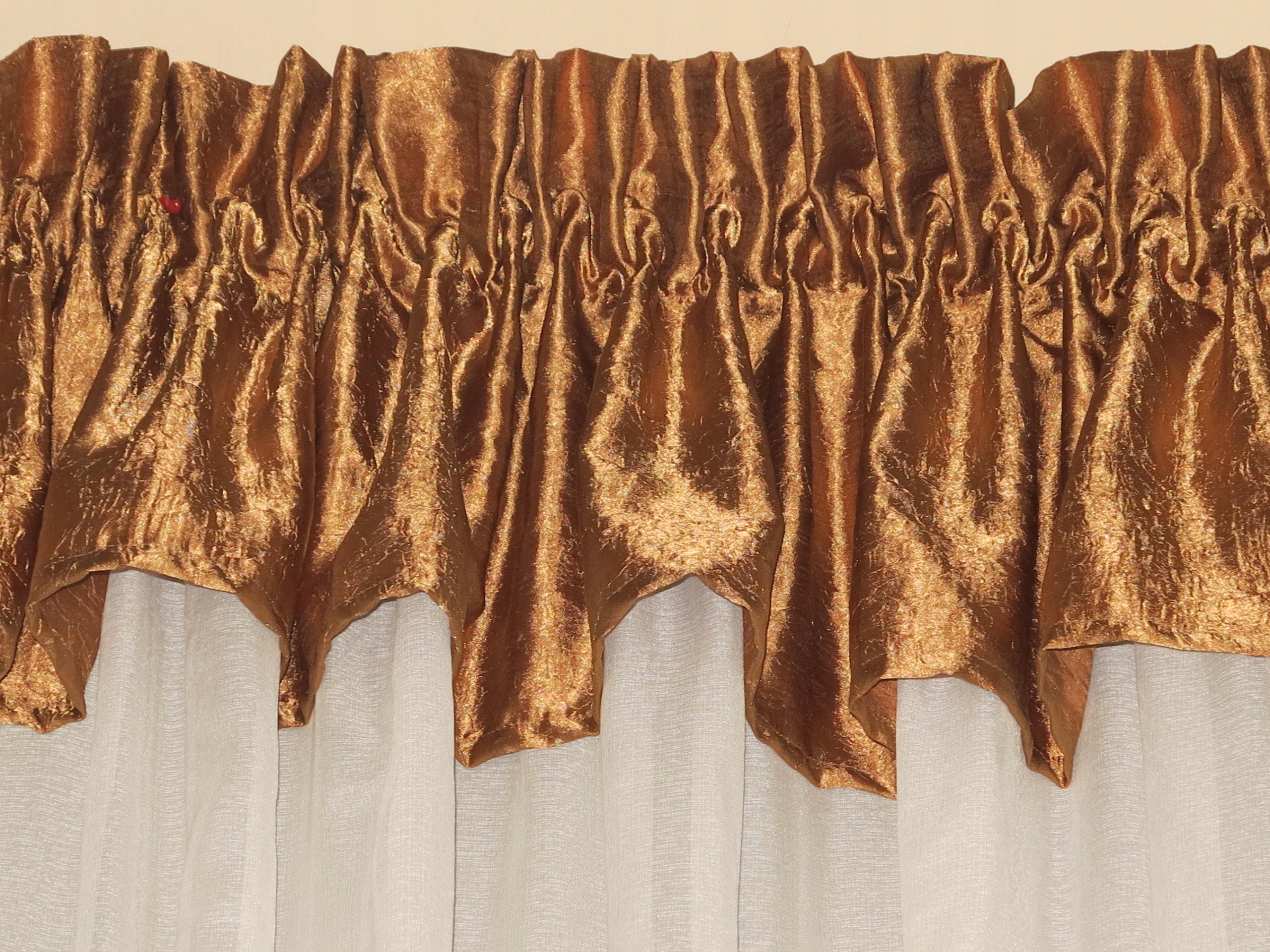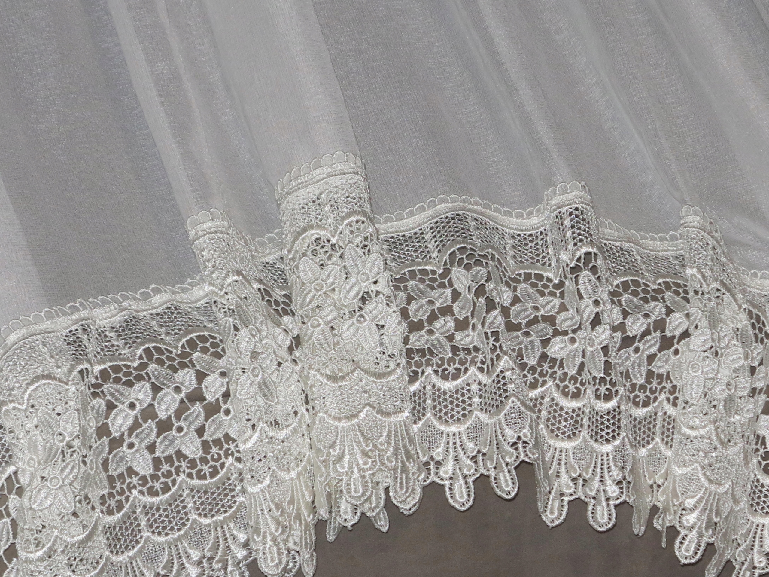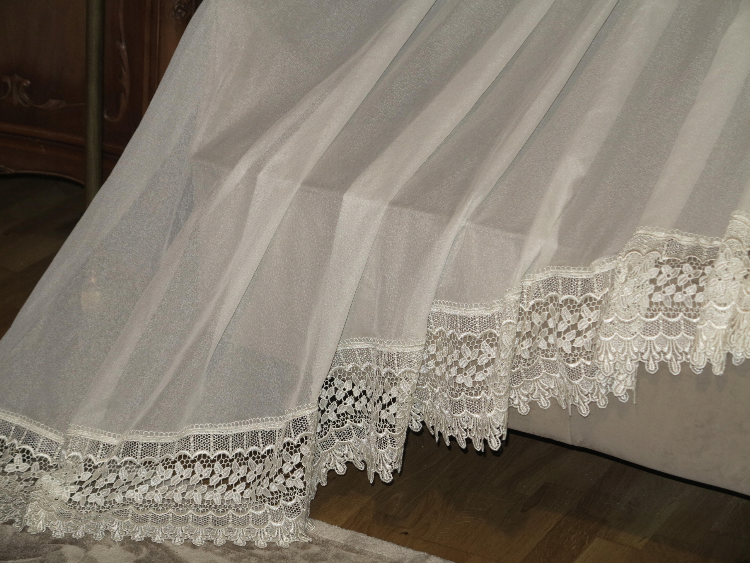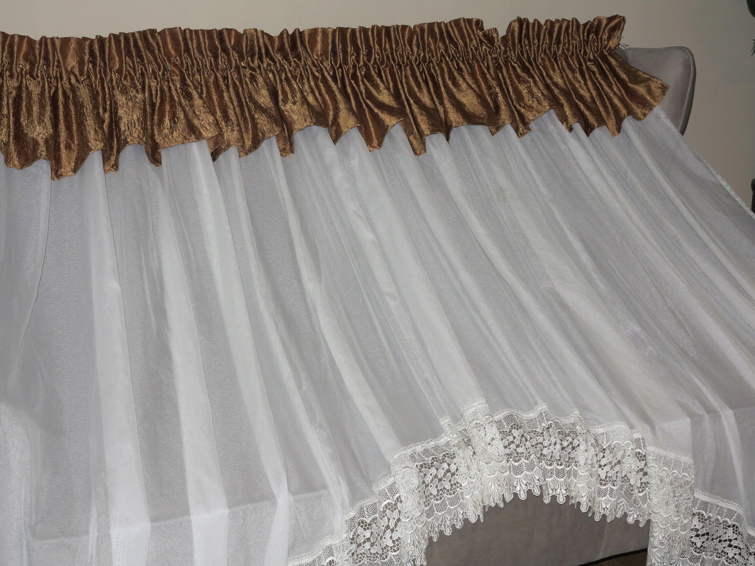 ЧУДЕСНЫЙ БЕЛЫЙ ШТОР С ЖЕМЧУЖНЫМ ГИПЮРОМ, ДЕКОРАТИВНО ВЫРЕЗАННЫМ В АРКУ. ВВЕРХУ ДЕКОРАТИВНЫЙ ОБРАТНИК ЦВЕТА СТАРОГО ЗОЛОТА.