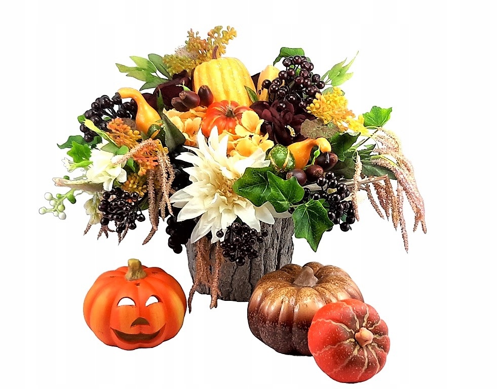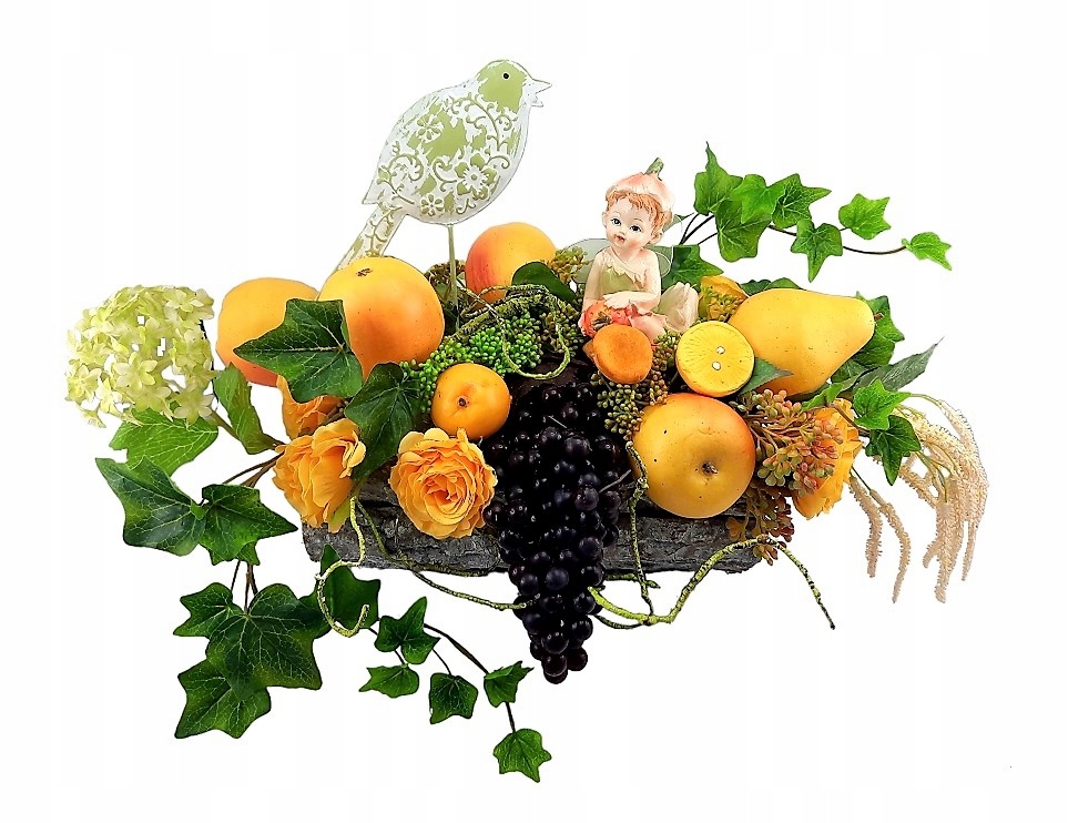 Композиция выполнена в красивых, ярких цветах оранжевого, желтого, белый и зеленый.