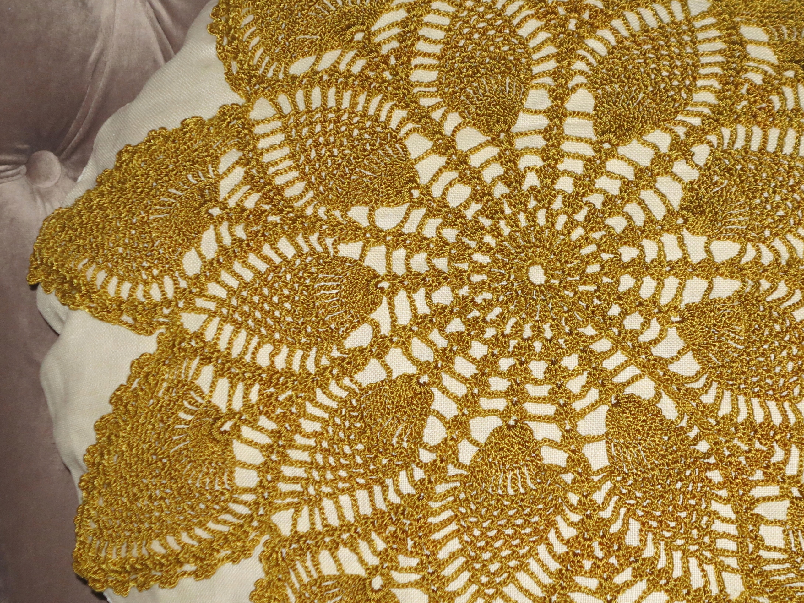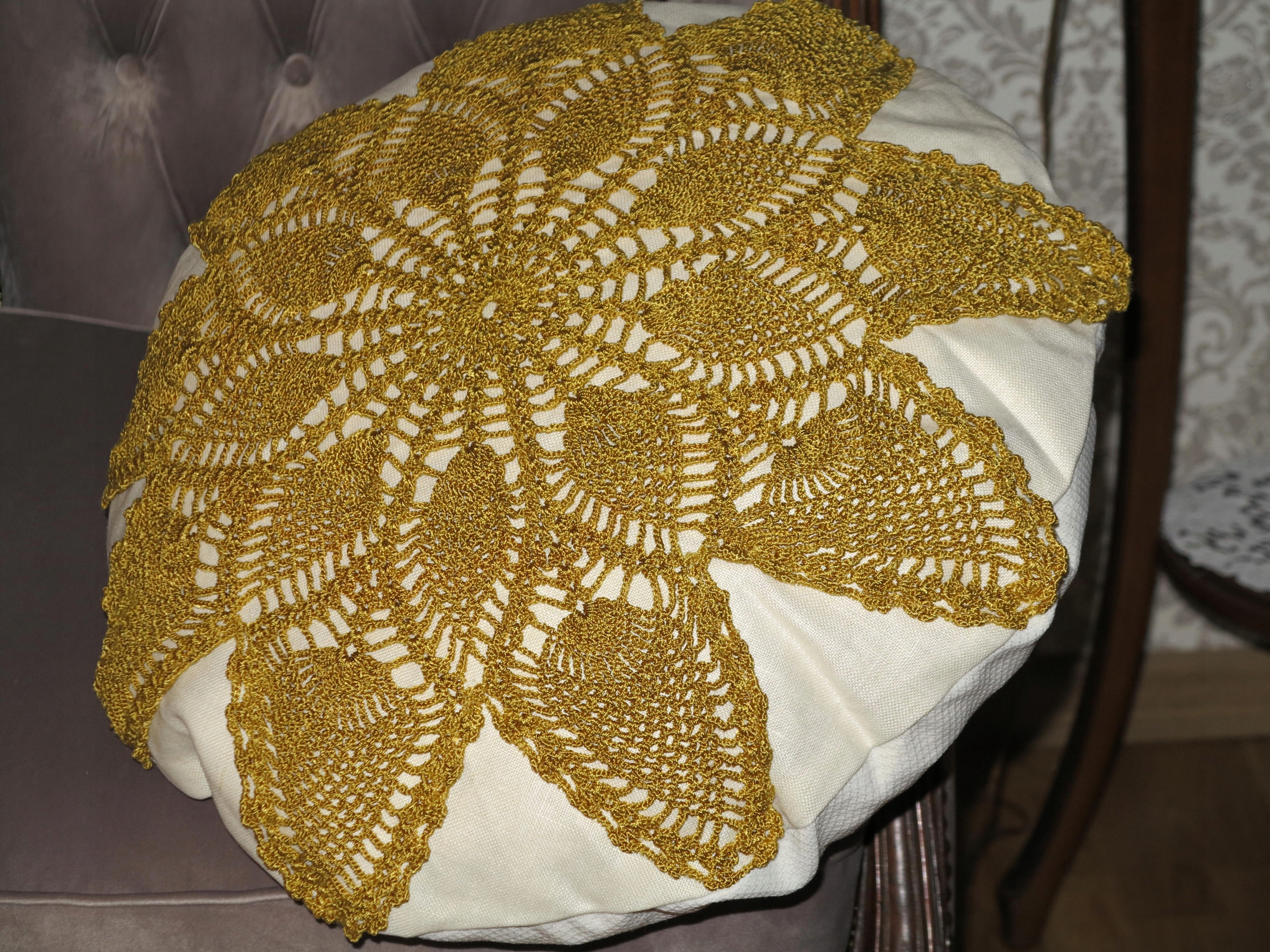 ОЧЕНЬ ДЕКОРАТИВНАЯ БОЛЬШАЯ Льняная КРУГЛАЯ ПОДУШКА С ПЛОТНЫМ ХЛОПКОМ ВЯЗАННАЯ КРЮЧКОМ ЦВЕТА СТАРОЕ ЗОЛОТО