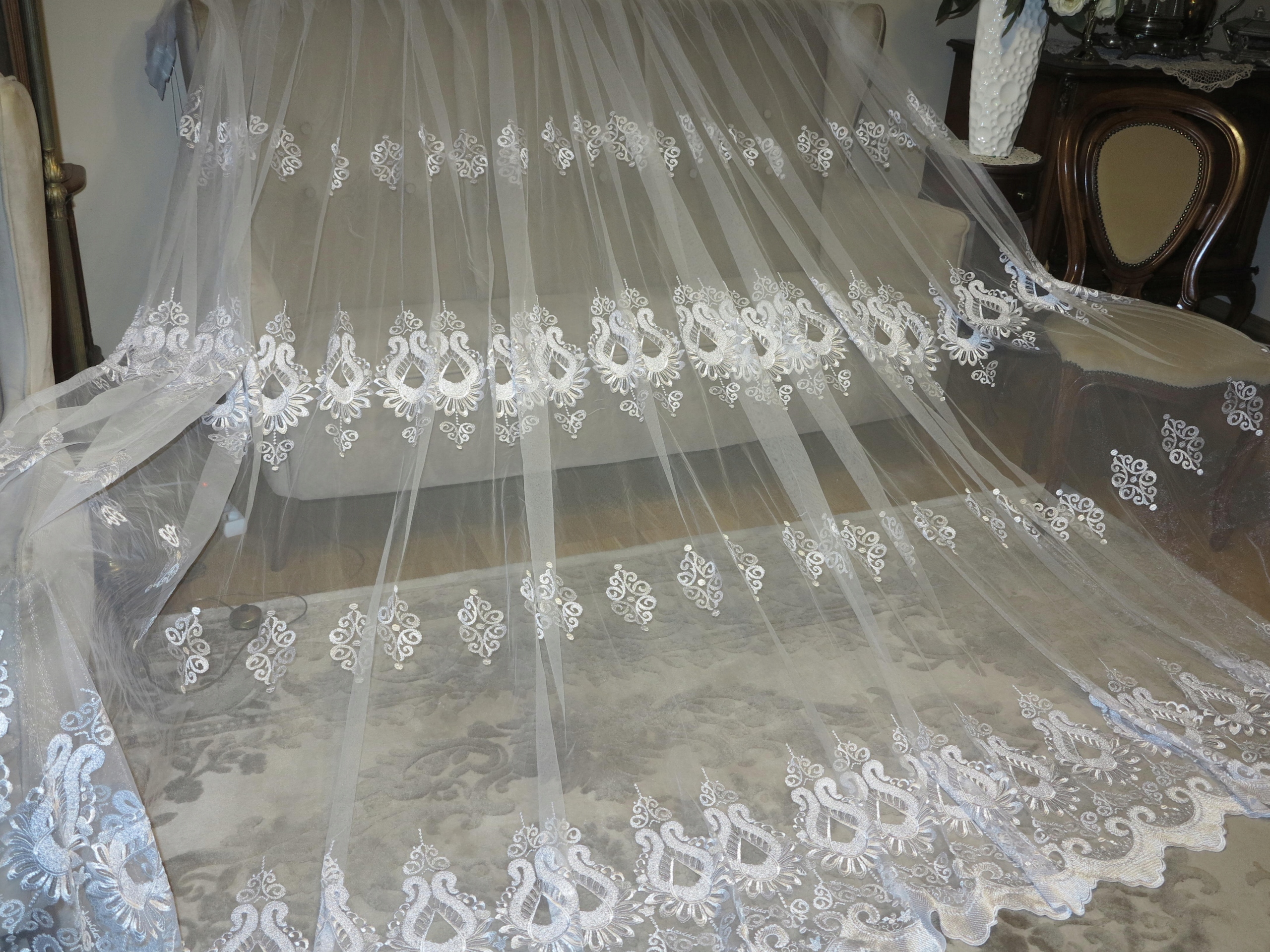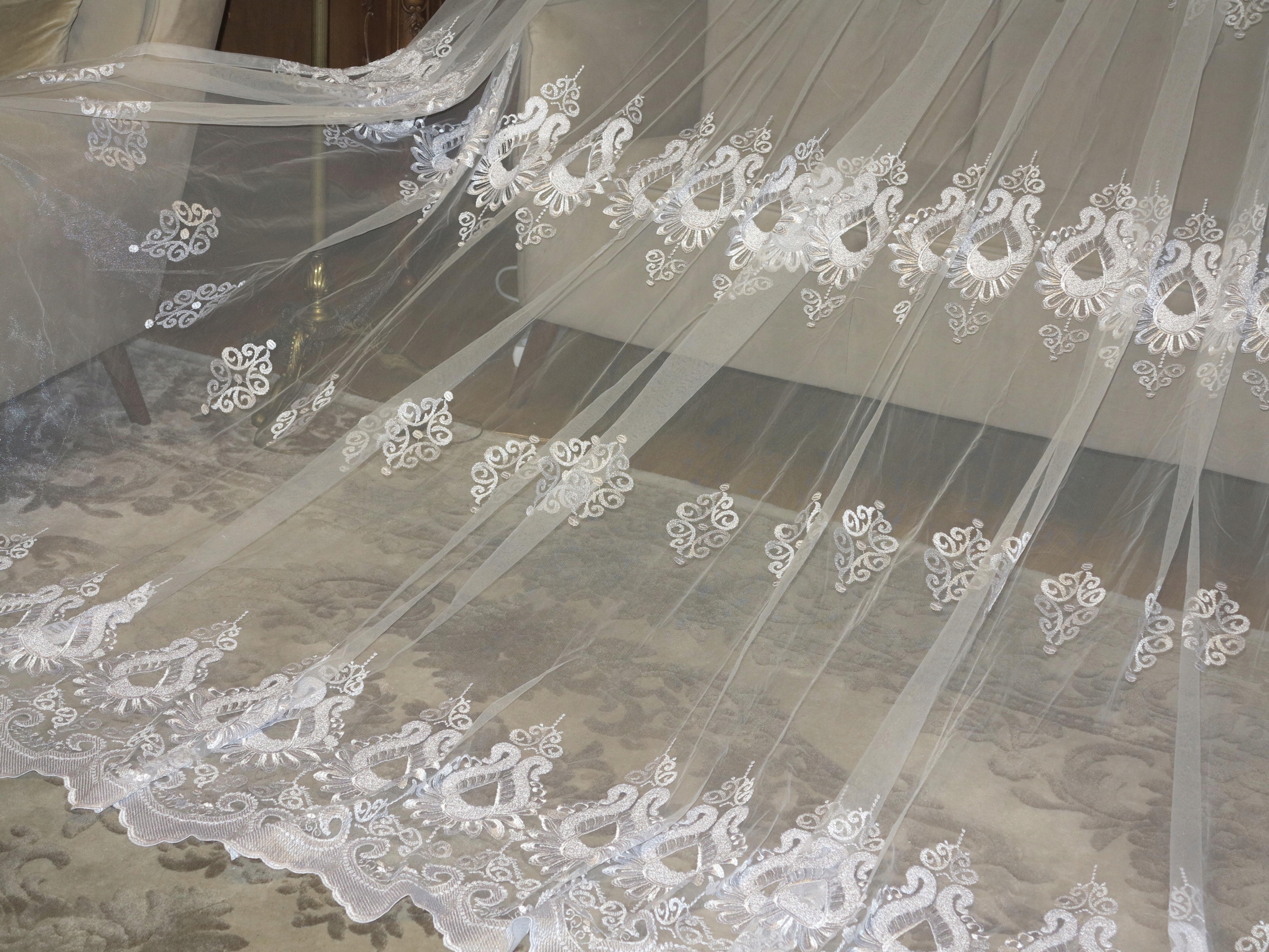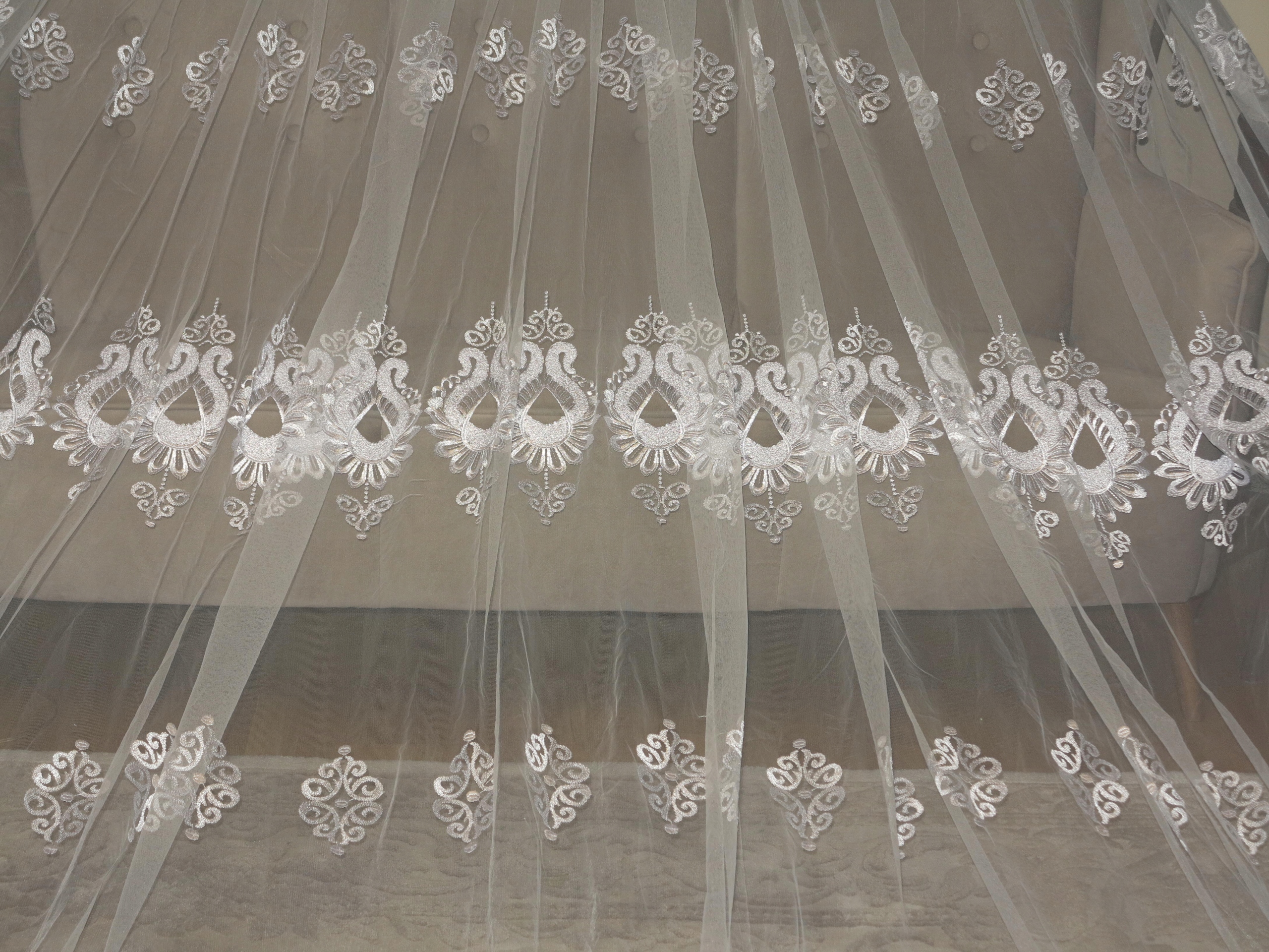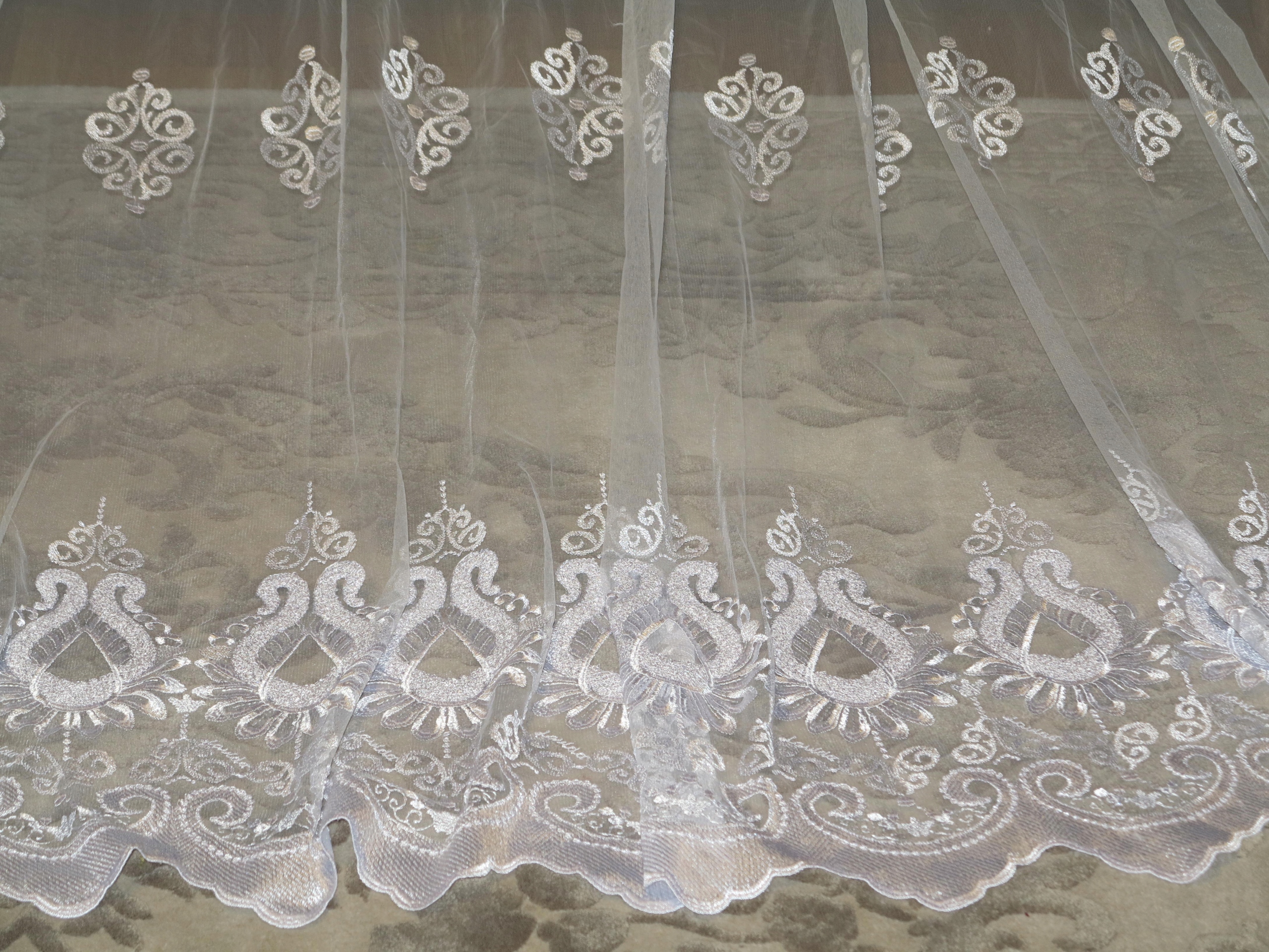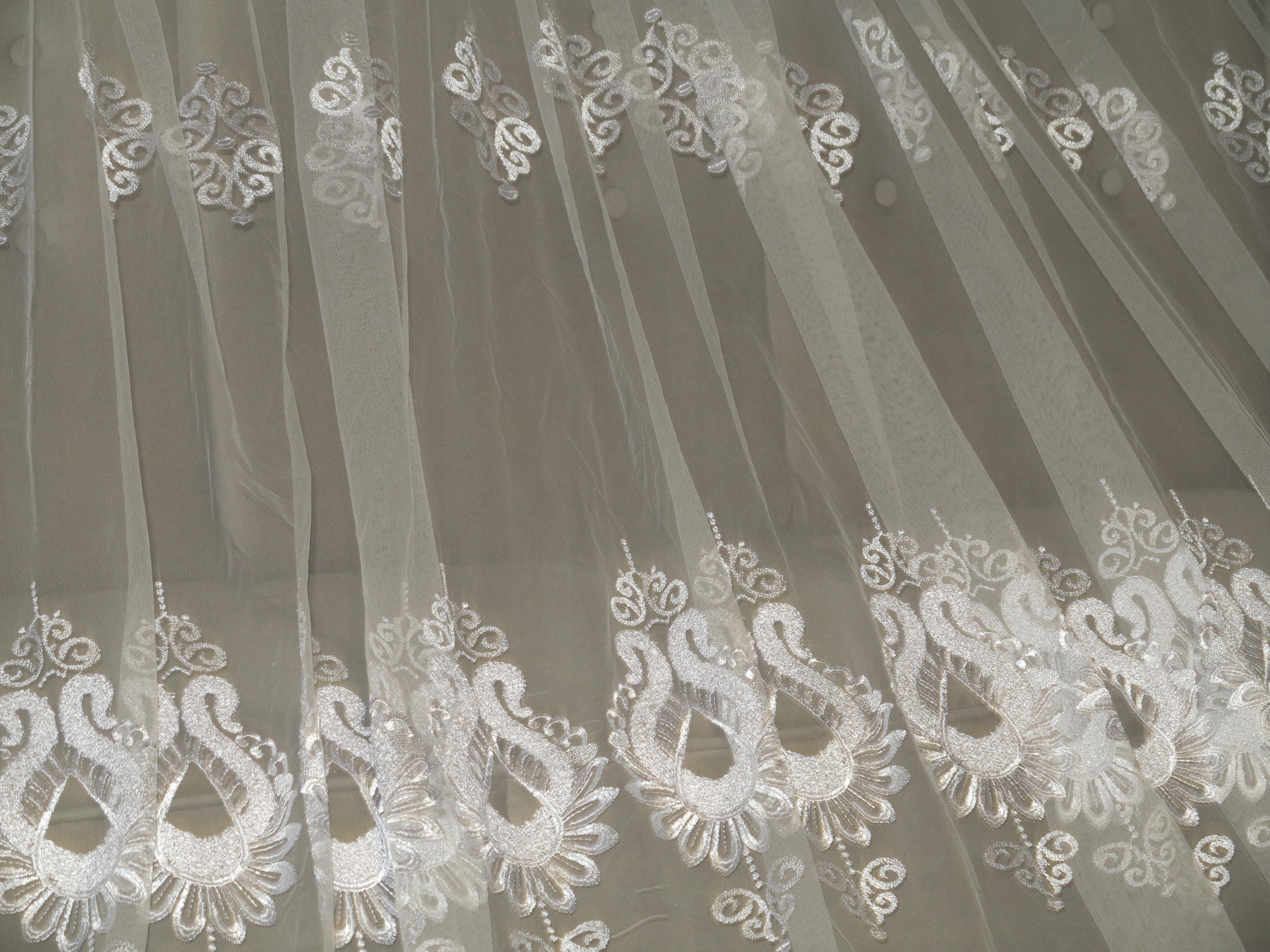 ЧУДЕСНУЮ ШИРОКУЮ БЕЛУЮ ТЮЛЕВУЮ ШТОРУ, УКРАШЕННУЮ БОГАТОЙ, ОЧЕНЬ ДЕКОРАТИВНОЙ ВЫШИВКОЙ. . ШТОРА, ОЧЕНЬ НЕЖНАЯ НА ВИД И ВЫСОКОЕ КАЧЕСТВО.