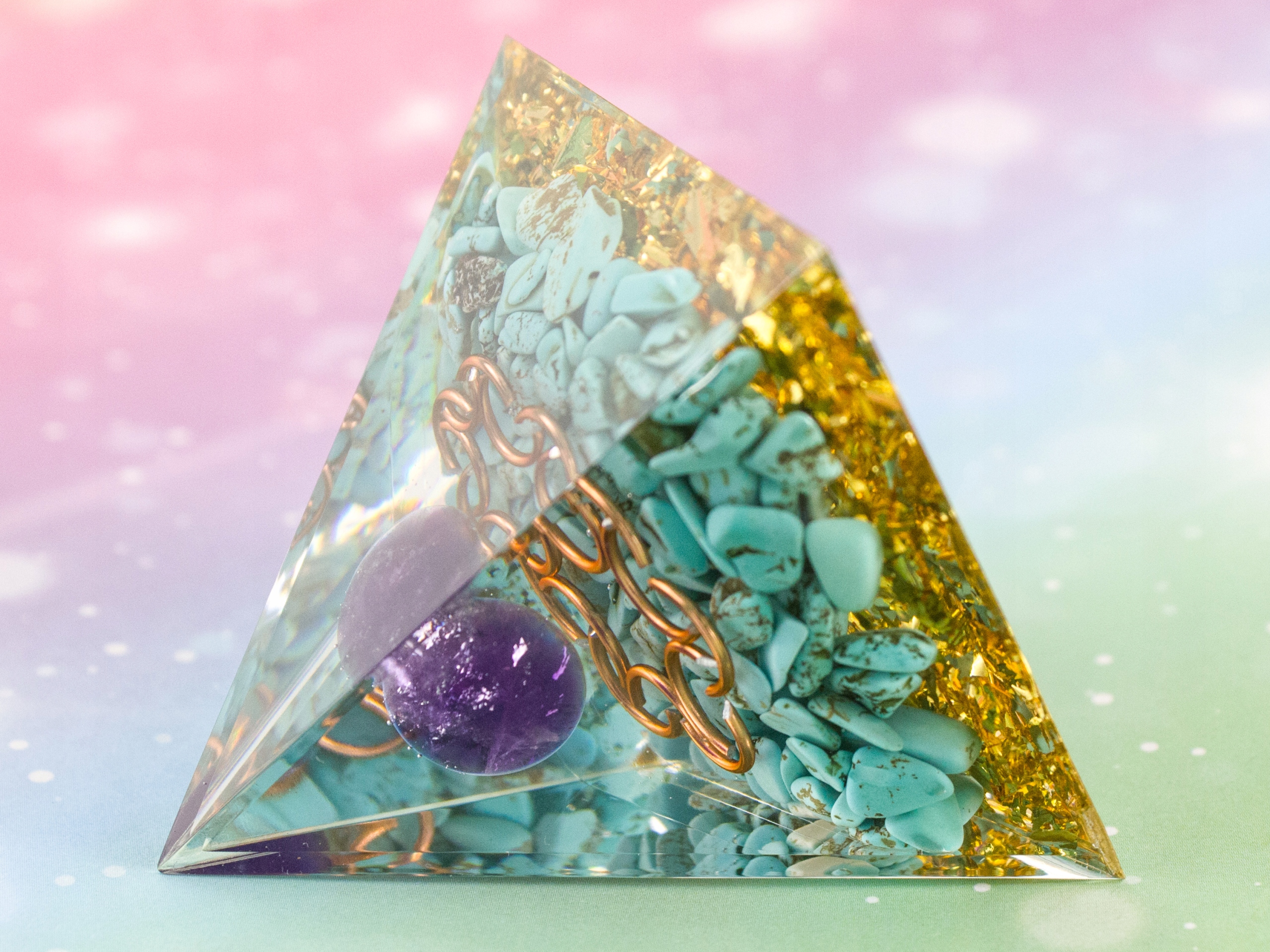 Пирамида Оргонит, энергетический эффект которой, усиленный медной и золотой фольгой, приносит, помимо прочего, гармонию, расслабление. и умиротворение мыслей и эмоций, а также очищает от плохой энергетики все помещение.