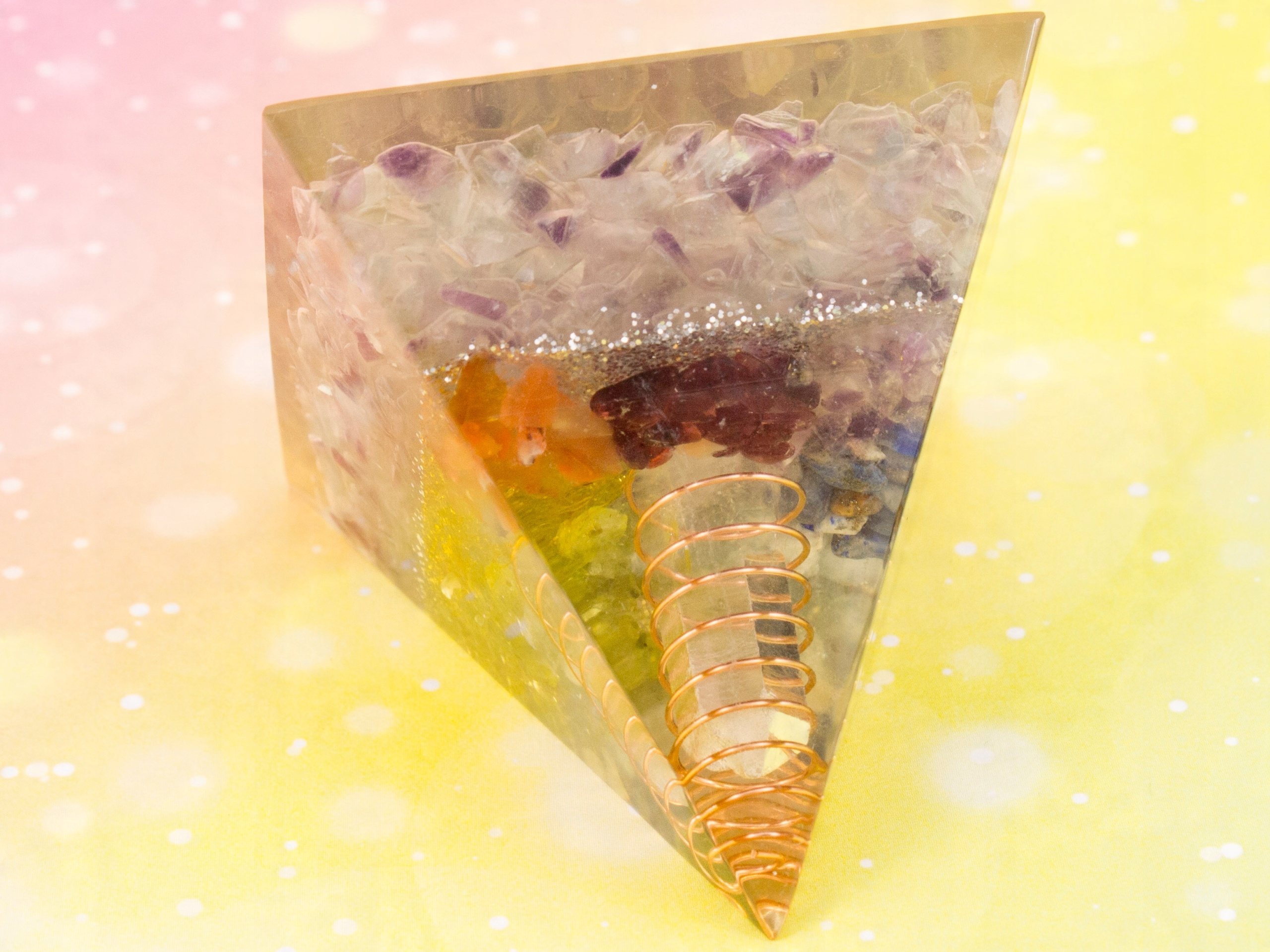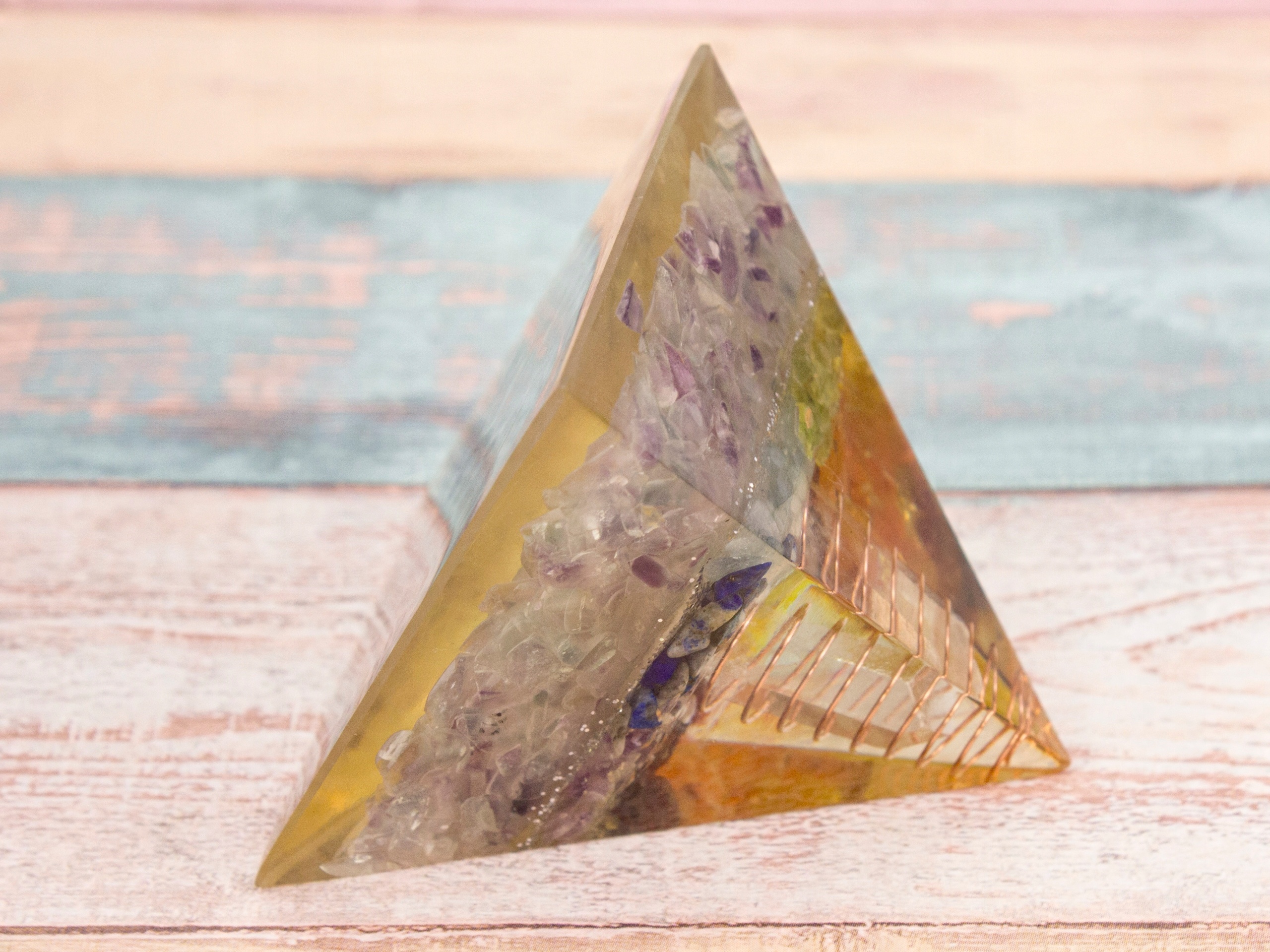 Эта ручная работа 5-сантиметровая пирамида из оргонита, завораживающая своей красотой и яркими цветами, содержит мощное сочетание минералов, излучающих положительную энергию и всестороннюю поддержку вашего благополучия.