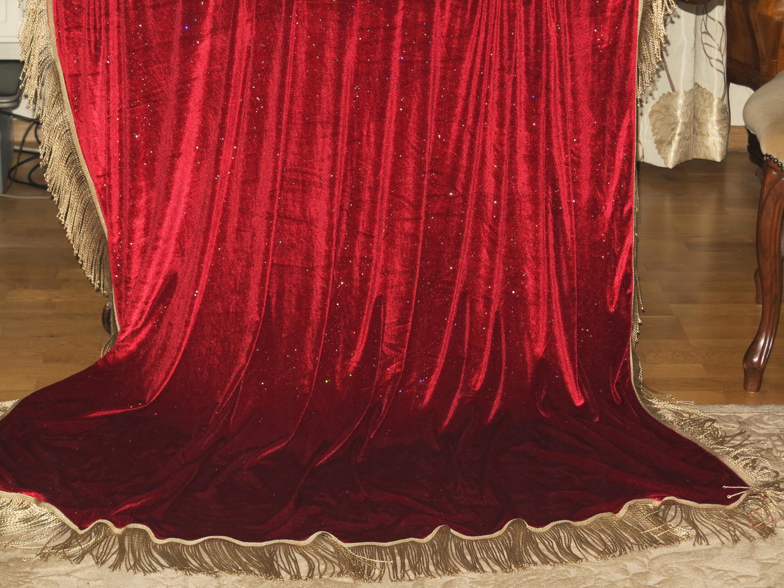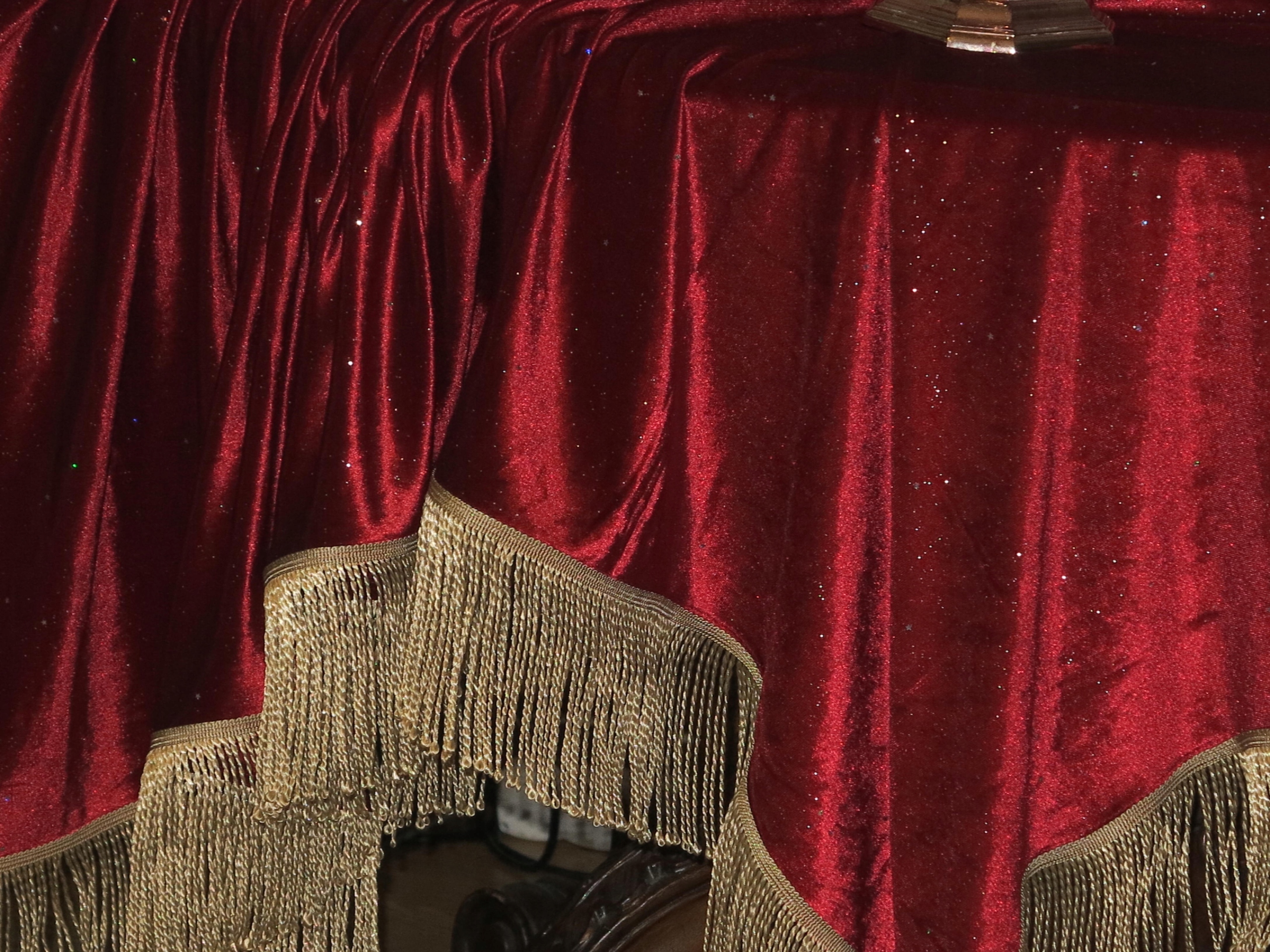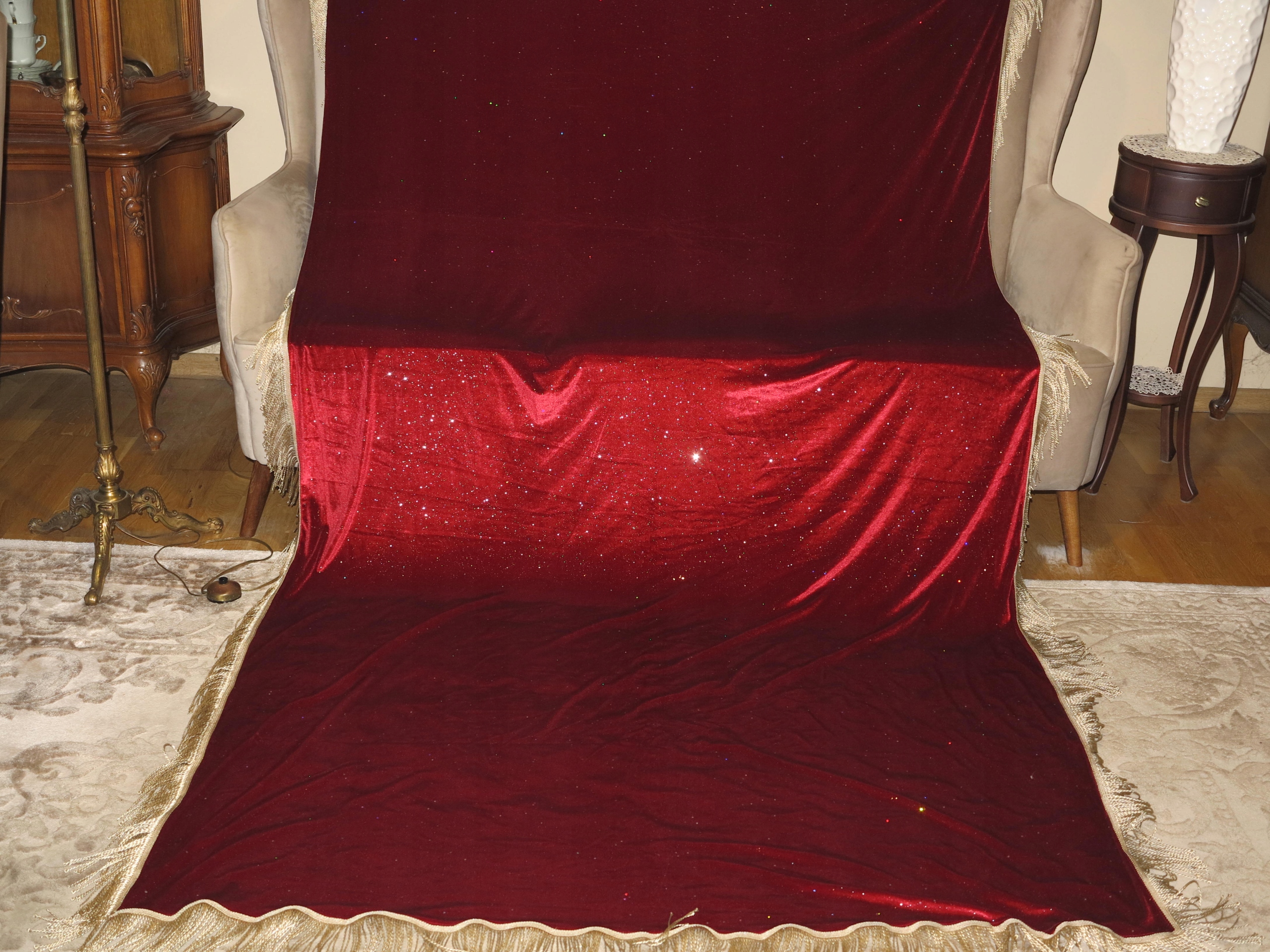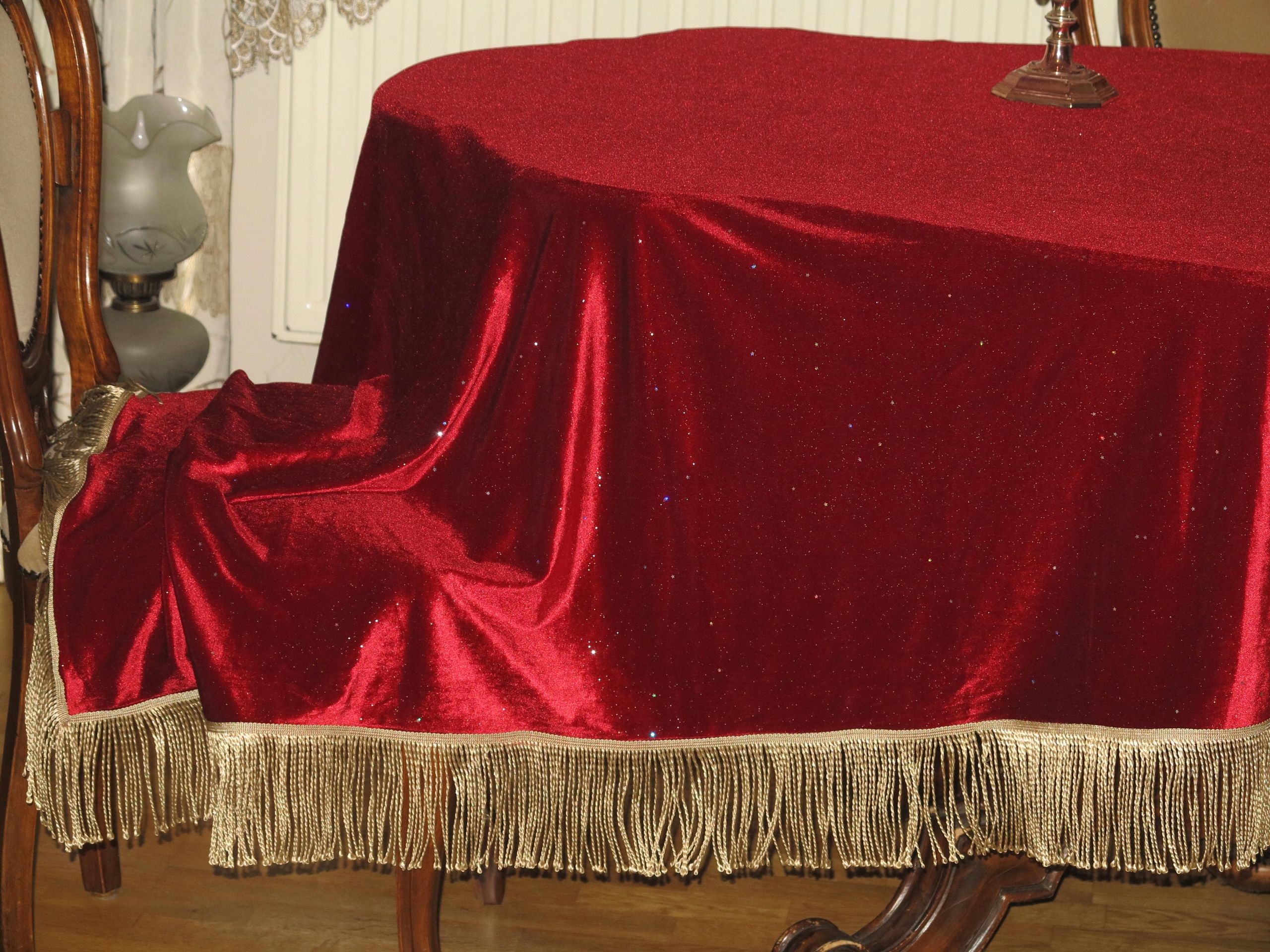 КРАСИВУЮ, ОГРОМНУЮ РОЖДЕСТВЕНСКУЮ СКАТЕРТЬ ИЗ ТЕЛЯЧЕГО БАРХАТА В ОТЛИЧНОМ КОРОЛЕВСКОМ ФИОЛЕТОВОМ ЦВЕТЕ, ВСЯ С ЗОЛОТЫМИ КАПЛЯМИ - ШИНКЕРАМИ С ЗОЛОТОМ. СКАТЕРТЬ, УКРАШЕННАЯ ЗОЛОТОЙ ДЛИННОЙ БАХОРОЙ 11см.