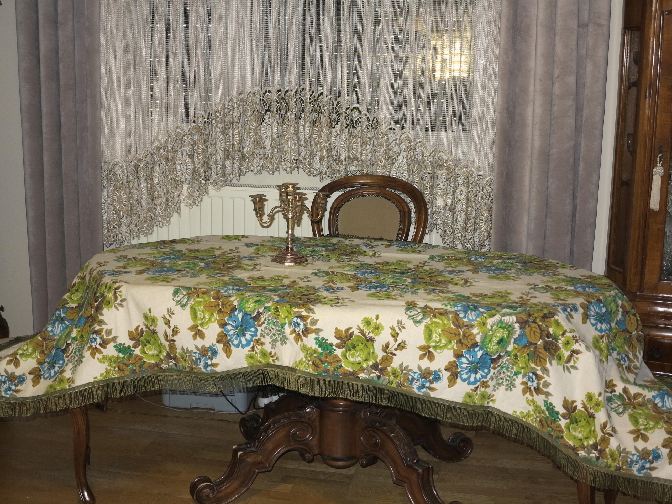 Предметом аукциона является исключительно красивая скатерть из чистого льна с букетами цветов. Размеры скатерти: 229/123см плюс бахрома. Скатерть б/у, в отличном состоянии. Рекомендую.
