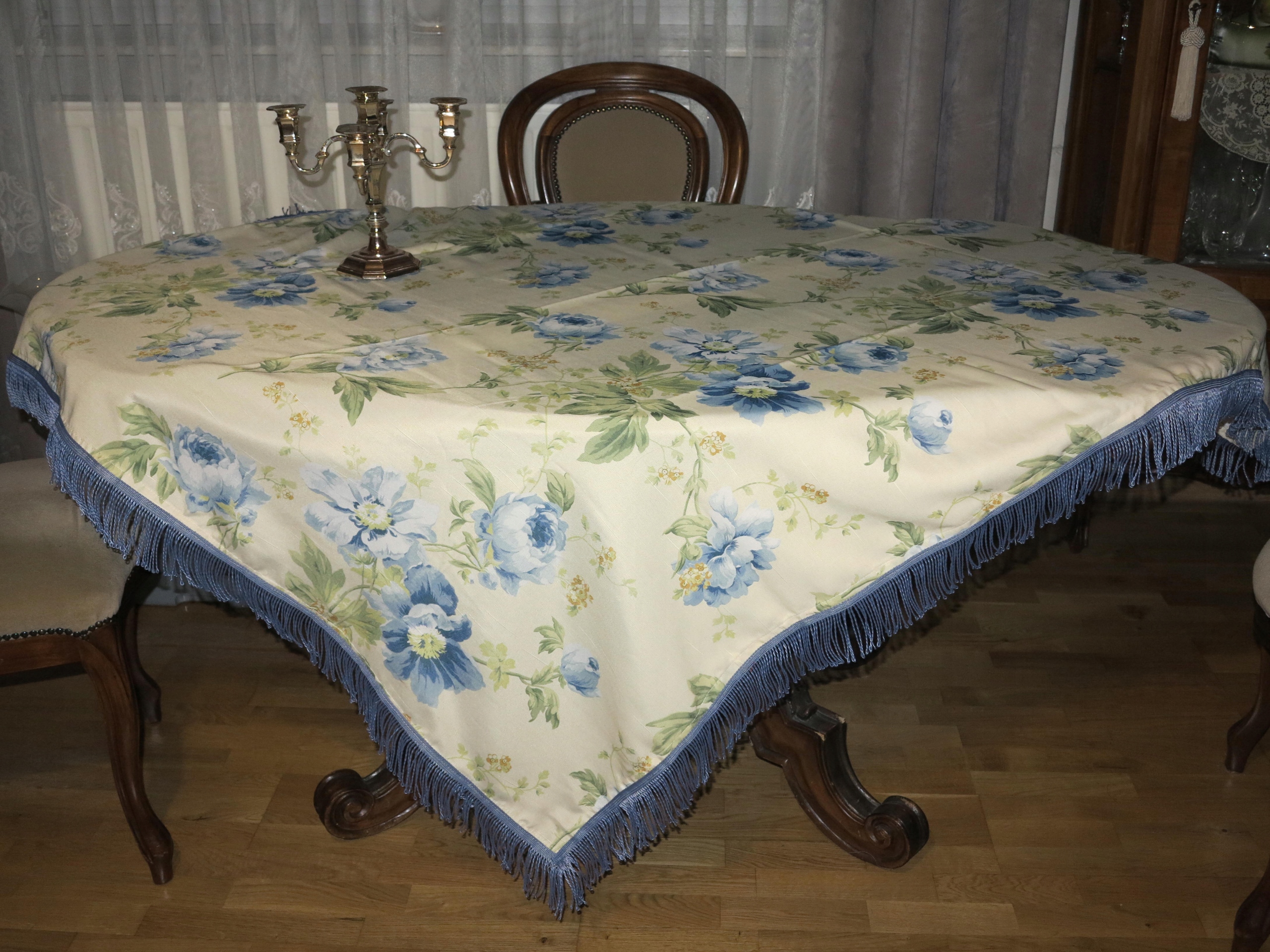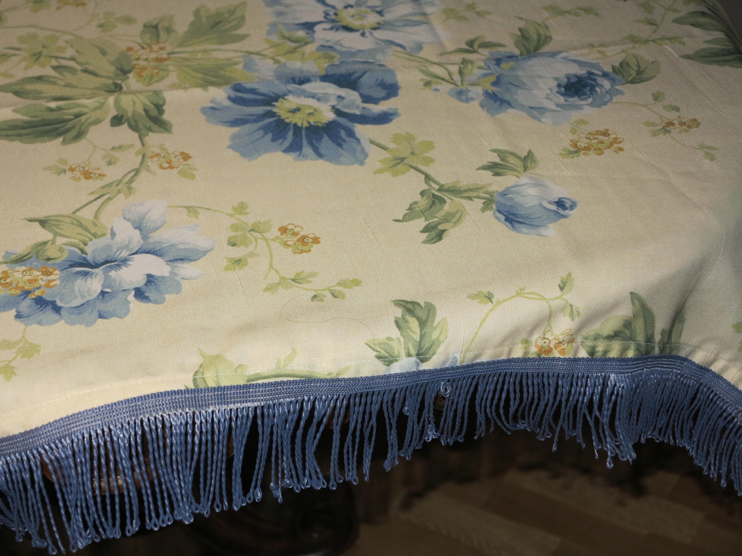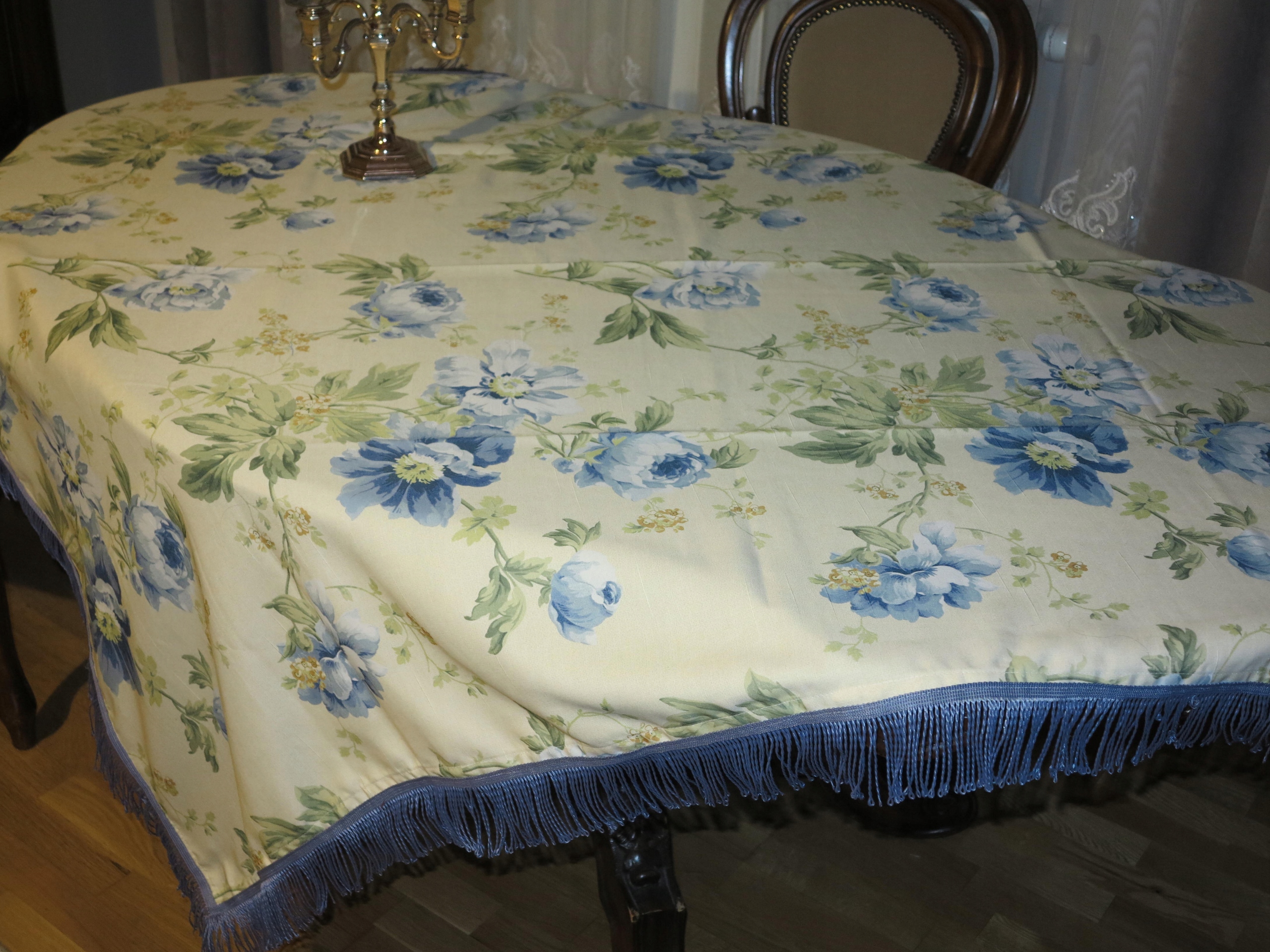 Предмет аукциона – чрезвычайно очаровательная английская скатерть. с крупными цветами, отделанными бахромой по периметру.Размеры скатерти: 162/143см+ с бахромой примерно 7см. Скатерть б/у, но в очень хорошем состоянии и качестве, цвета очень насыщенные и выразительные. Рекомендую, будет красивое украшение стола.