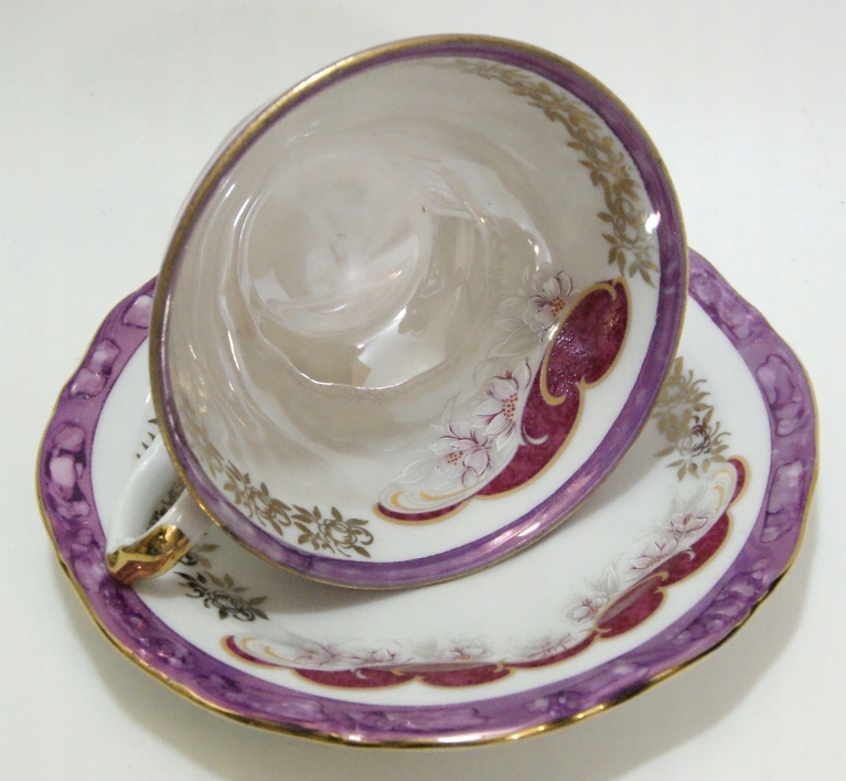 Красивая, старинная чашка, из белого фарфора, украшенная цветами и позолотой, центр чашки переливается.