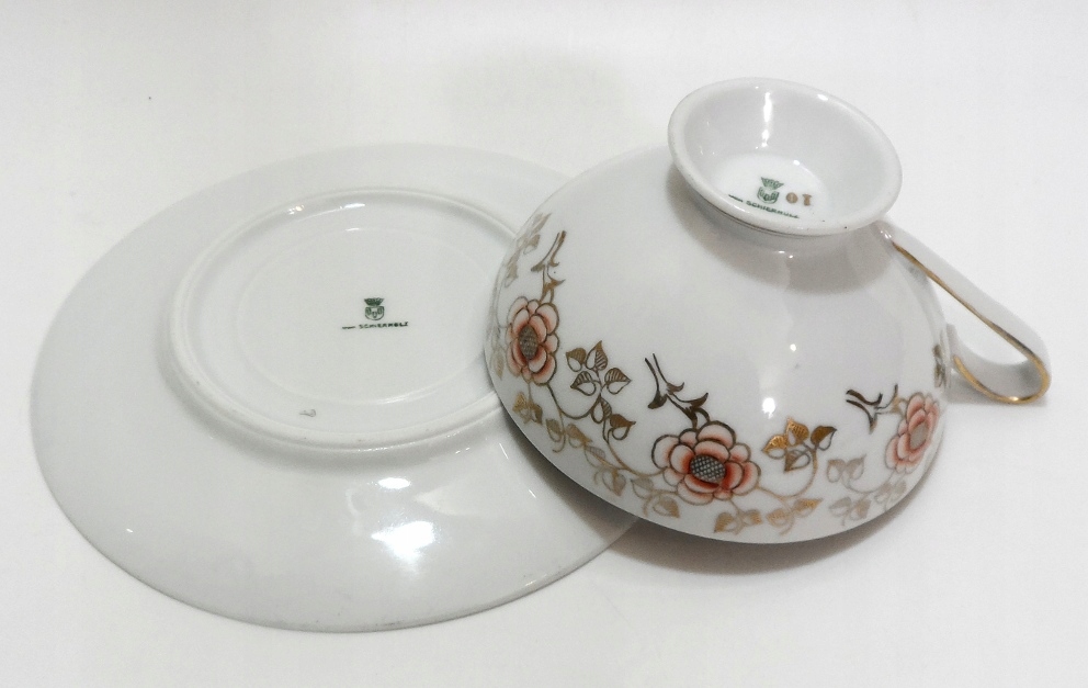 Красивая, старинная чашка из белого фарфора, украшенная цветами и золотыми листьями.