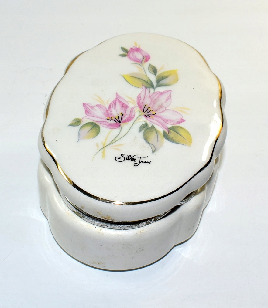 Шкатулка изготовлена из нежного белого фарфора, украшена красивым мотивом из нарисованных вручную цветов. Детали соединены шарниром.