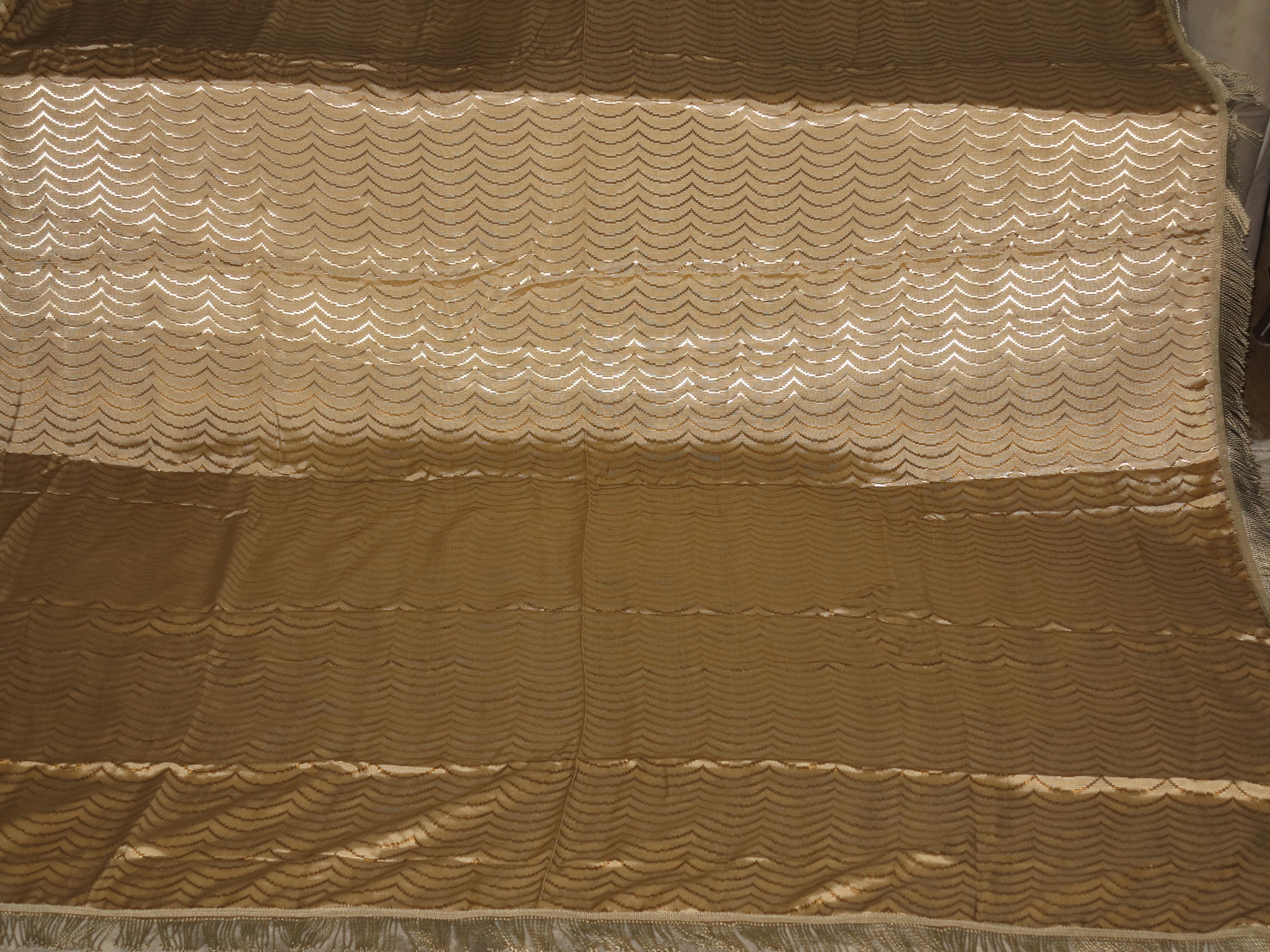 КРАСИВУЮ СТИЛЬНУЮ ЗОЛОТУЮ СКАТЕРТЬ С ТИСНЕННЫМ ВЫПУКЛЫМ УЗОРОМ. С ЗОЛОТОЙ БАХИРОЙ ВОКРУГ