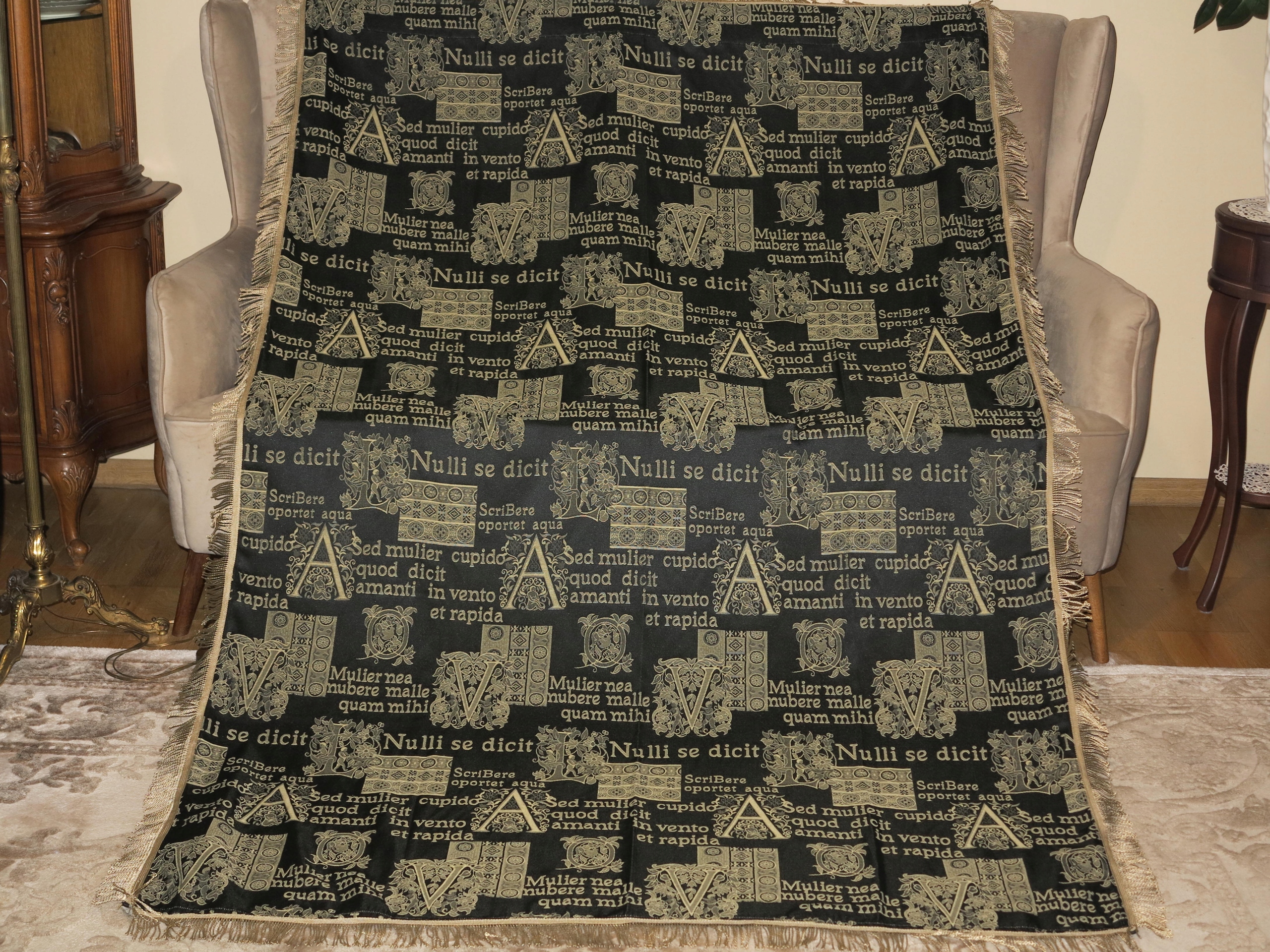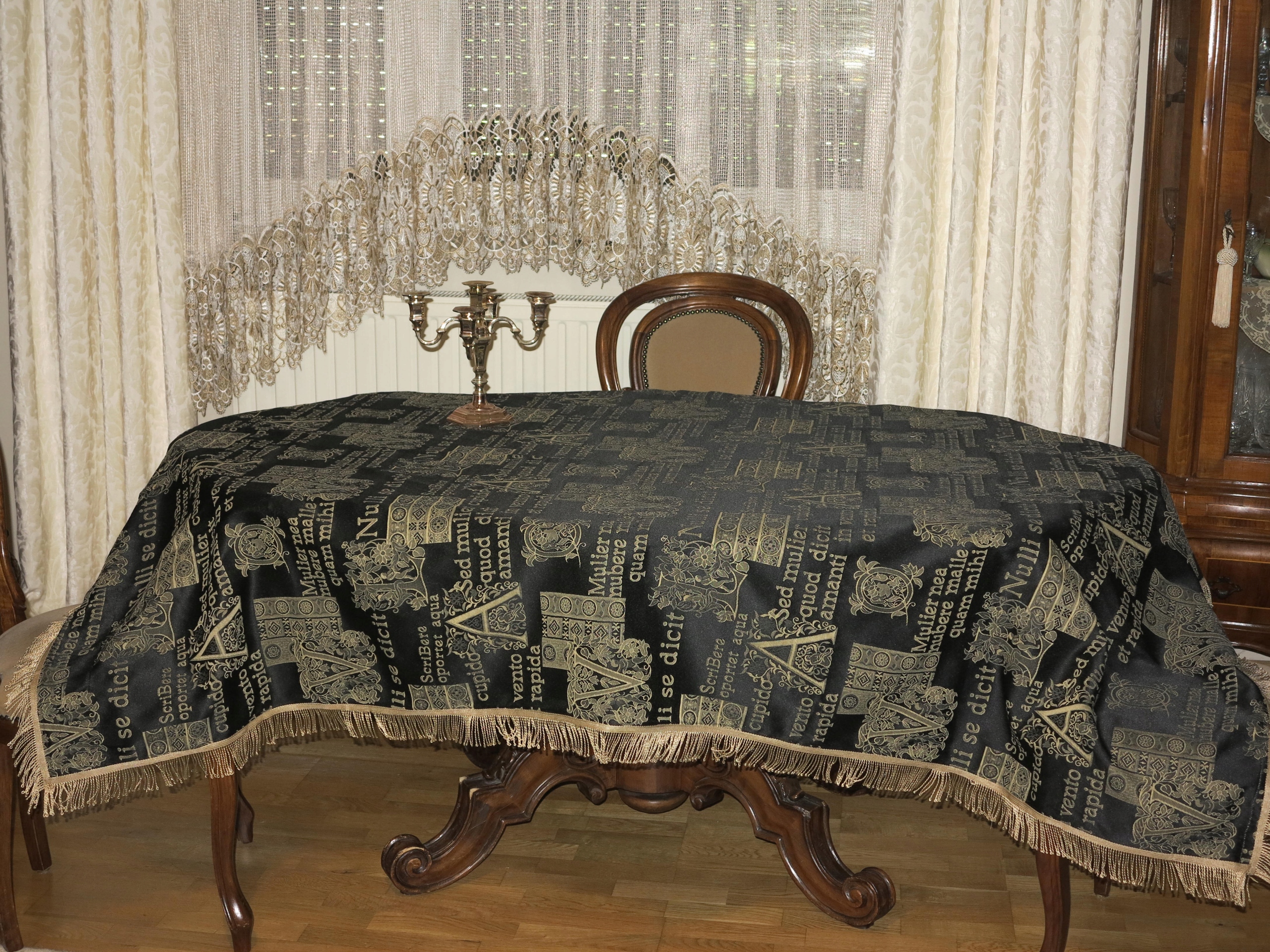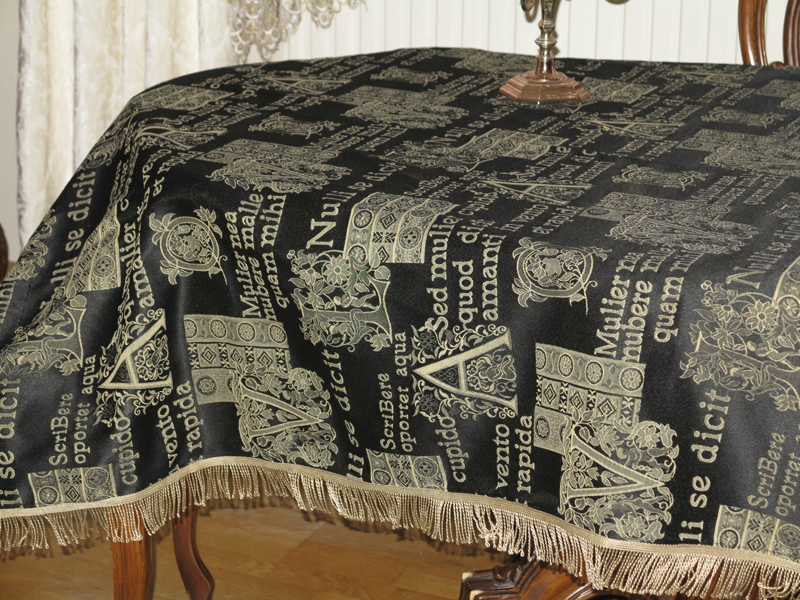 КРАСИВУЮ СТИЛЬНУЮ СКАТЕРТЬ ИЗ ВЫСОКОКАЧЕСТВЕННОЙ МАССИВНОЙ ЖАККАРДОВОЙ ТКАНИ ЧЕРНОГО ЦВЕТА СО СТАРЫМ ПРИНТНЫМ УЗОРОМ. ЗОЛОТАЯ БАХОЧКА ПО ВОКРУГУ.