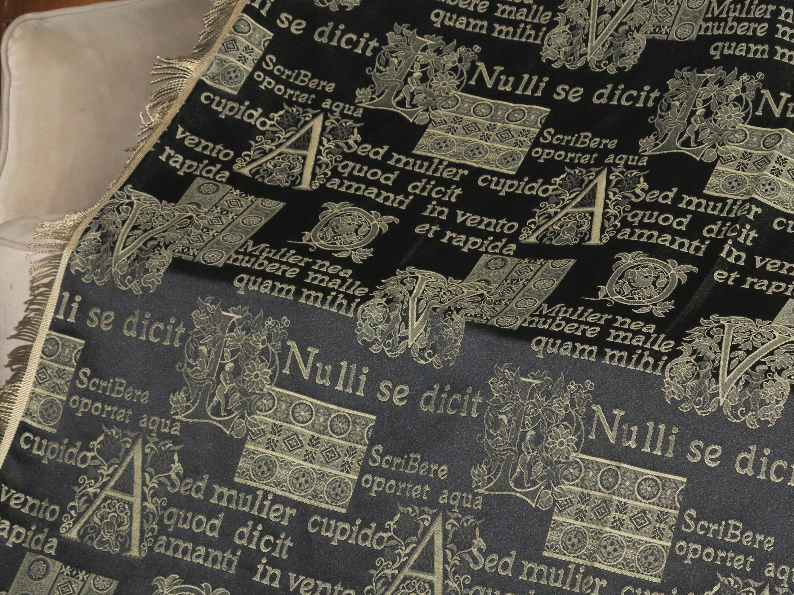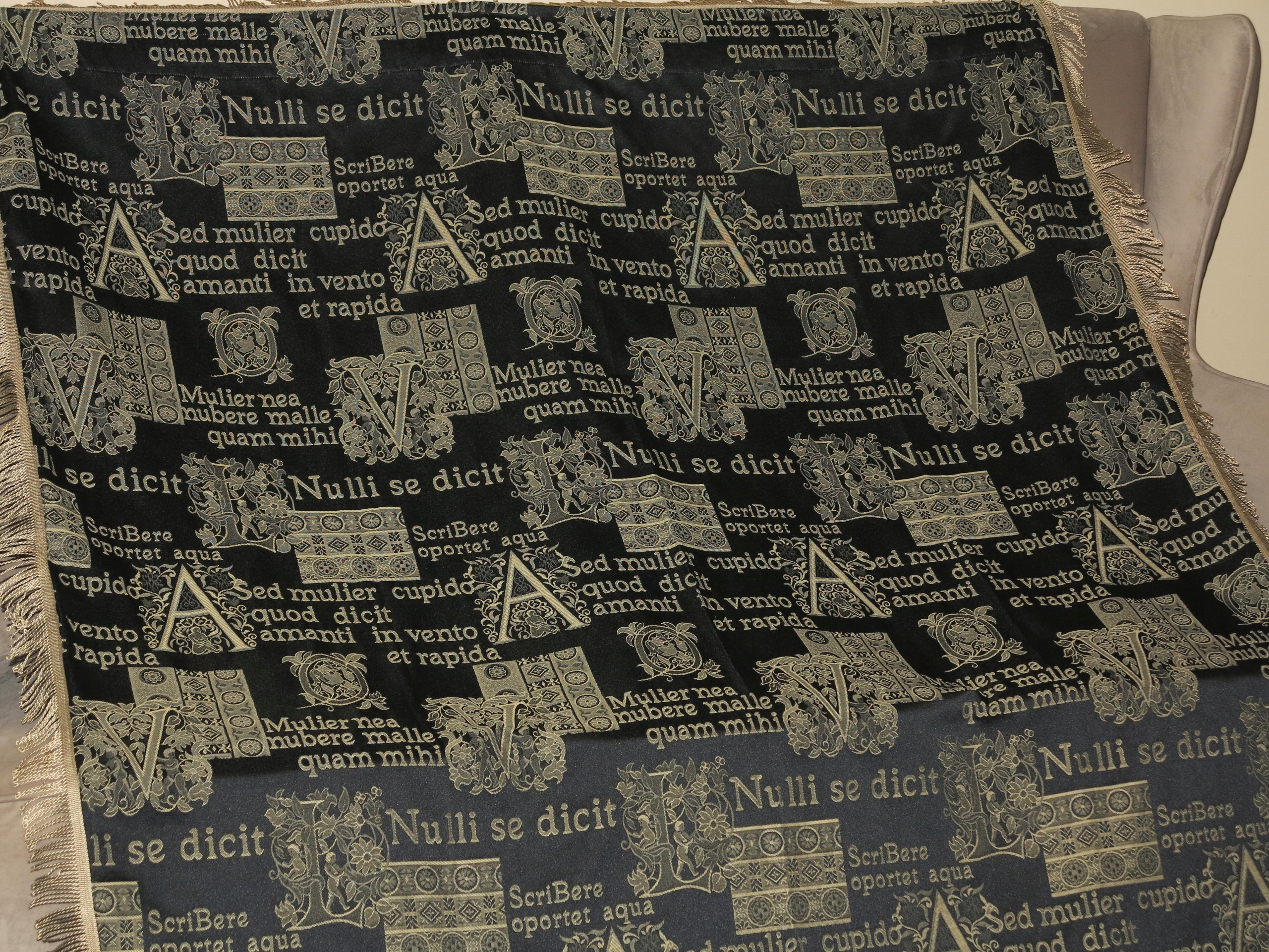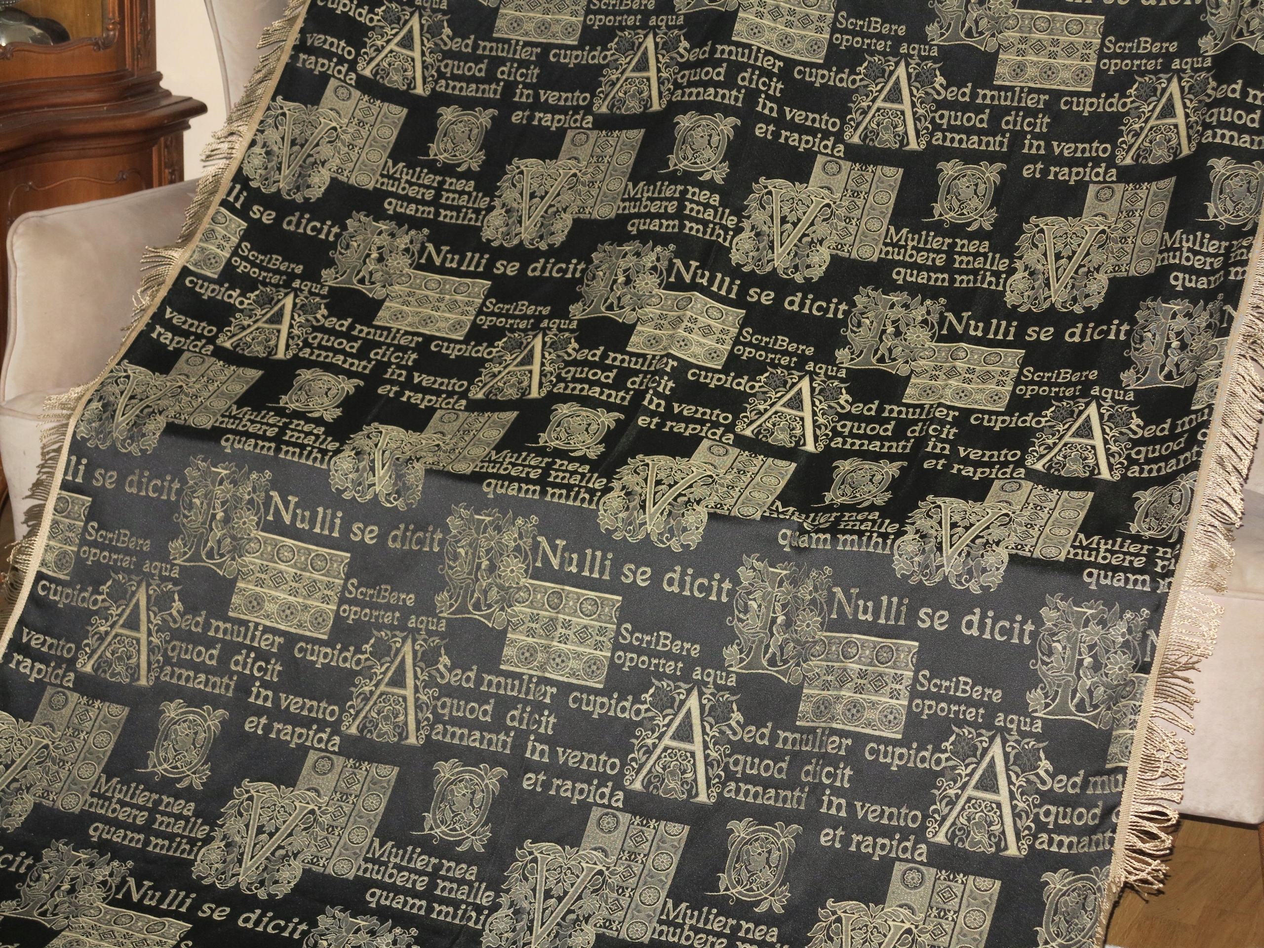 КРАСИВУЮ СТИЛЬНУЮ СКАТЕРТЬ ИЗ ВЫСОКОКАЧЕСТВЕННОЙ МАССИВНОЙ ЖАККАРДОВОЙ ТКАНИ ЧЕРНОГО ЦВЕТА СО СТАРЫМ ПРИНТНЫМ УЗОРОМ. ЗОЛОТАЯ БАХОЧКА ПО ВОКРУГУ.