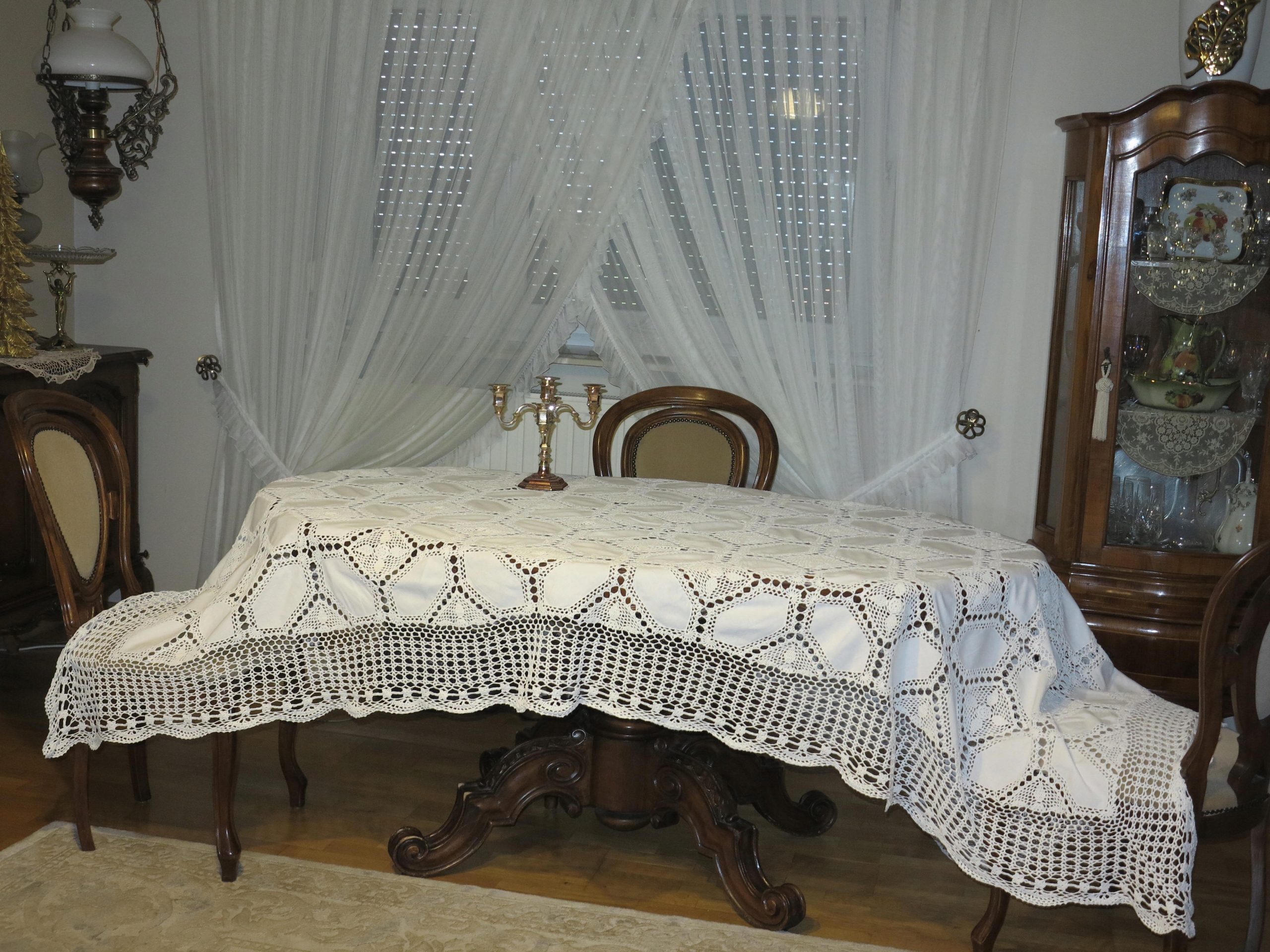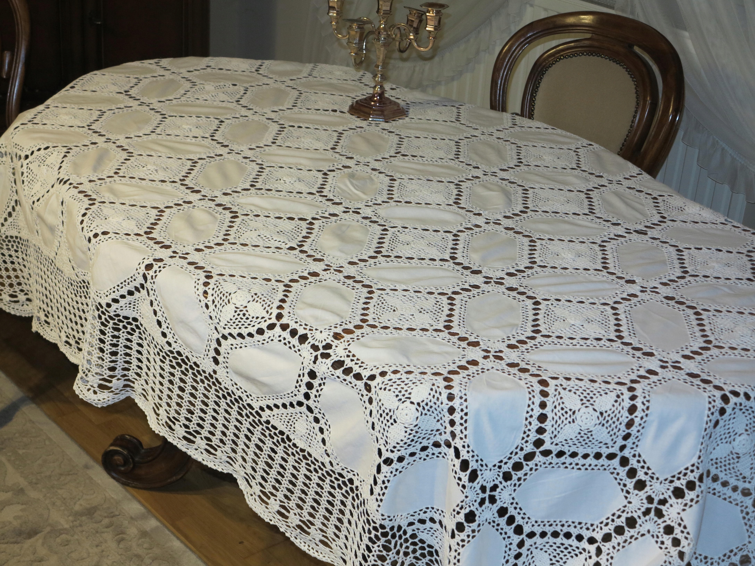 Предмет аукциона – исключительно красивая скатерть, сочетание холста и крючком, очень редкого размера, когда дело касается этого типа скатерти. Красиво смотрится на столе. Имеет размеры: 280/180см. Б/у, в очень хорошем состоянии и качестве.