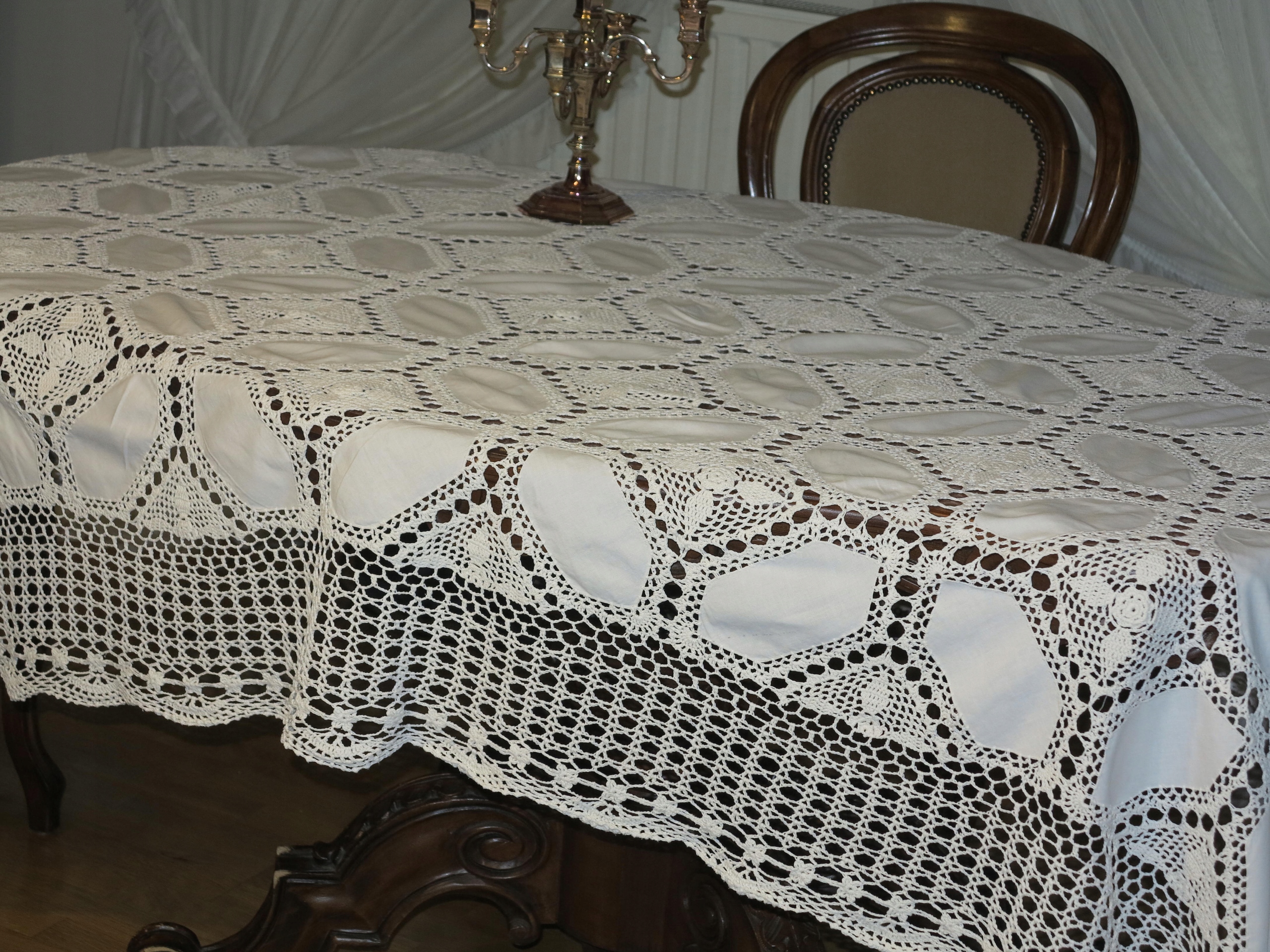 ОЧЕНЬ КРАСИВУЮ, ОГРОМНУЮ БЕЛУЮ СКАТЕРТЬ С ЛЬНЯМИ ВСТАВКАМИ, С БОЛЬШОЙ ВЯЗАНИЕМ КРЮЧКОМ. ЦЕЛЬНО ХЛОПКОВАЯ СКАТЕРТЬ.