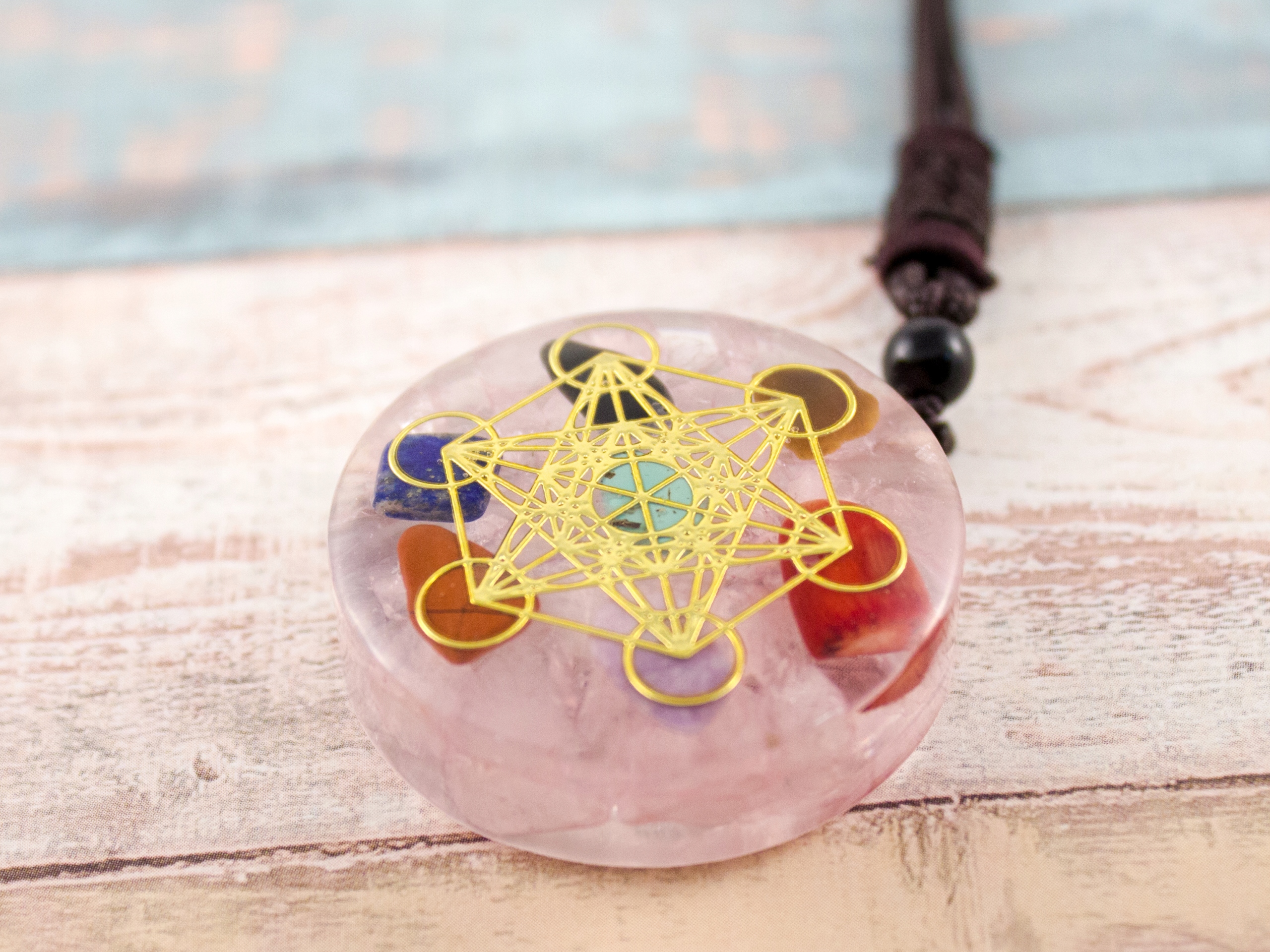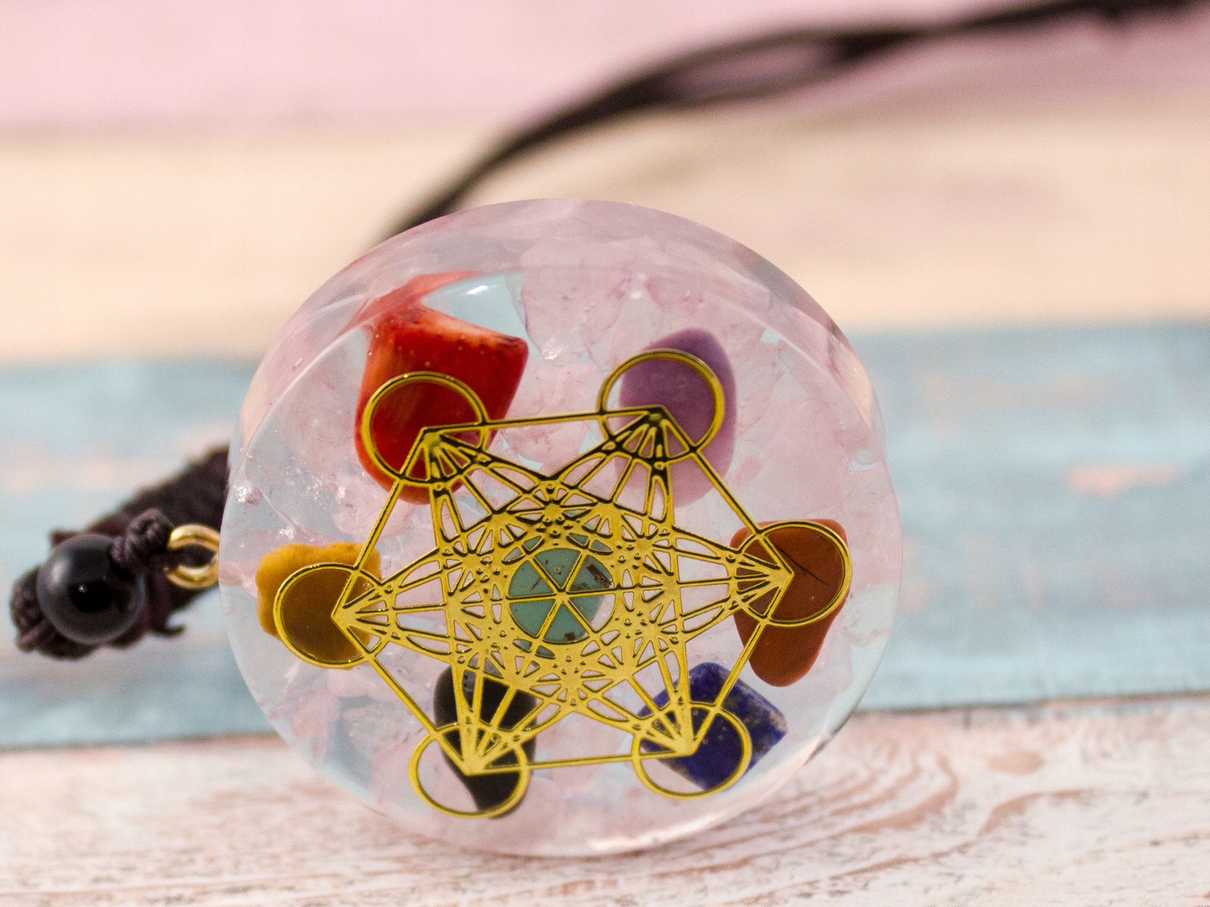 Красивое, красочное колье с розовым кристаллом и камнями Чароит, Тигровый глаз, Лазурит, Яшма, Красный Коралл, Бирюза и энергия меди путь - Куб Метатрона. Это прекрасное украшение, красивый подарок и разносторонний энергетический эффект.