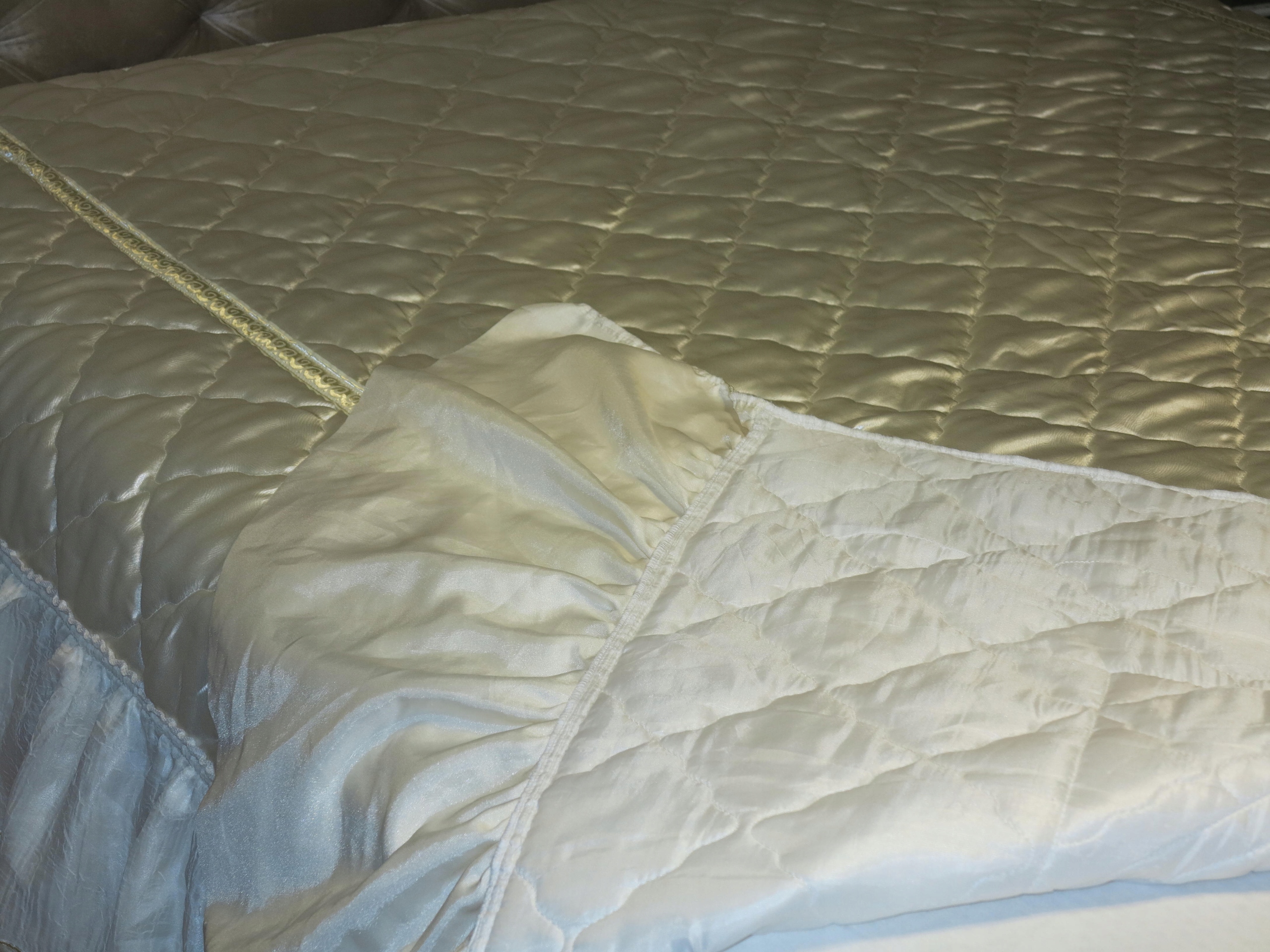 ЧУДЕСНОЕ И РОМАНТИЧЕСКОЕ СТЕГАНОЕ ИЗГОЛОВЬЕ С ВЫШИВКОЙ ВНИЗУ. ШИРОКИЙ ДВОЙНОЙ РАЛЛАНС С ДВУХ СТОРОН. РУКАВ ЦВЕТА ЭКРУ, НЕЖНО ОКРАШЕН ЗОЛОТОМ