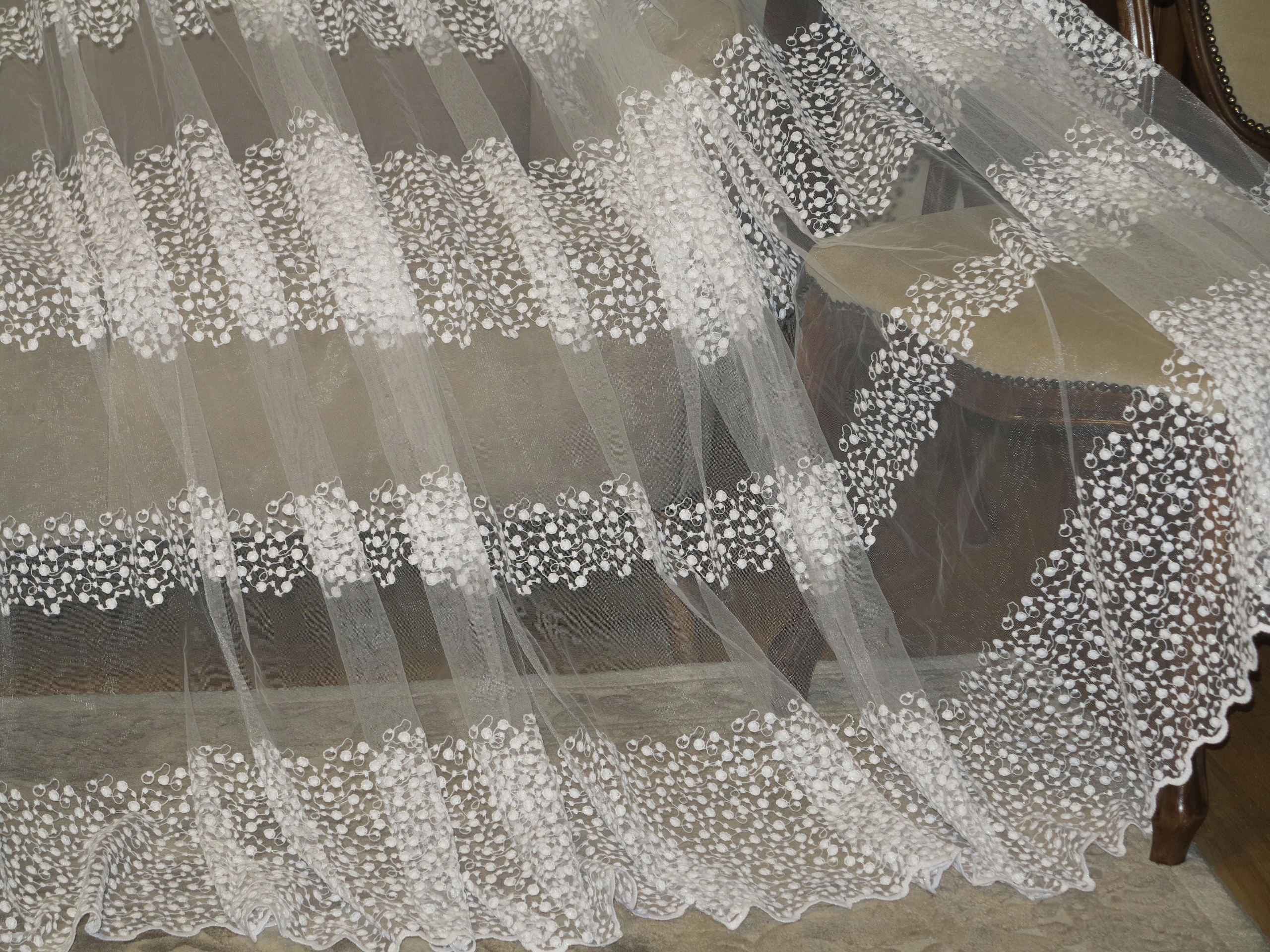 ЧУДЕСНАЯ БЕЛОСНЕЖНАЯ ШТОРА С НЕСКОЛЬКИМИ ПОЛОСАМИ С ТОНКОЙ ВЫШИВКОЙ. САМА ШТОРА - НЕЖНЫЙ ТЮЛЬ.