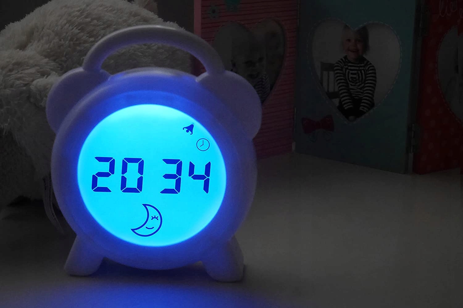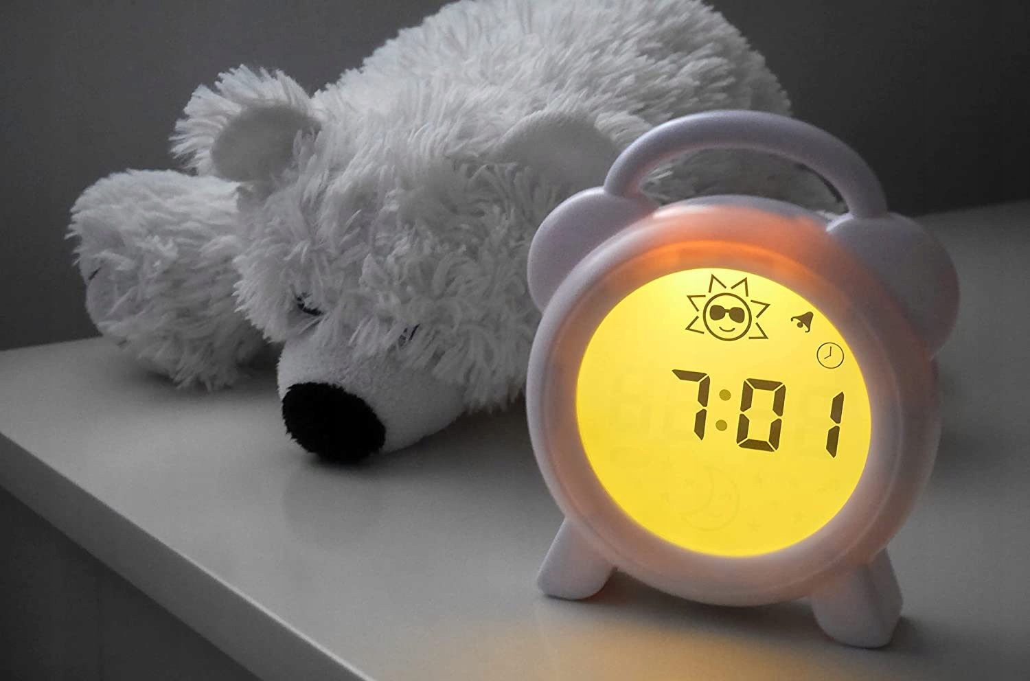 - Тренер сна помогает детям, которые слишком маленькие, чтобы читать обычные часы, понимать с цветами и картинками, когда он встает и спать.