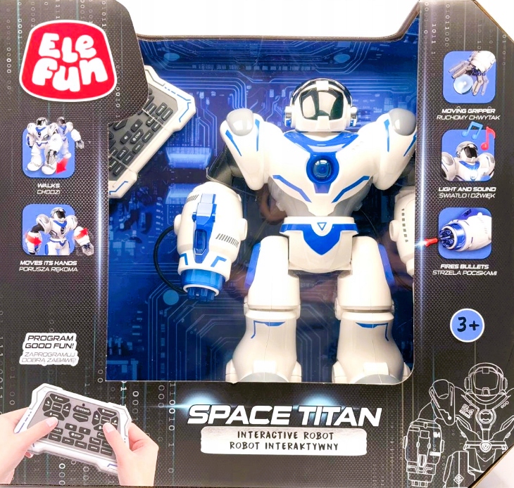 Идеальная игрушка для молодого любителя роботов. h1> Удаленно управляемый интерактивный робот - Space Titan H1> Высота робота около 36 см и имеет возможность программировать до 50 ходов, что он сделает в свою очередь. h1> игрушка »говорит, что« на языке роботов может двигаться вперед и назад, идти вперед и назад, стрелять (8 различных типов стрельбы), захватить и переместить руки. Робот можно контролировать с помощью прикрепленного пульта дистанционного управления до 5 метров, питаемых на 2 батареи AAA 1,5 В (не включенные в набор).
