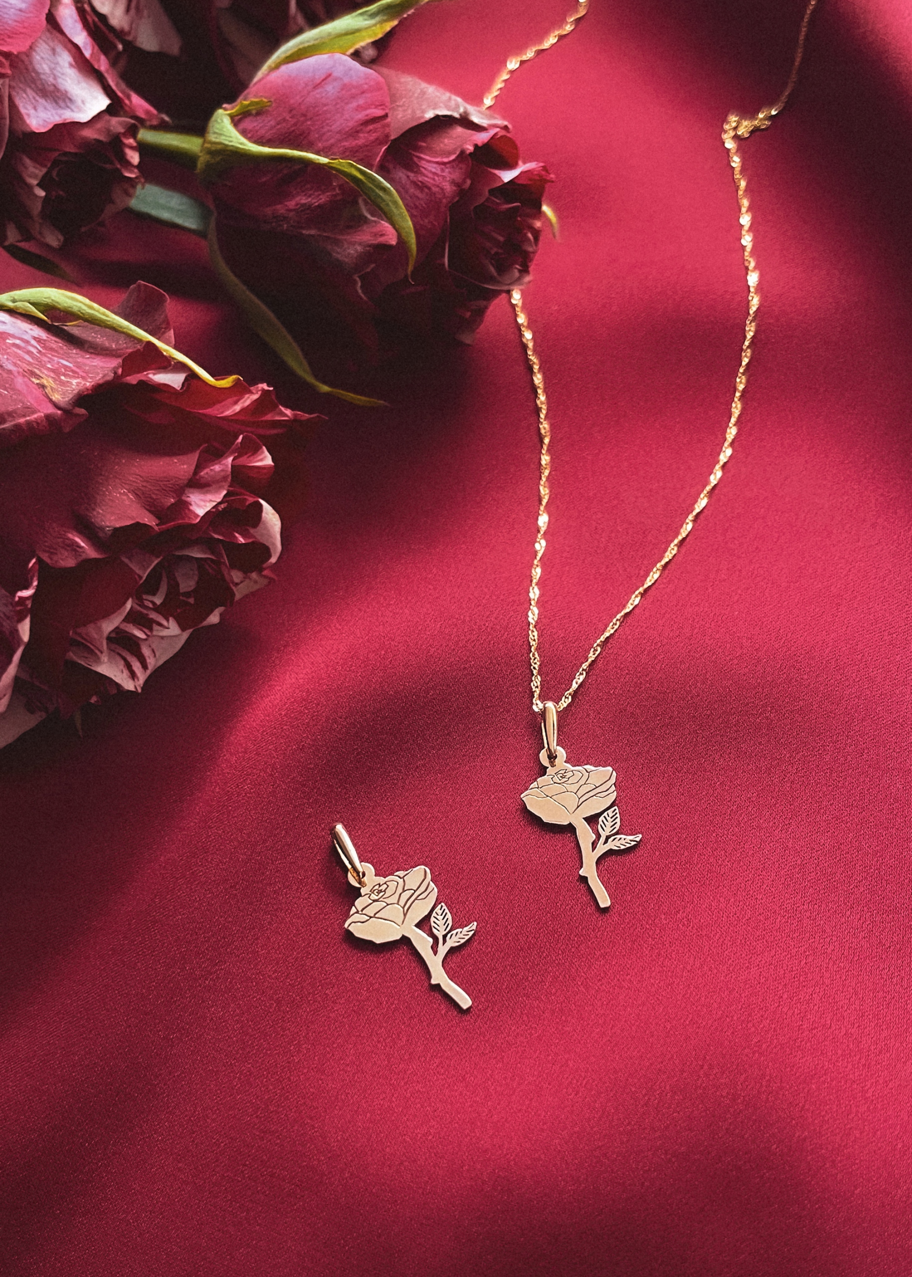 Красивый золотой кулон, полностью выполненный из желтого золота. Роза символизирует любовь, красоту и страсть, являясь в то же время символом тайны и нежности.