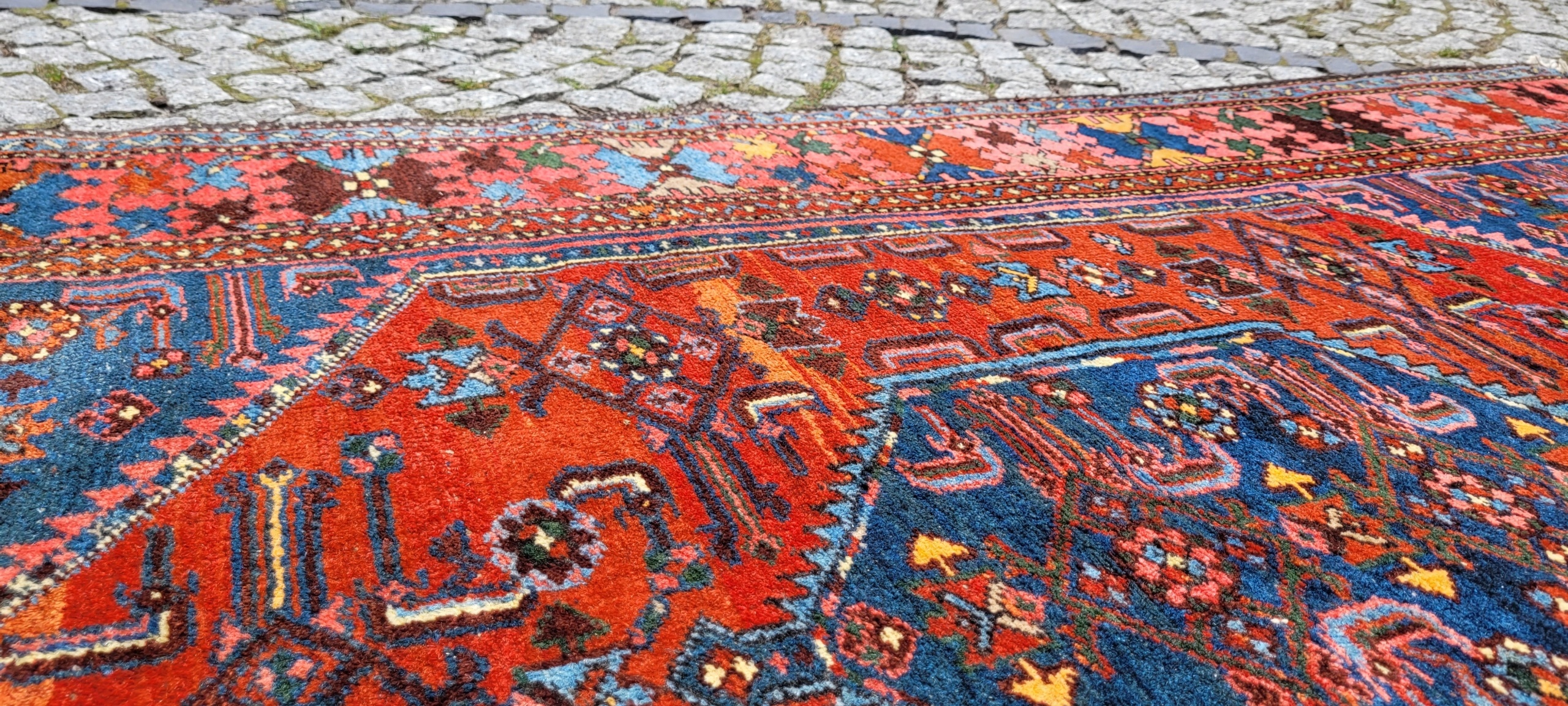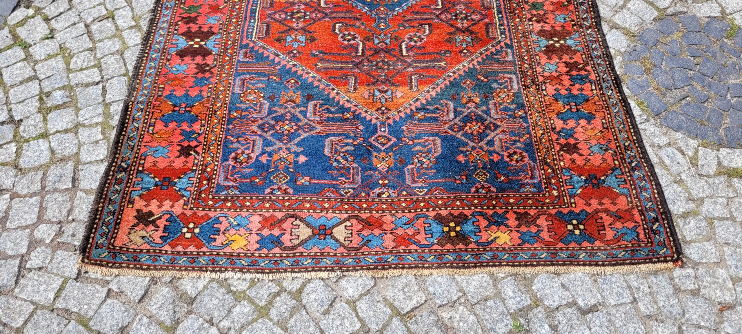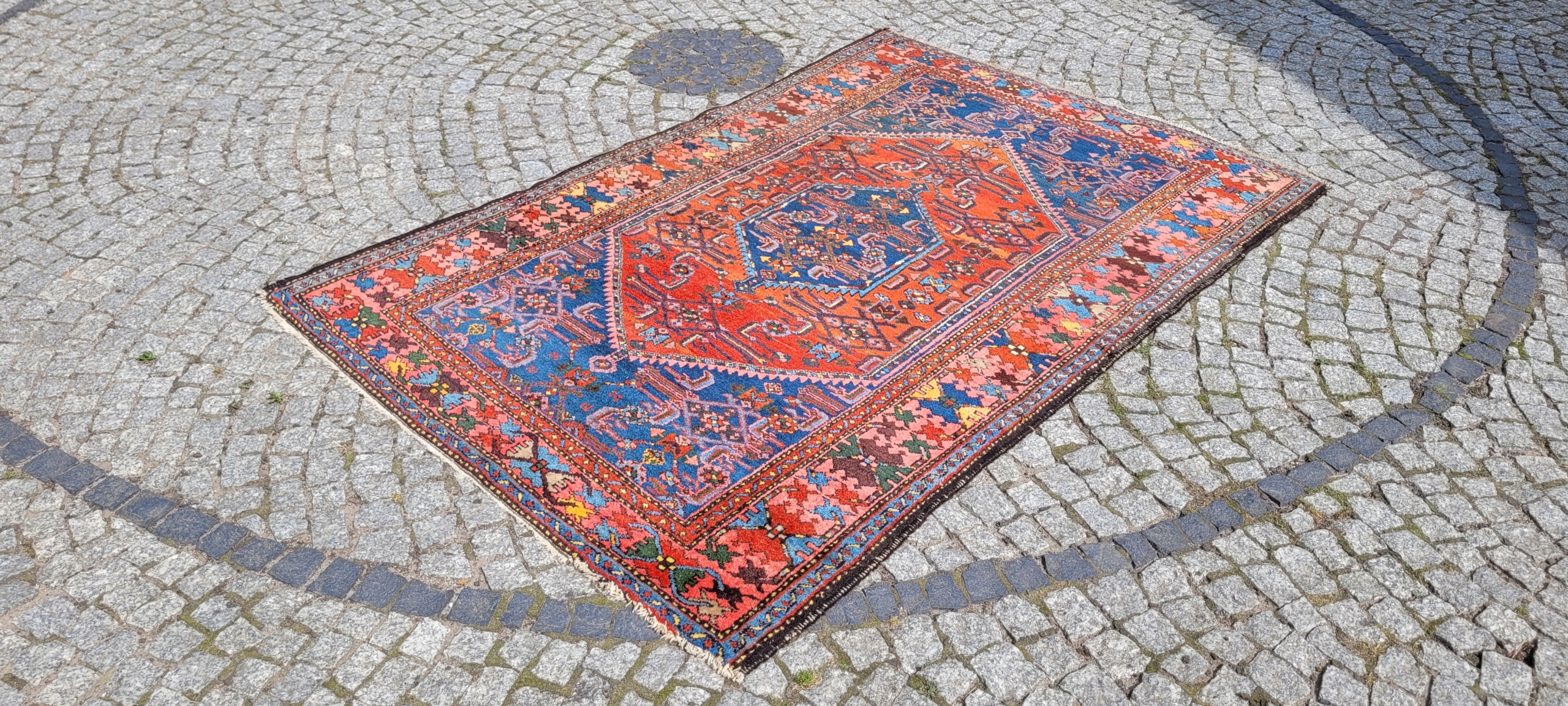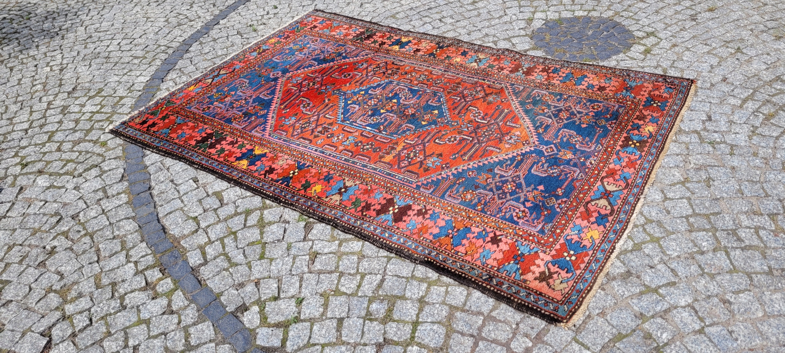 Персидский старинный ковер Зенджан. Он происходит из окрестностей города Хамадан. Сплетен вручную из шерсти. Для него характерен компактный, приятный на ощупь, блестящий флис, красивые цвета и узоры. Состояние хорошее, видно на фотографиях.