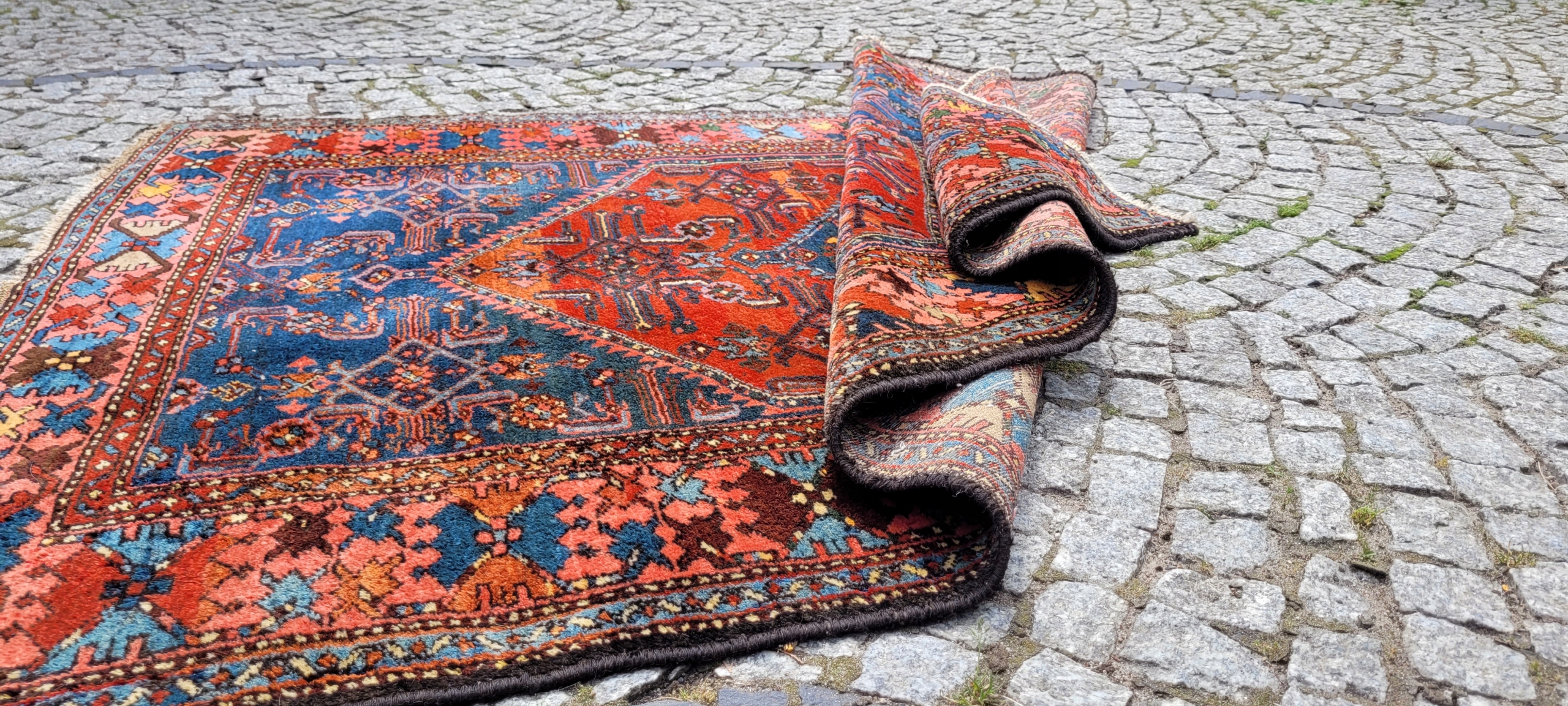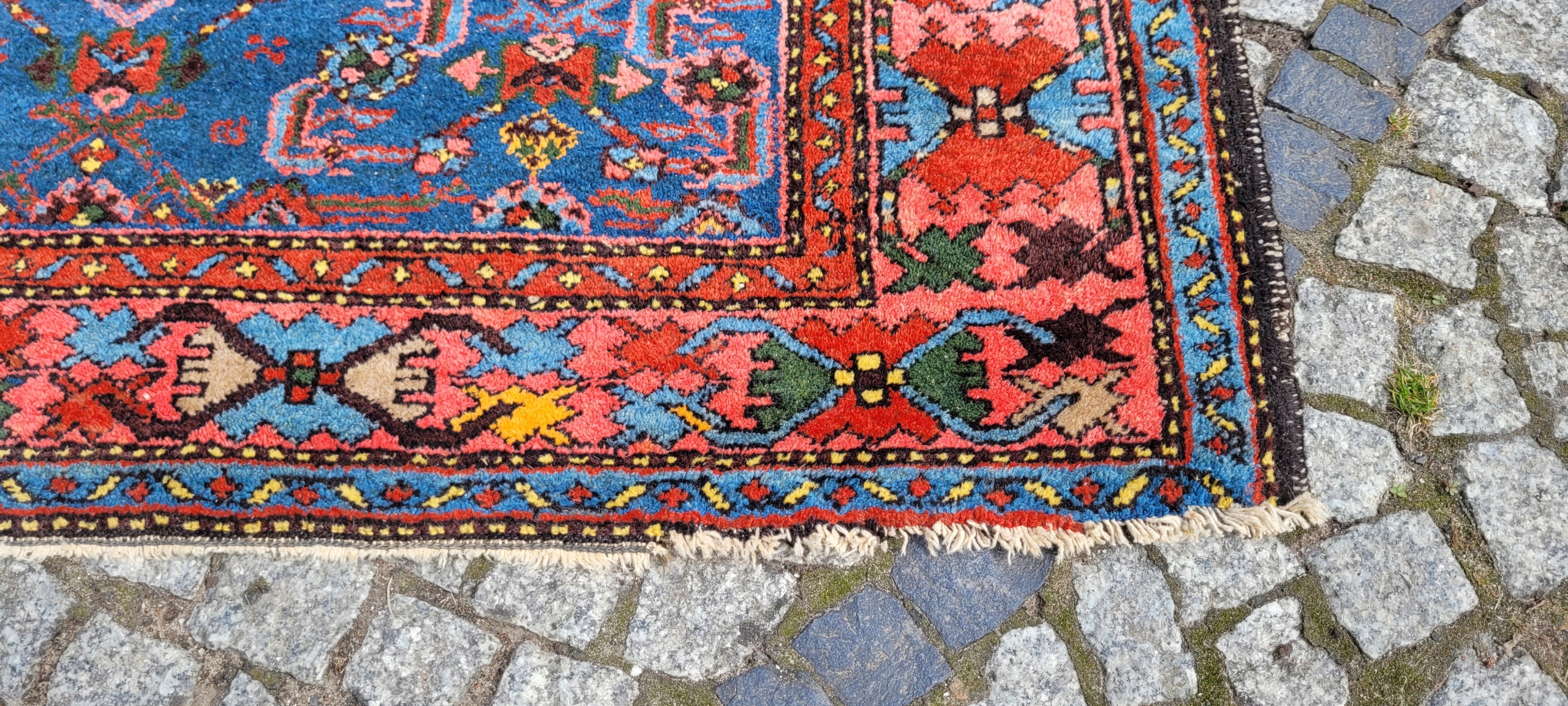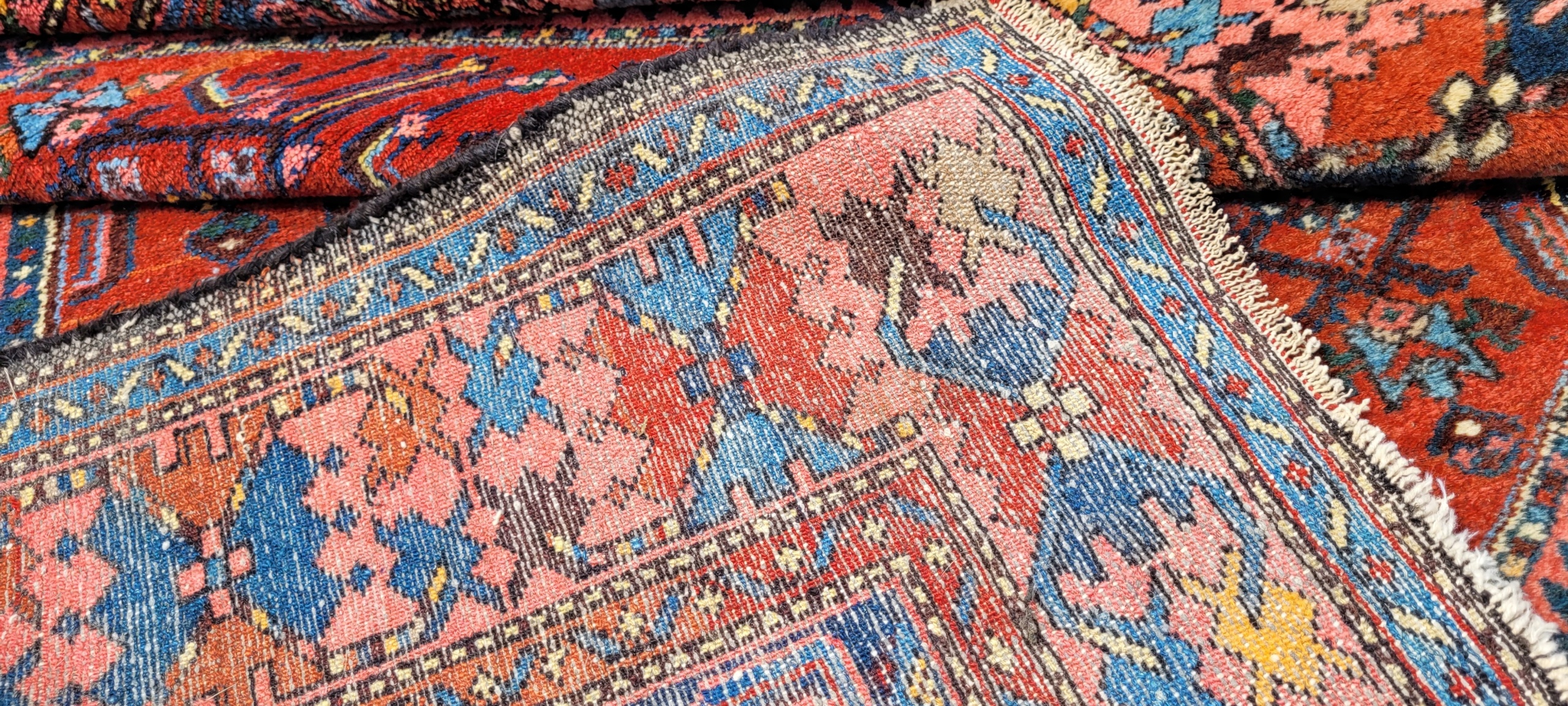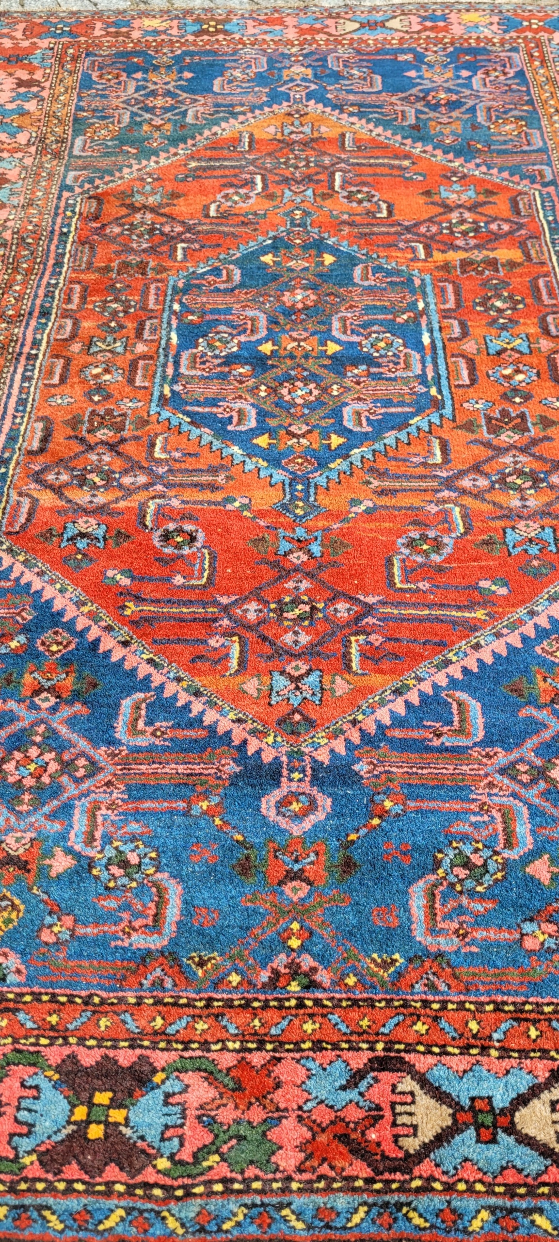 Персидский старинный ковер Зенджан. Он происходит из окрестностей города Хамадан. Сплетен вручную из шерсти. Для него характерен компактный, приятный на ощупь, блестящий флис, красивые цвета и узоры. Состояние хорошее, видно на фотографиях.