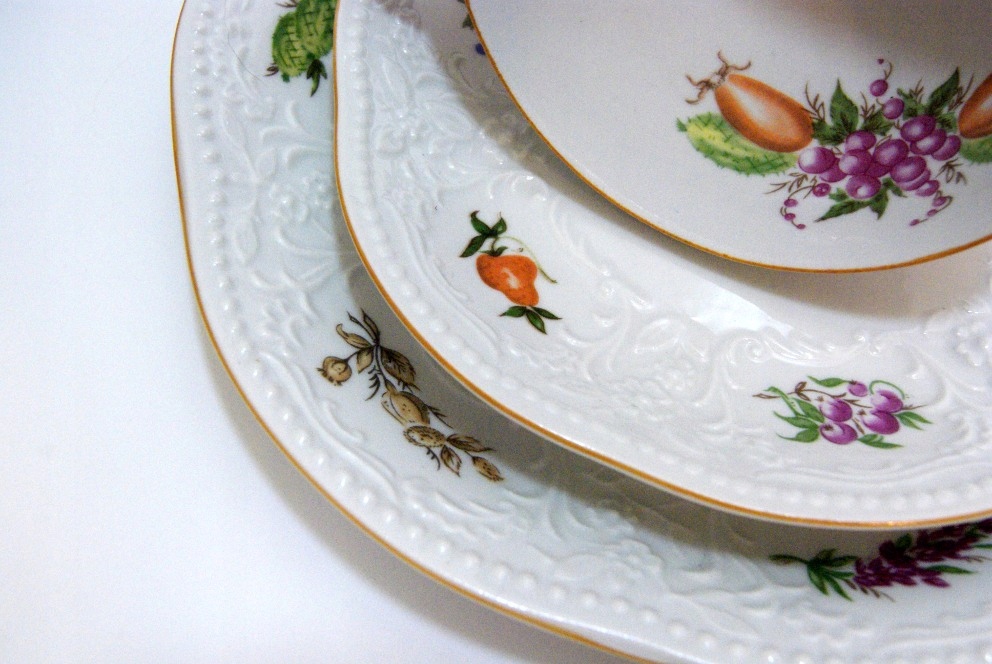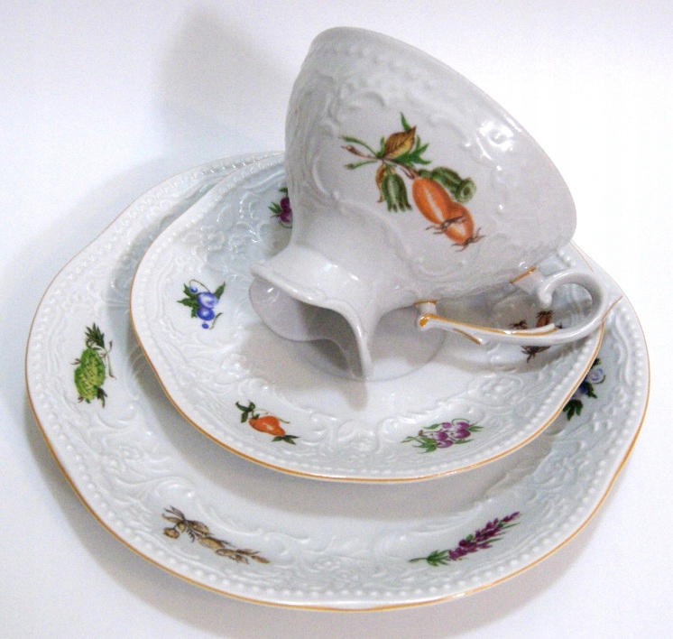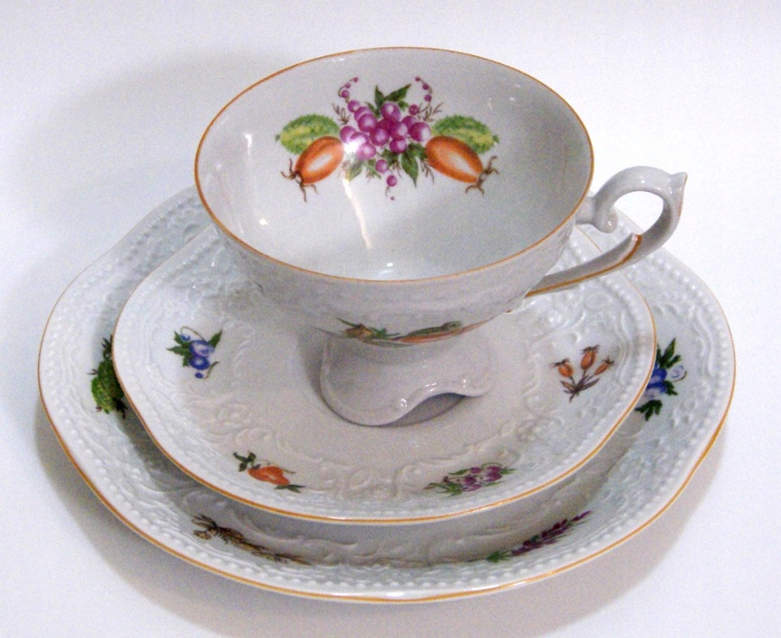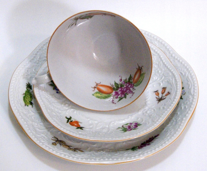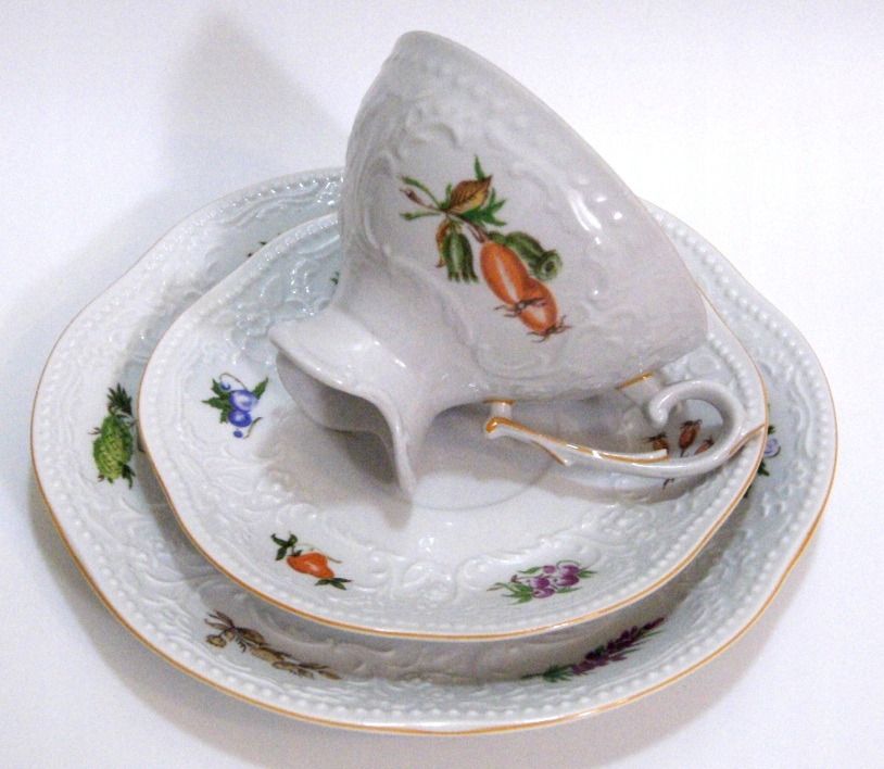 Предмет аукциона — красивый старинный сервиз для завтрака. Белый фарфор, украшенный фруктами и рельефами, красивый фарфор, чашка на ножке.