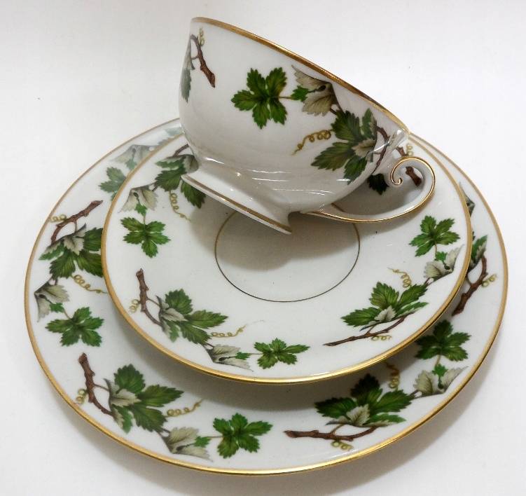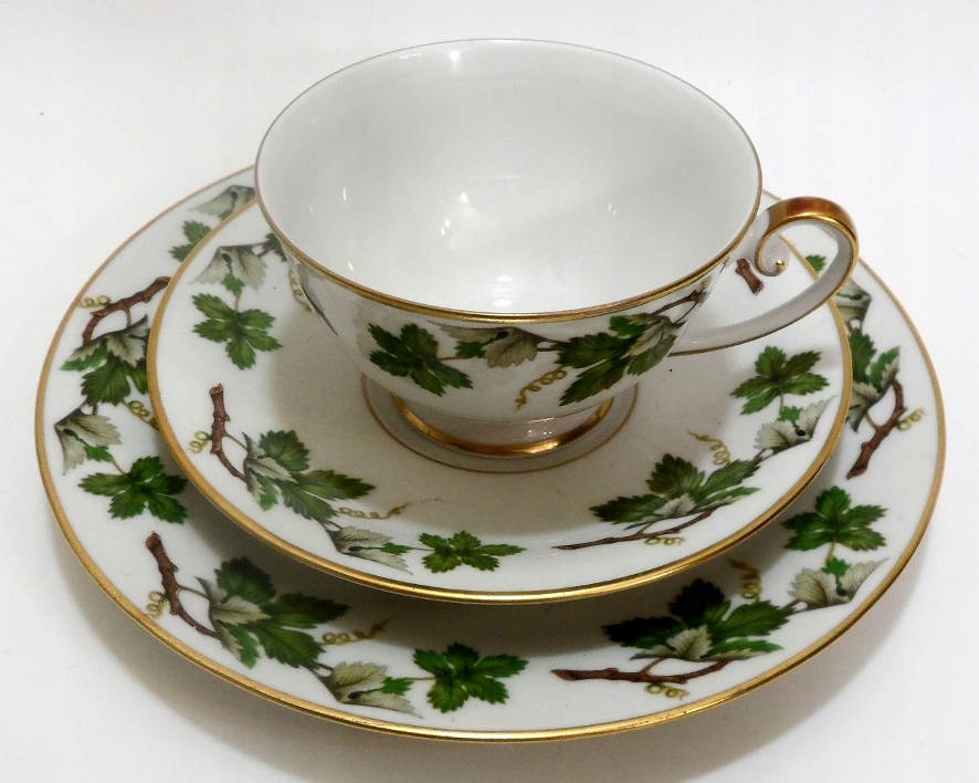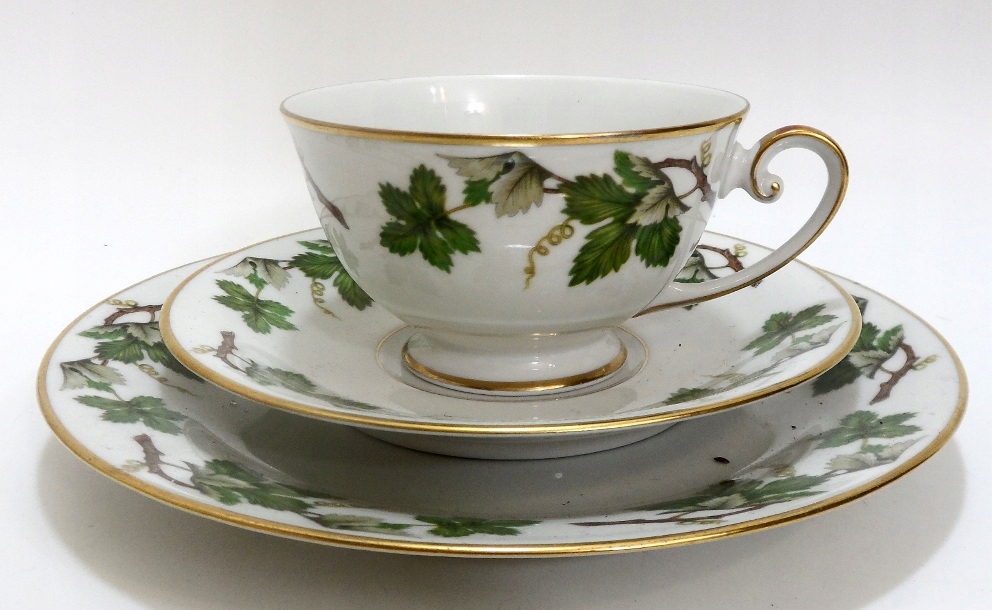 Предмет аукциона — красивый старинный сервиз для завтрака. Белый фарфор, украшенный ветками и позолотой. Hutschenreuther.