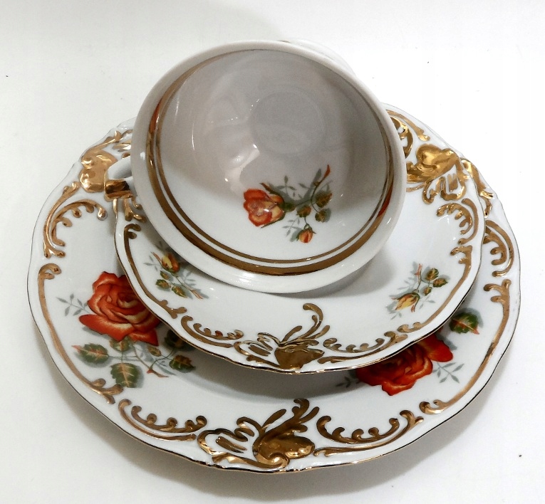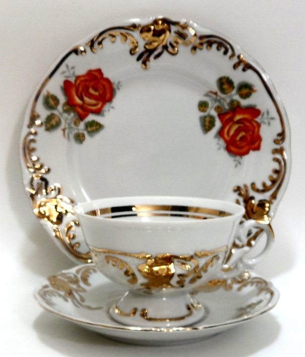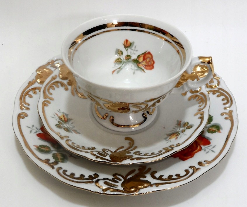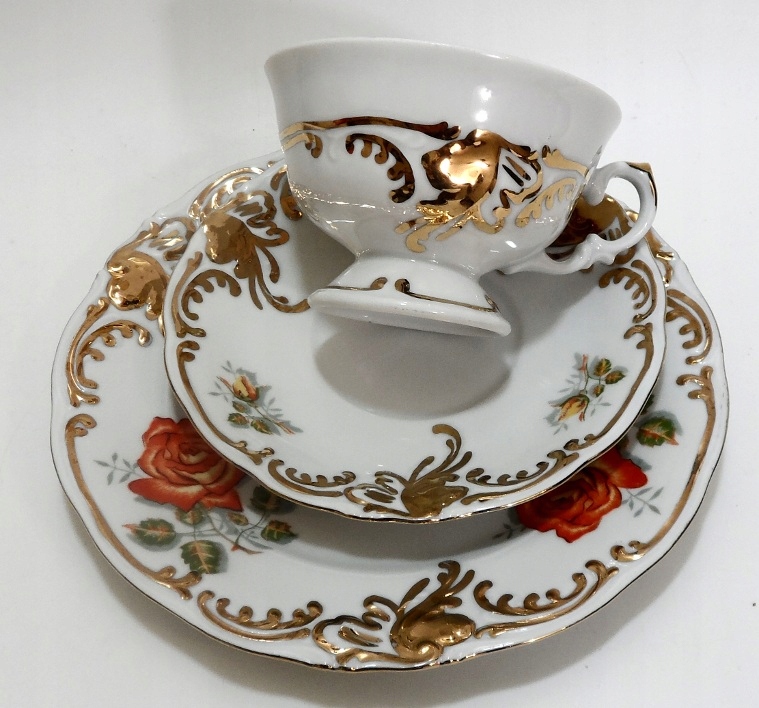 Предмет аукциона — красивый старинный сервиз для завтрака. Белый фарфор, украшенный розами, рельефом и позолотой.