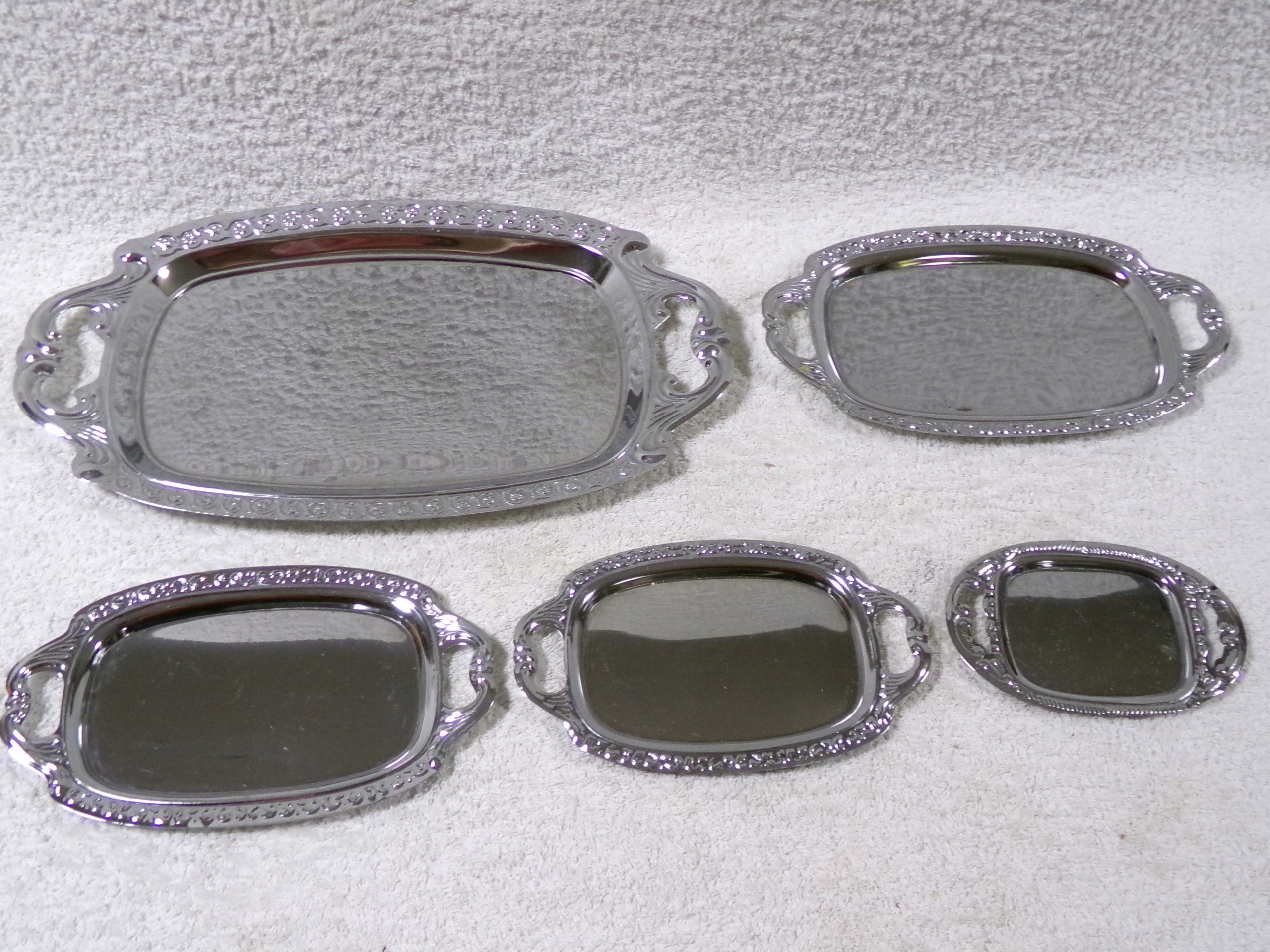Красивые подносы из хромированного металла, размеры от 12,5х8,5 до 33,5х19,5 см, вес 0,43 кг. В очень хорошем состоянии, без повреждений.